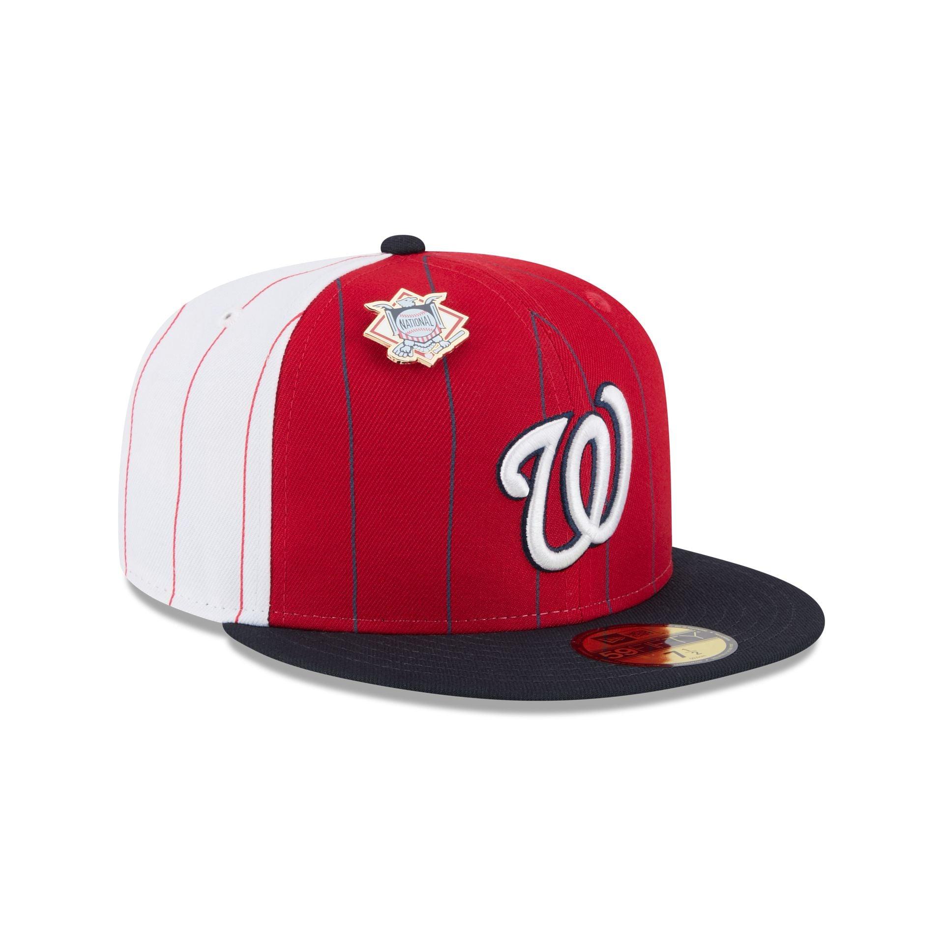 The Washington Nationals Pinstripe League Pin 59FIFTY Fitted Cap features an embroidered Nationals logo at the front panels with a League pin at the front right panel. Additional details include pinstripes, a matching MLB Batterman logo at the rear, and a gray undervisor.