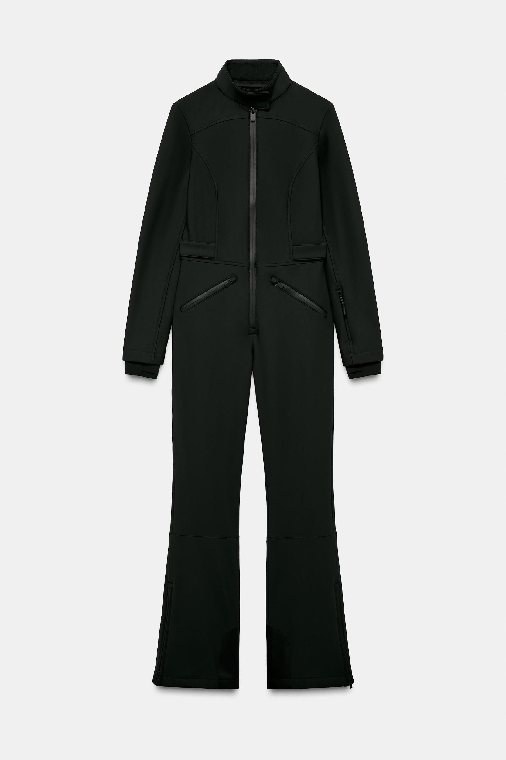 High collar lined with elastic ribbed interior. Long sleeves with a ski pass pocket and goggle cleaner, finished with thumbhole cuffs. Adjustable side tabs at the waist with snap buttons. Front pockets with zipper closure. Adjustable hem with zipper and an inner patch to prevent chafing. Rear hem longer than the front to accommodate ski boots. Elastic inner cuff with adhesive strip and snap buttons to secure footwear and prevent snow and cold from entering. Front closure with zipper and snap button.