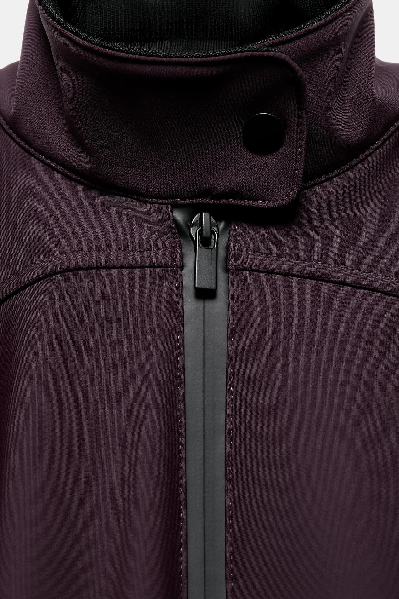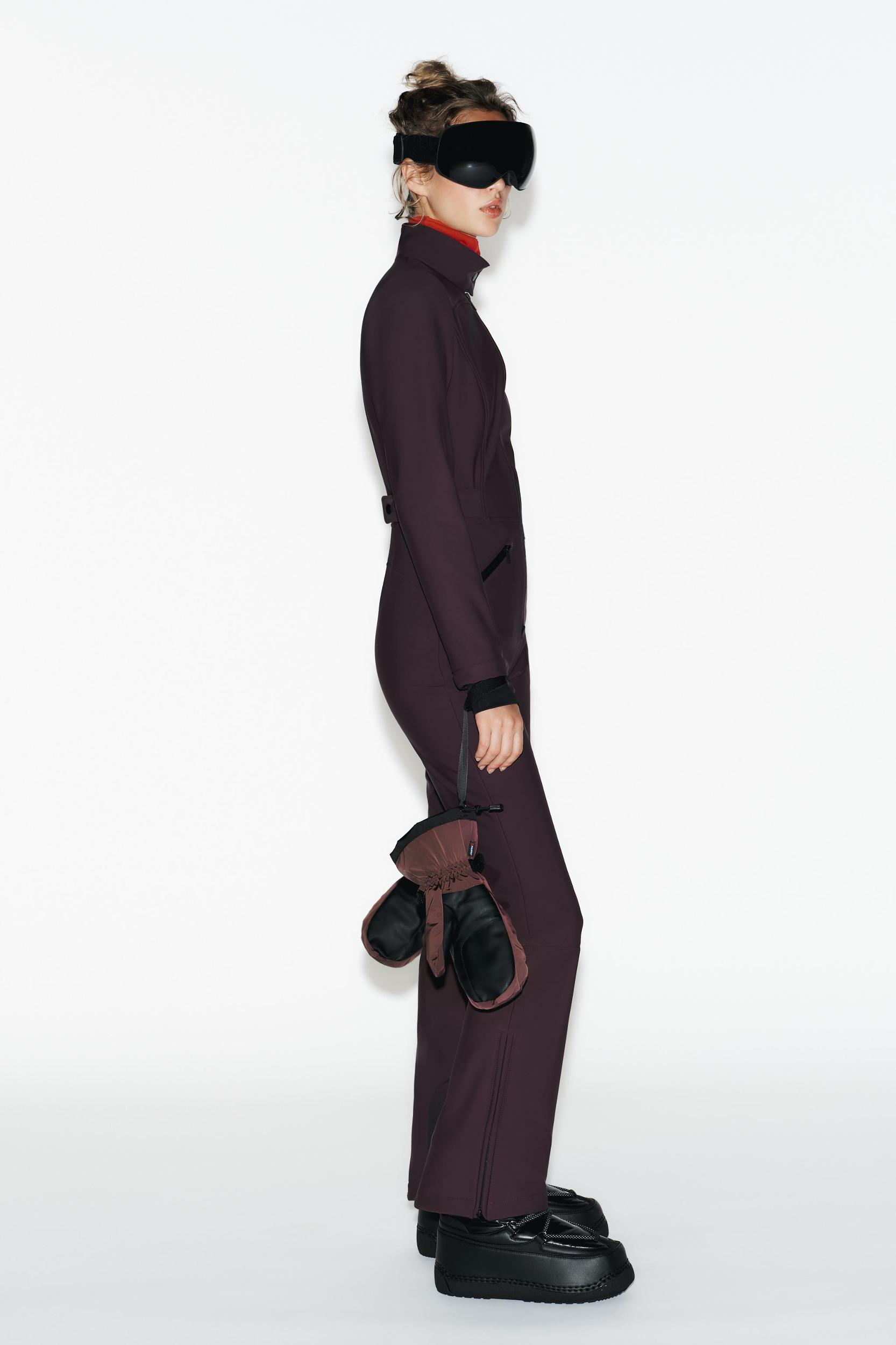 Raised collar lined with interior elastic ribbing. Long sleeves with a ski pass pocket and goggle cleaner, finished with cuffs with thumbholes. Adjustable side tabs at the waist with snap buttons. Front pockets with zipper closure. Adjustable hem with zipper and an inner patch to prevent chafing. The back hem is longer than the front to accommodate ski boots. Inner elastic cuff with an adhesive strap and snap buttons to secure footwear and prevent snow and cold from entering. Front closure with zipper and snap button.