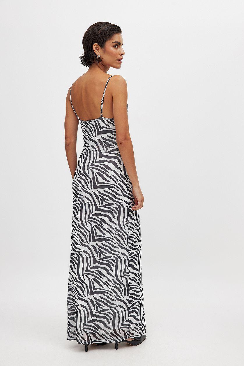 This maxi dress features a form fit and a mesh stretchy material. It has thin adjustable shoulder straps and a waterfall neckline. Our maxi dress has a lining.