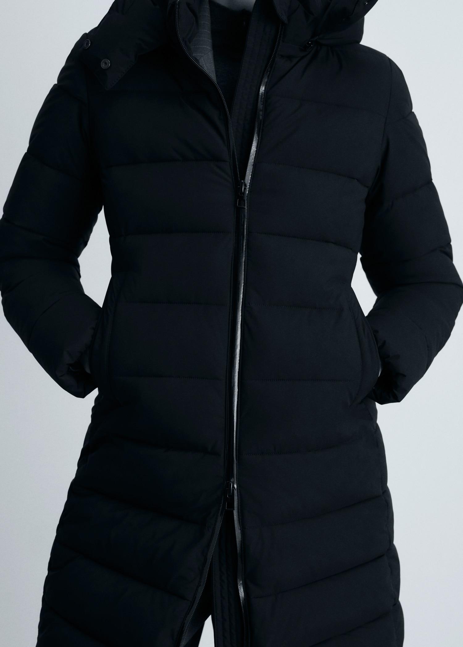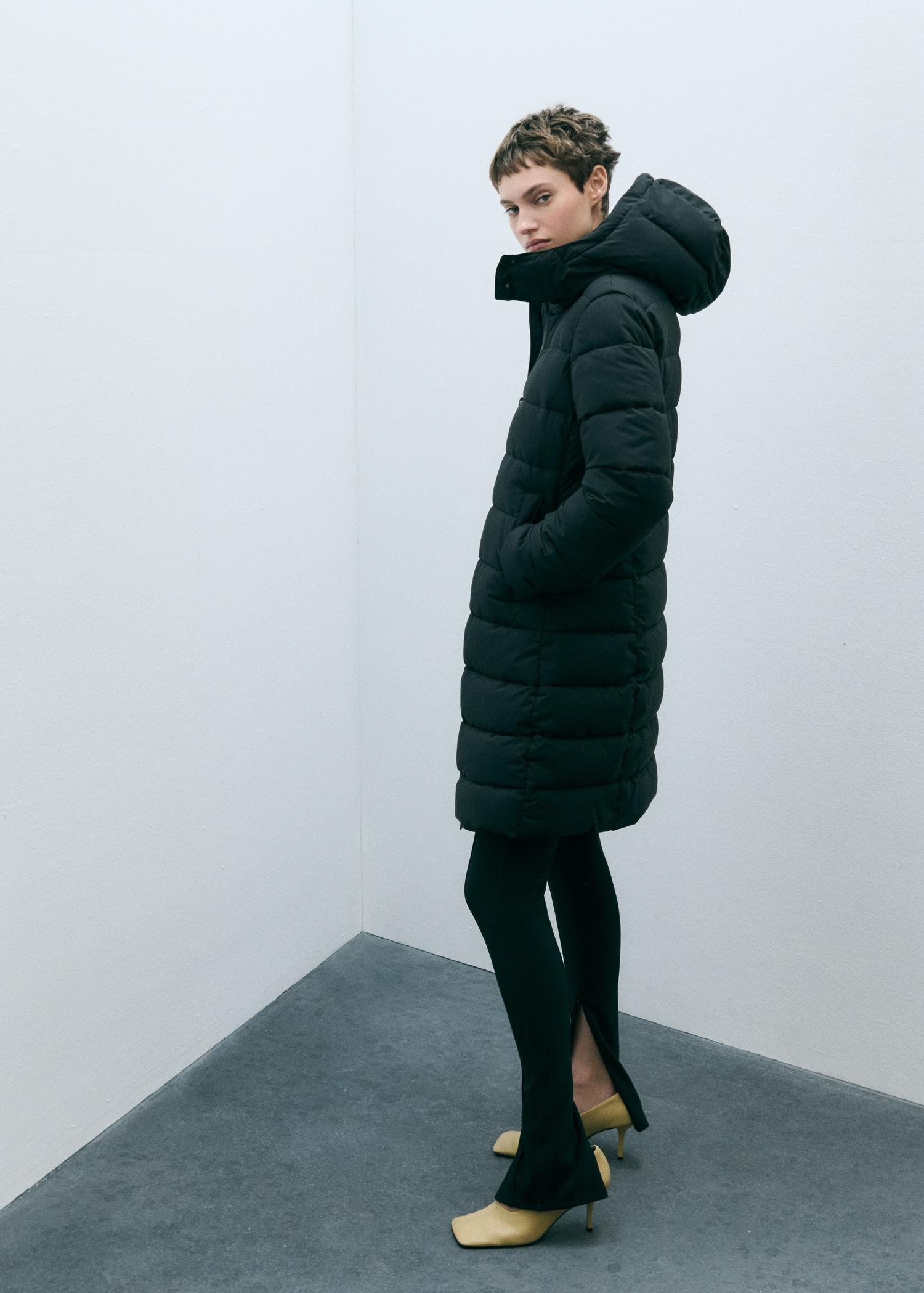 Nylon fabric. Quilted design. Straight Design. Medium design. Turtleneck. With hood. Long sleeve with elastic cuffs. Two side pockets. Front zipper closure. Inner lining. Water-repellent: The durable finish of this garment protects against light rain, repelling contact with water and raindrops. The model is 1.79 tall and is wearing a size 36. Available Plus. Side length 29.37 in. Back length 39.41 in