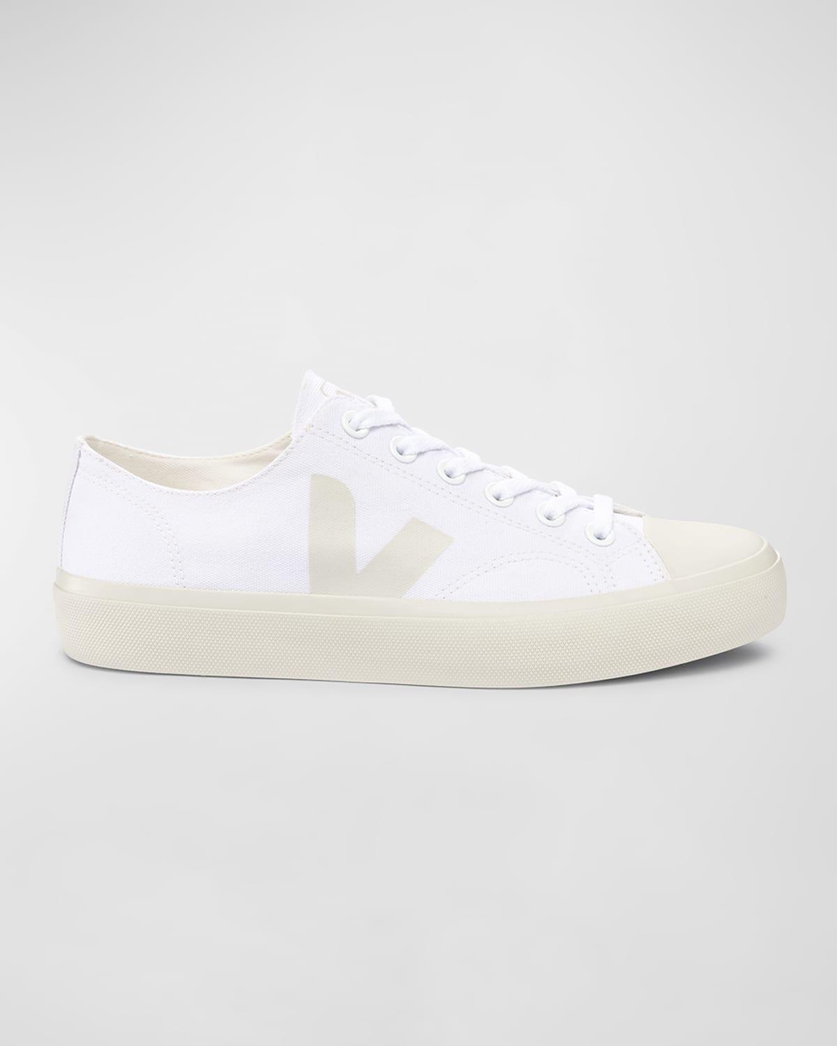 VEJA Watta low-top sneakers in two-tone organic cotton and recycled polyester. Flat heel. Round toe. Lace-up vamp. Signature contrastV logo at side. Cushioned footbed. Rubber sole. Item runs large, consider ordering a size down Made in Brazil.