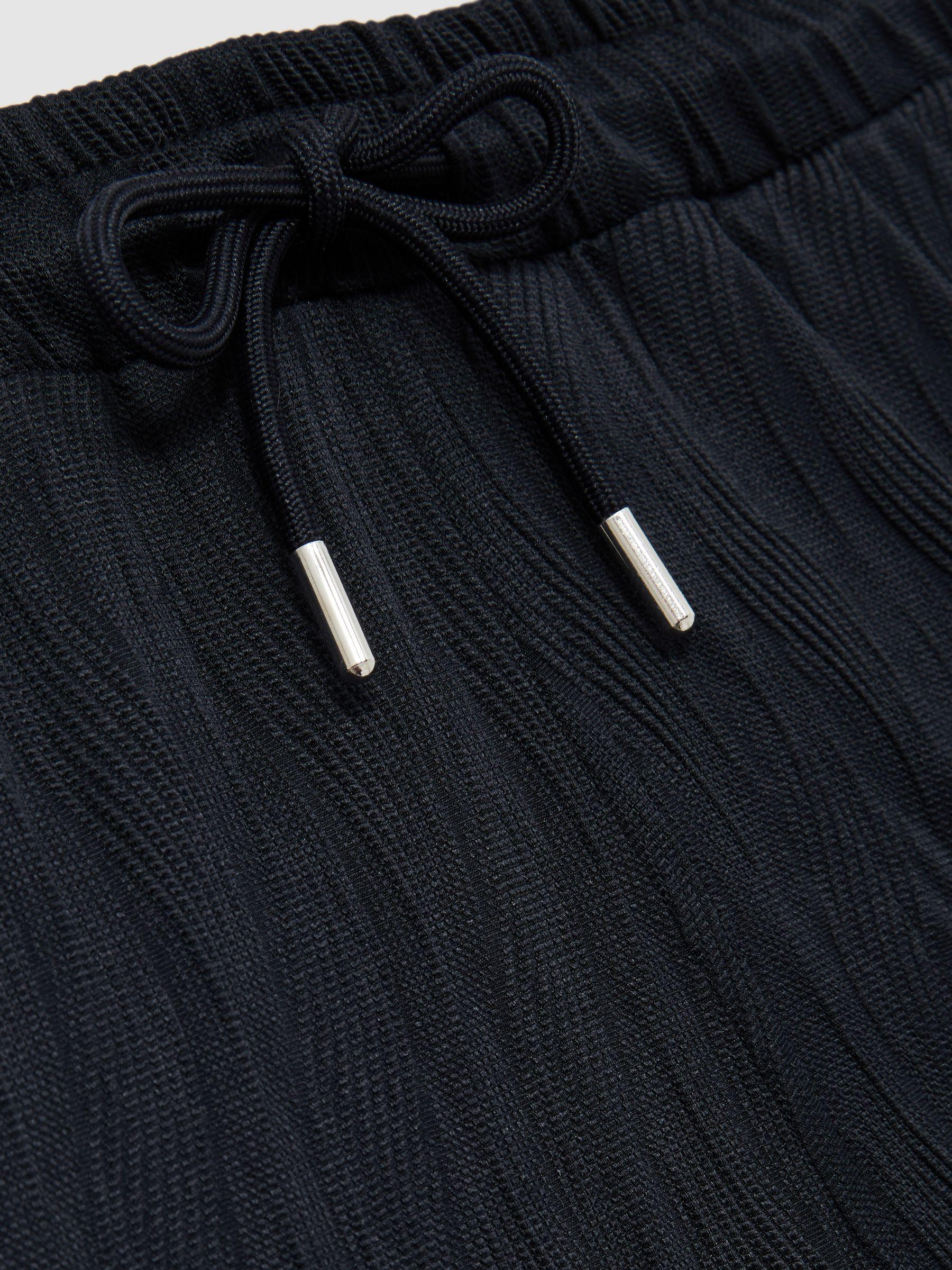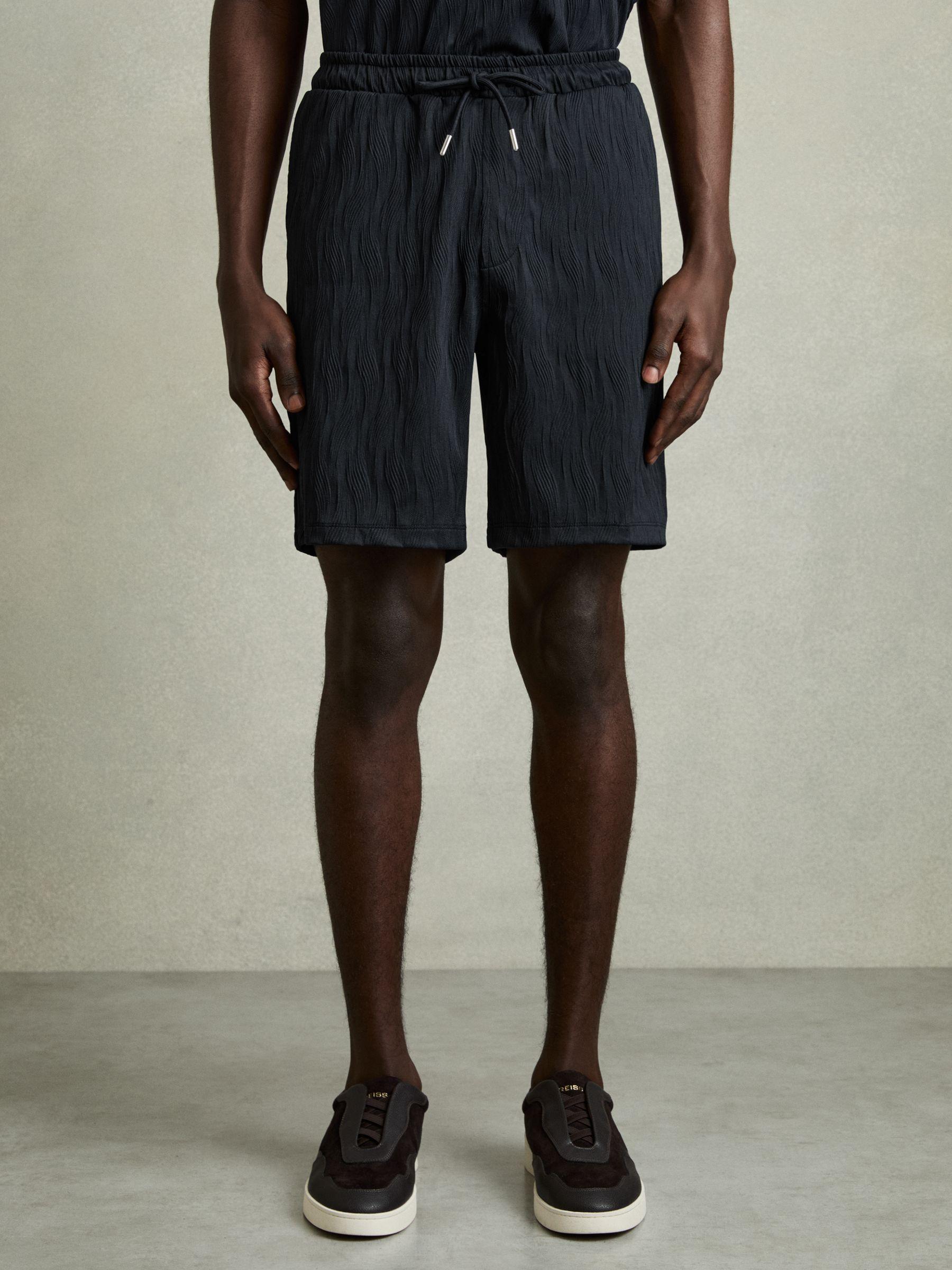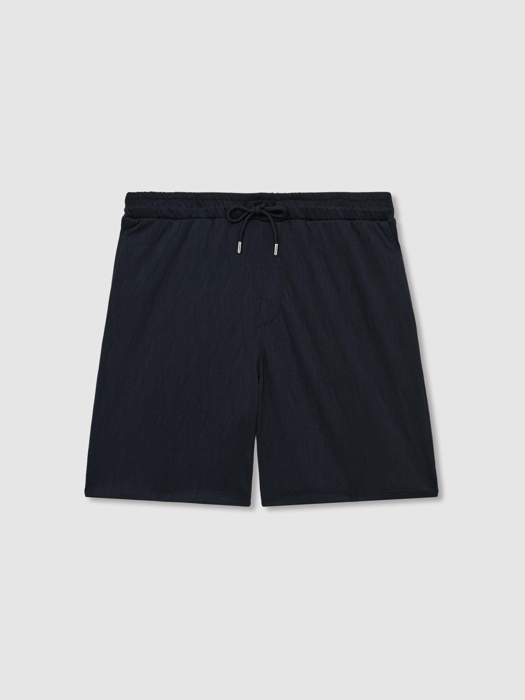 A textured wave jacquard brings tactile appeal to the Alvar shorts, enhancing their modern design. The elasticated waistband with a drawstring enables easy adjustment and all-day comfort. Textured wave jacquard. Elasticated drawstring waist. Side slip pockets.