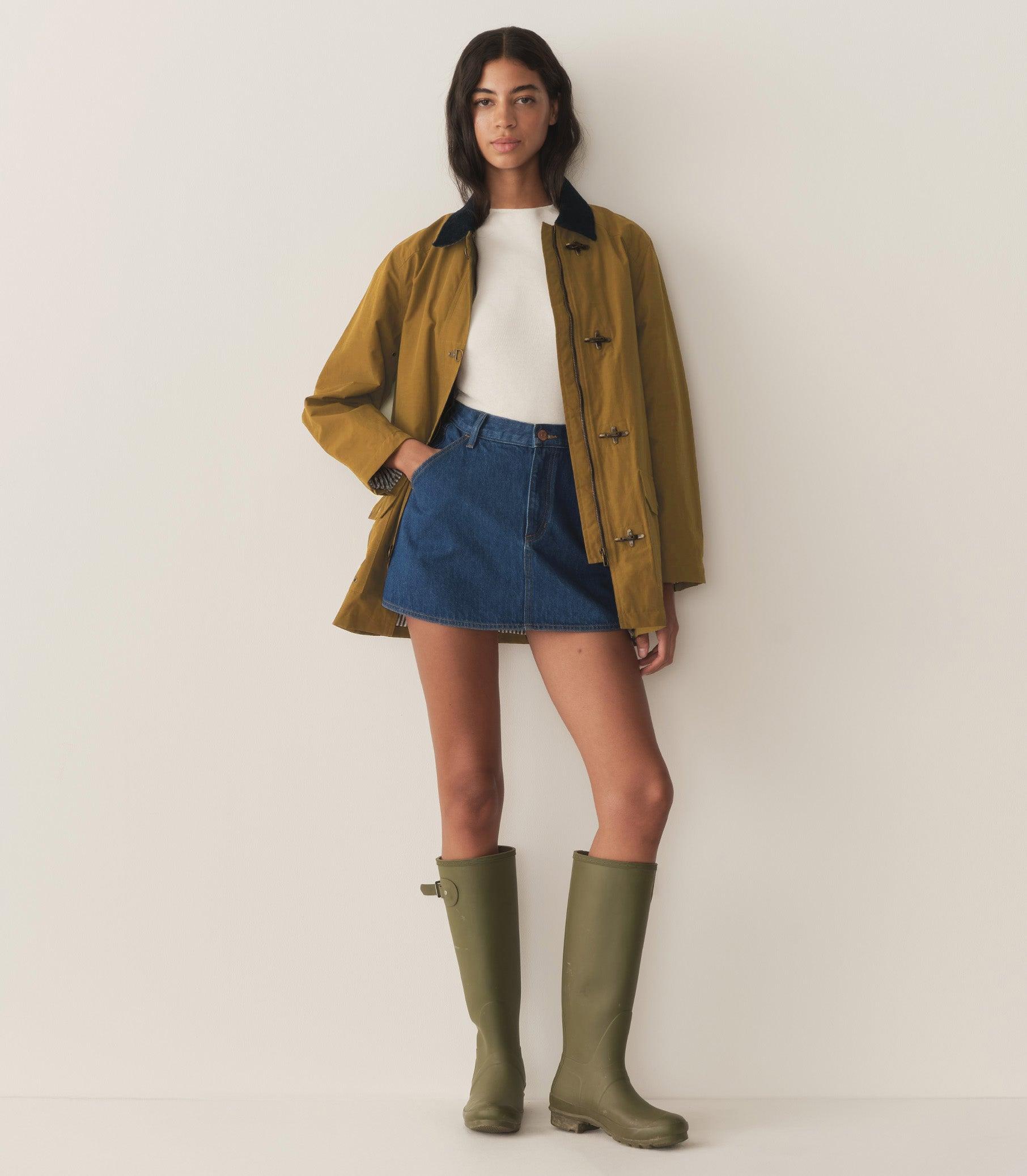 For Spring, we’re excited to introduce the Waverley Raincoat, a sturdy layer with a slightly slouchy fit. Crafted from a water-repellant, waxed cotton-nylon blend and fully lined with viscose twill, it’s detailed with a navy corduroy collar. Four antique-inspired brass clasps and a hidden zipper fasten at the front. For added utility, there are two front patch pockets and three interior pockets, plus brass snap buttons at the front pockets and cuffs.