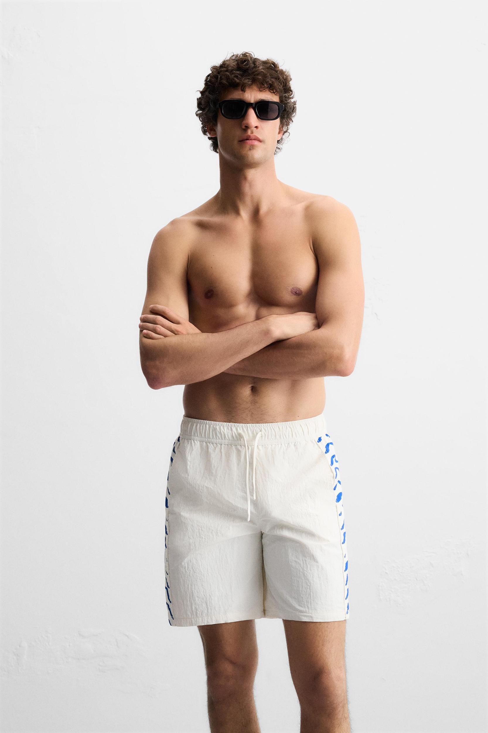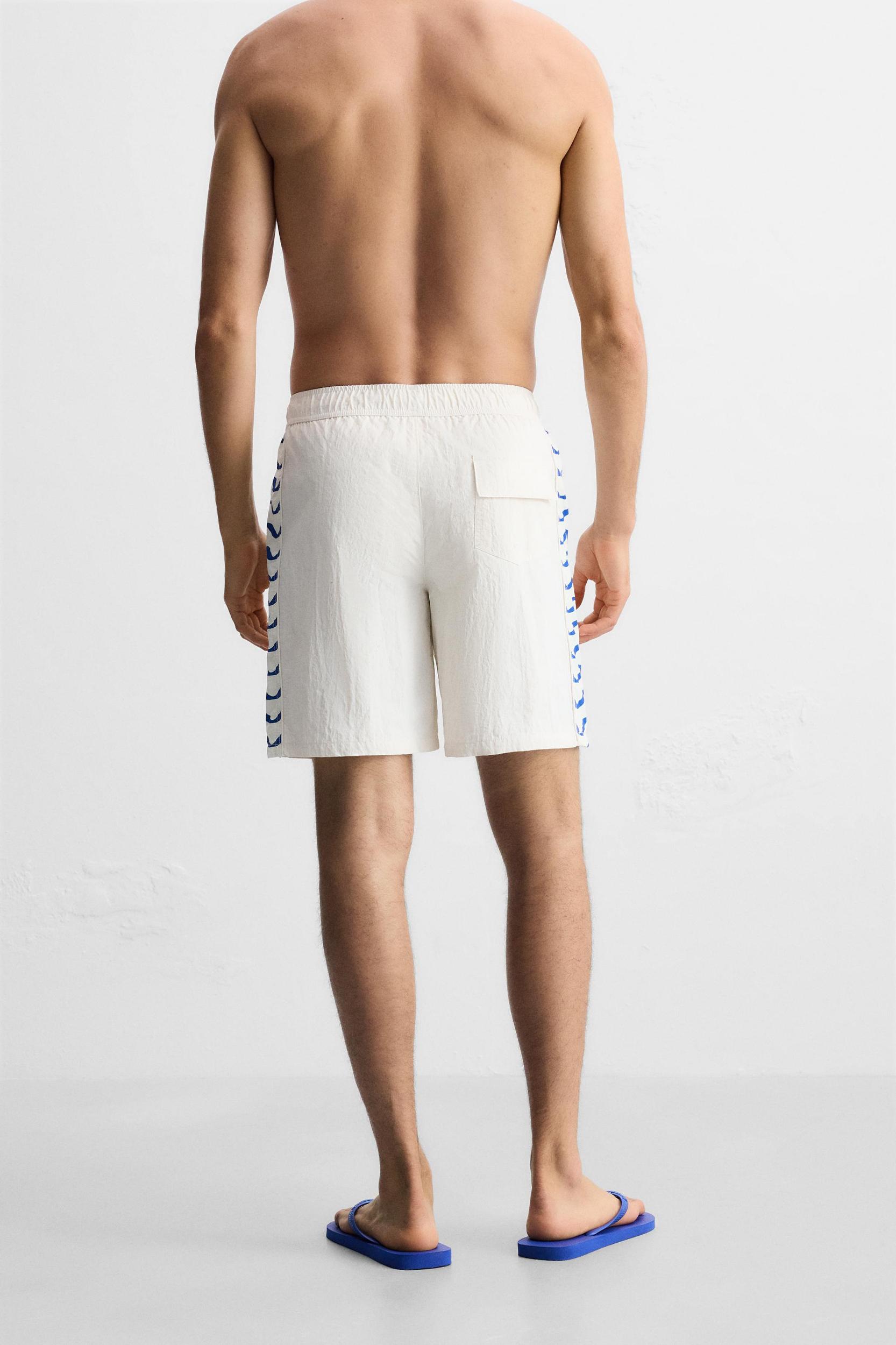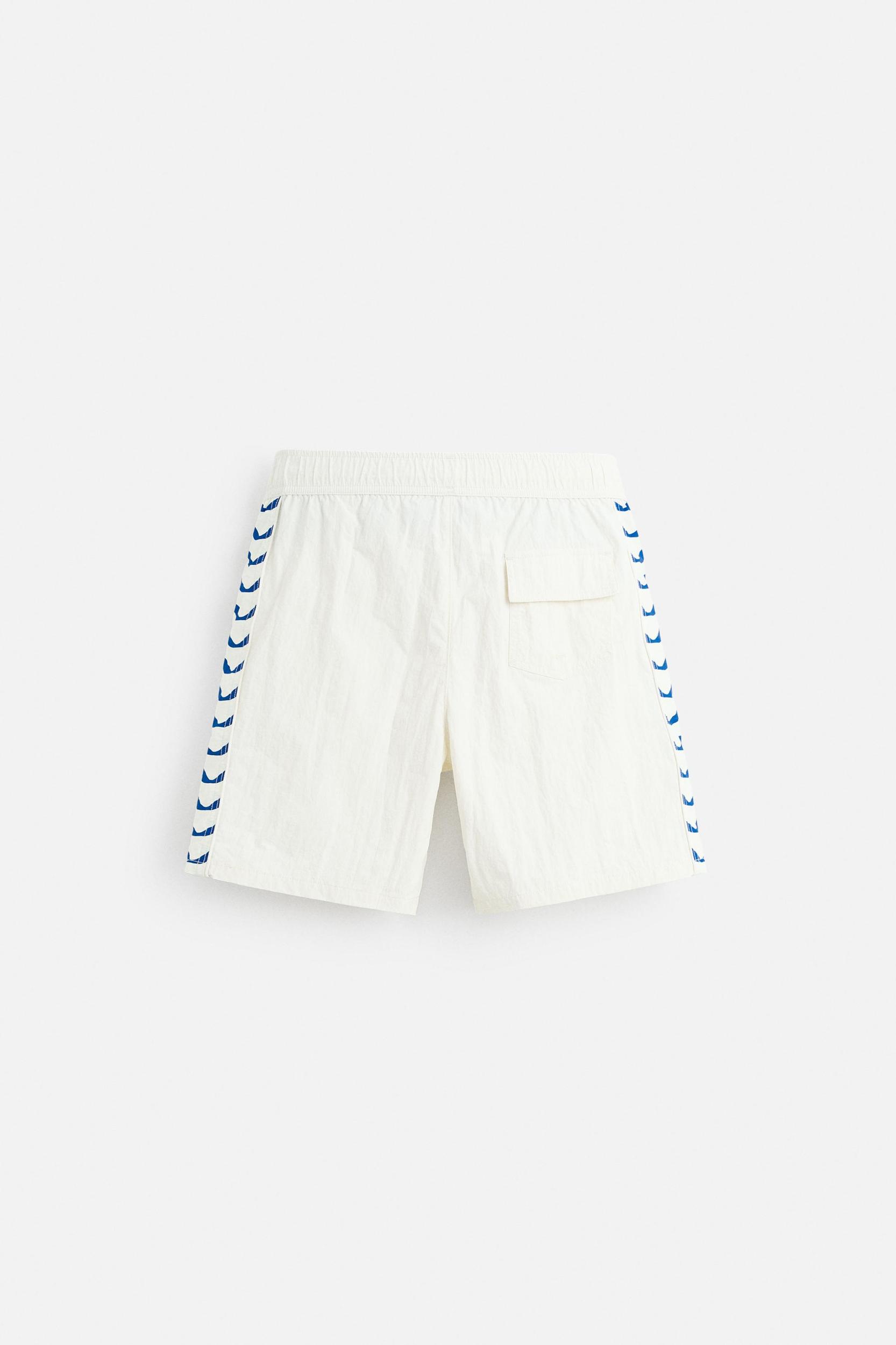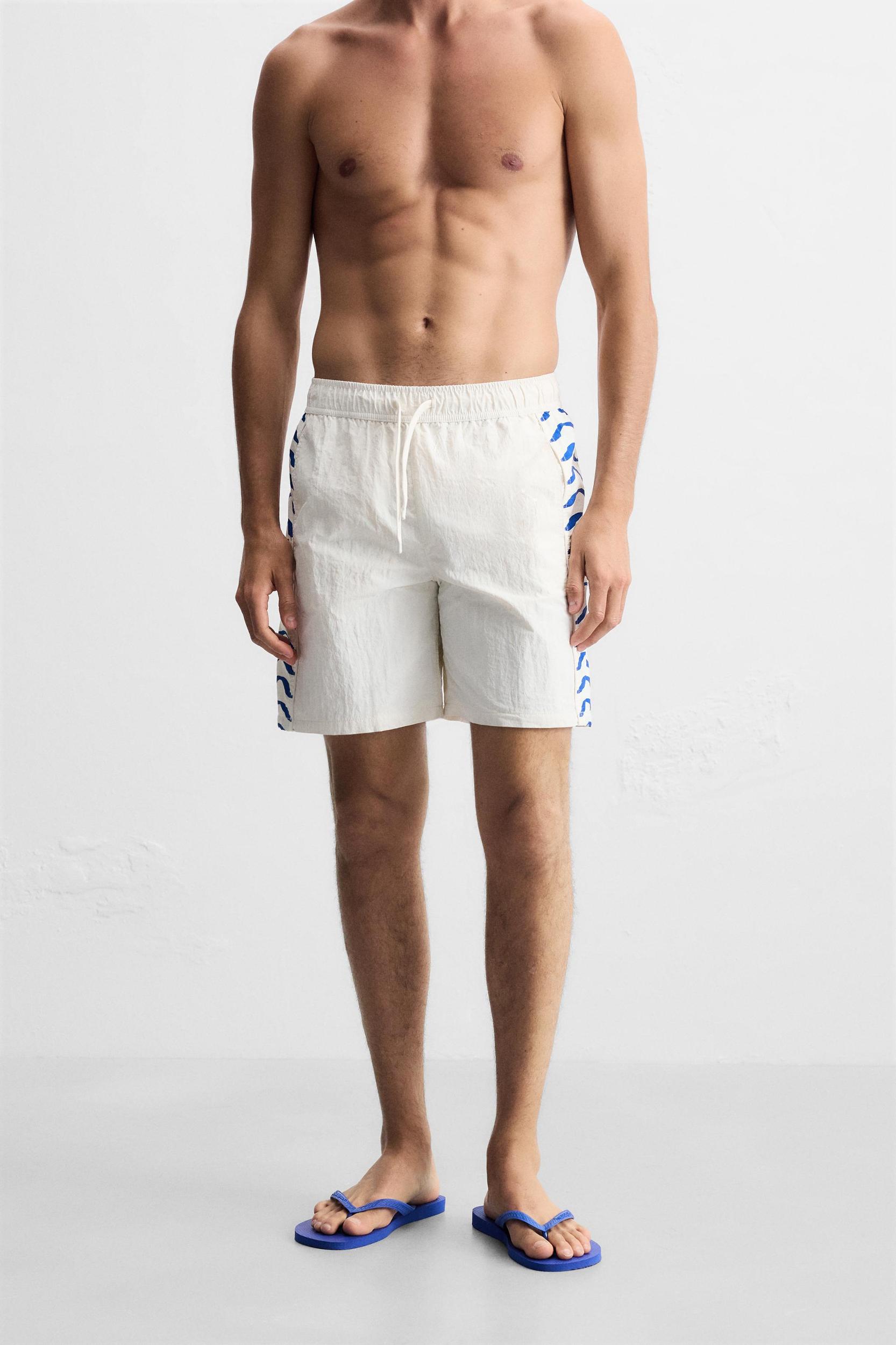 Swimsuit made in technical fabric. Adjustable elastic waistband with drawstring. Front pockets and back patch pocket detail with flap. Contrasting combined side bands. Inner lining. Inseam: 7.5 inches (19 cm) Outseam: 17.7 inches (45 cm)