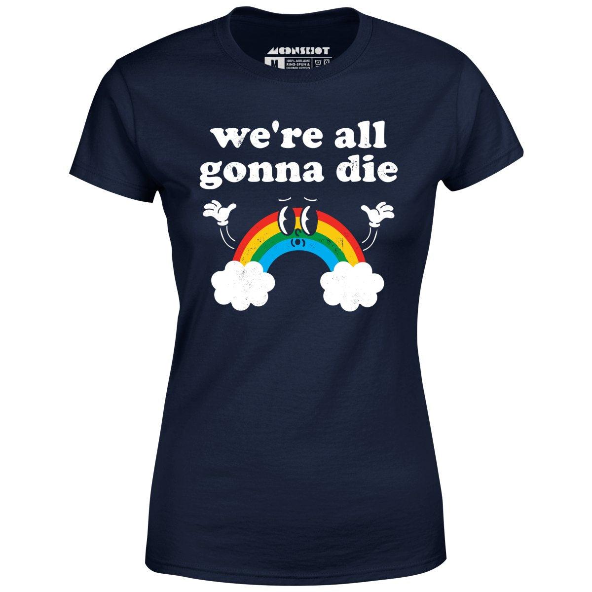 Brighten up the inevitable with this funny design that says "We're All Gonna Die" under a cheerful rainbow. Perfect for those with a dark sense of humor and a love for ironic optimism, this design brings the laughs while keeping it real. Printed on our super soft 100% ringspun & combed cotton women's T-Shirt. Or upgrade to our Luxury 52/48 cotton/poly vintage heather edition for an even softer classic look. We print & ship all of our high quality graphic tees in the USA.