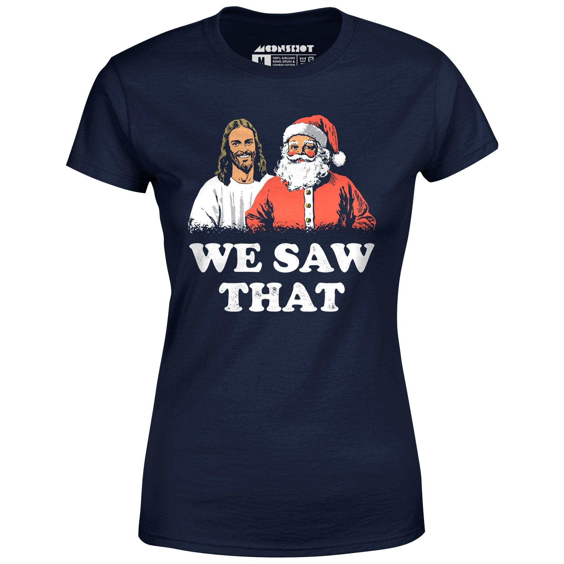 Stay on your best behavior with the 'We Saw That' design! Featuring Jesus and Santa standing side by side, smiling as they watch over the holiday season, this funny Christmas design is perfect for spreading festive joy and reminding everyone that they're always being watched—naughty or nice! Printed on our super soft 100% ringspun & combed cotton women's T-Shirt. Or upgrade to our Luxury 52/48 cotton/poly vintage heather edition for an even softer classic look. We print & ship all of our high quality graphic tees in the USA.