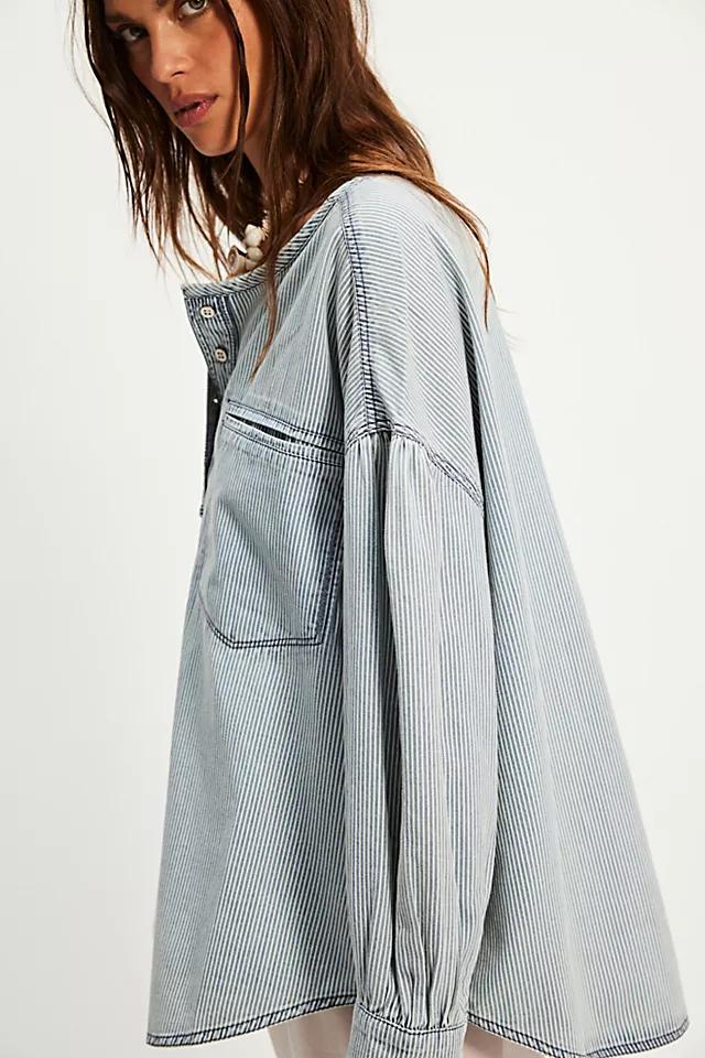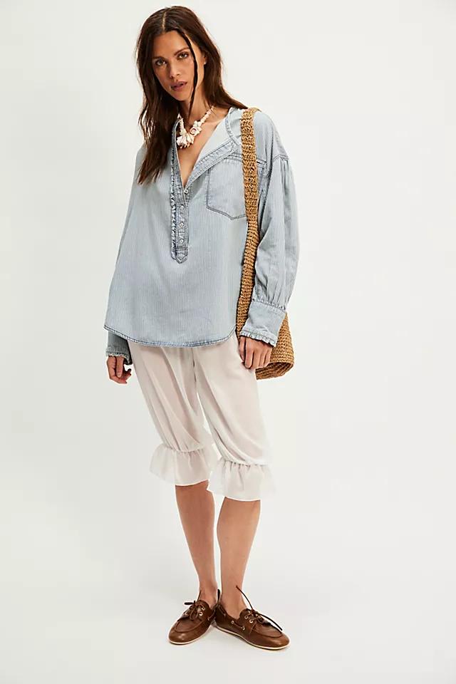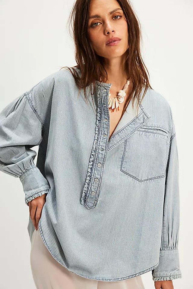 This oversized denim pullover from We The Free is featured in a breezy, blousey silhouette with an elongated henley neckline and puffy drop-shoulder sleeves, finished with ruffle-trimmed accents for a darling detail.