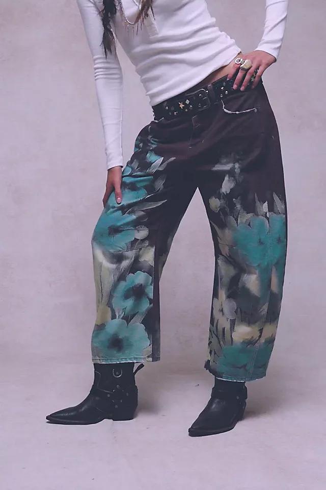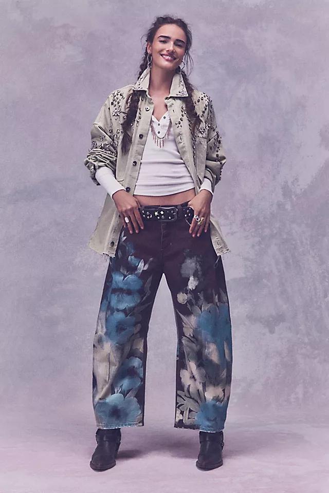 Our most-loved barrel jeans from our We The Free collection, now featured in a playful printed fabrication.