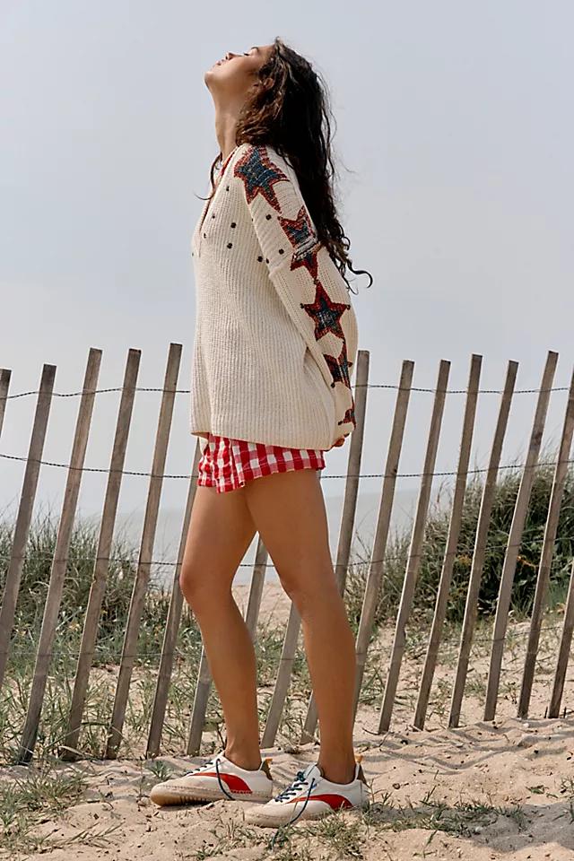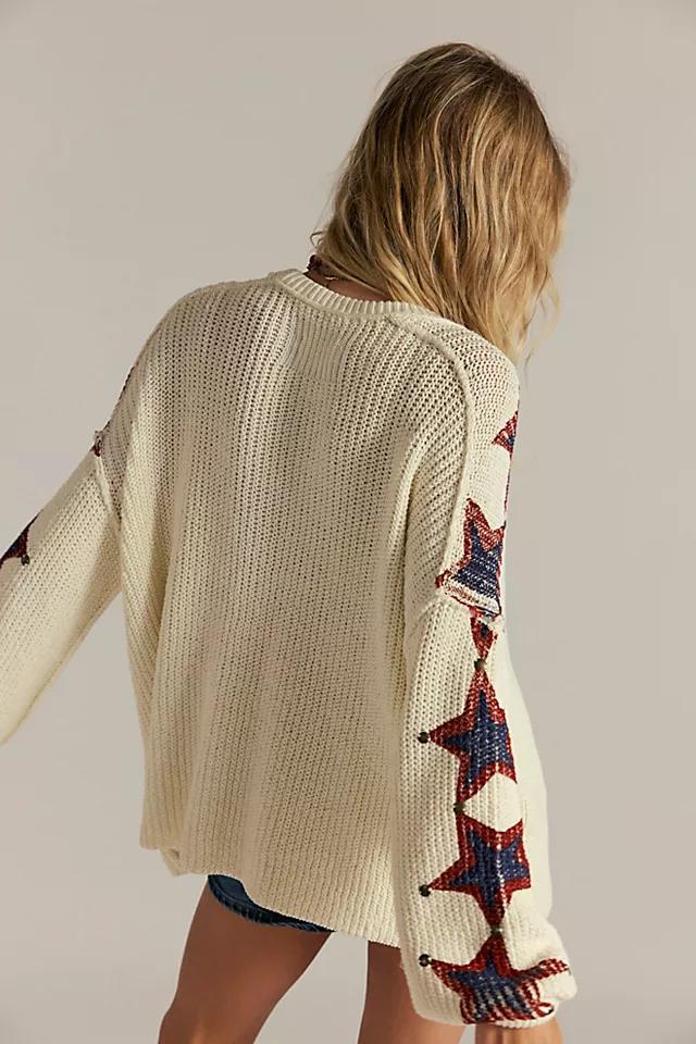 Long weekends call for this cozy pullover from We The Free, featured in an oversized style with a V-neckline and heritage sleeve graphics. * Chunky knit fabrication * Stud accents * Vintage finish on sleeve graphics * Dropped shoulders