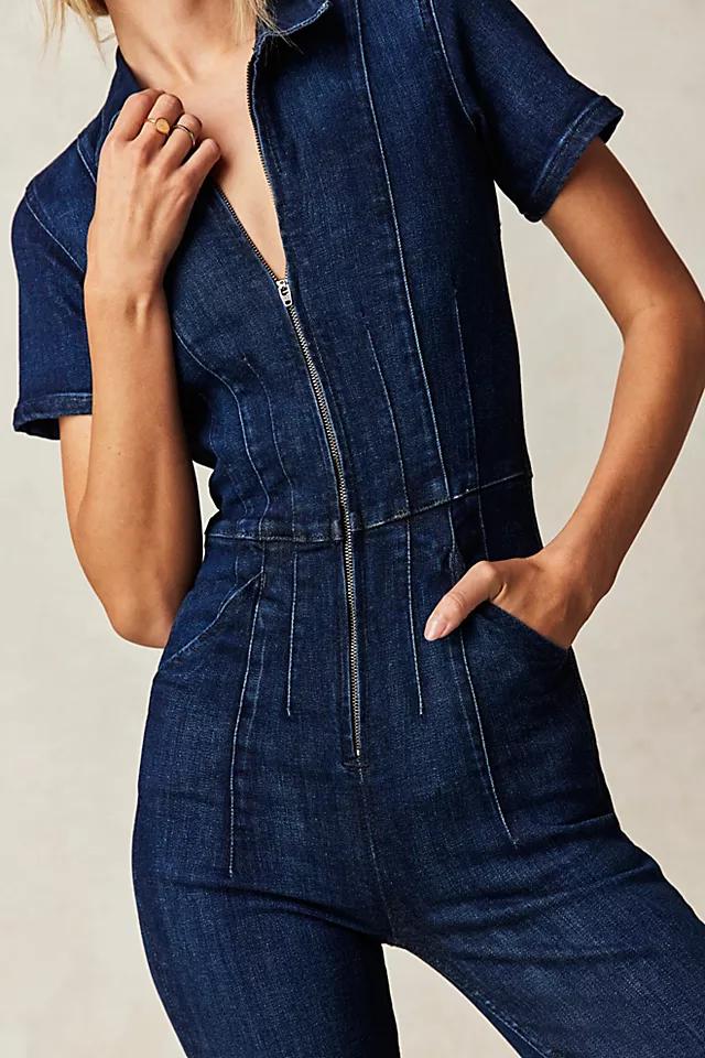 **Features:** Exaggerated yoking and darting throughout, zip-up closure, collared neckline, vintage-inspired denim wash, stretch denim