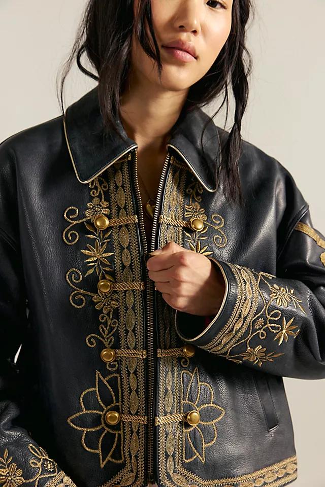 **Features:** Luxe leather fabrication, collared neckline, zipper closure, decorative button details with rope accents, intricate embroidery throughout, rounded hem at front, drop-shoulder sleeves, side pockets