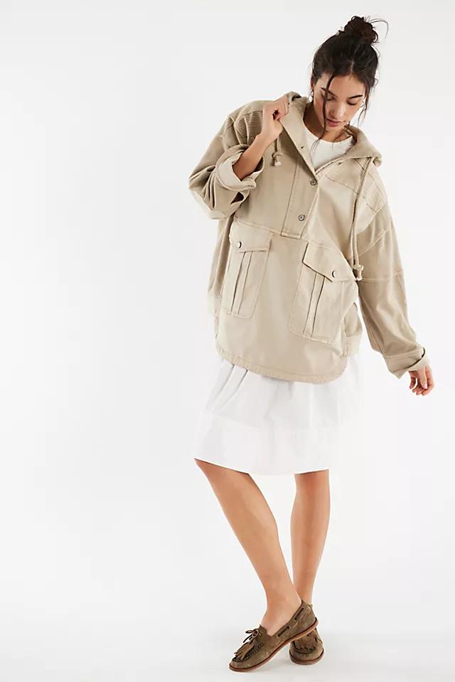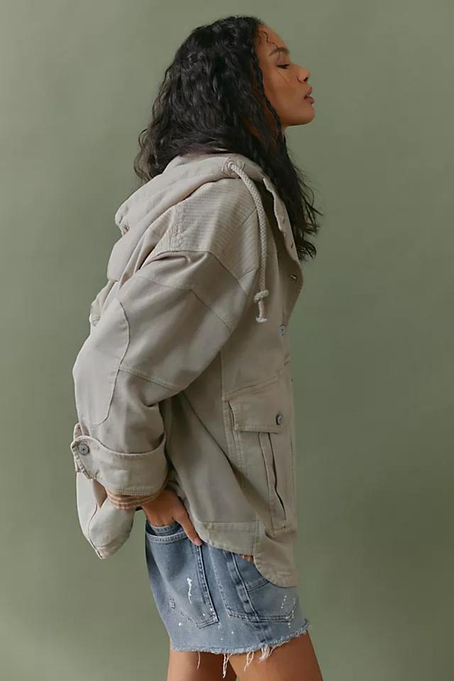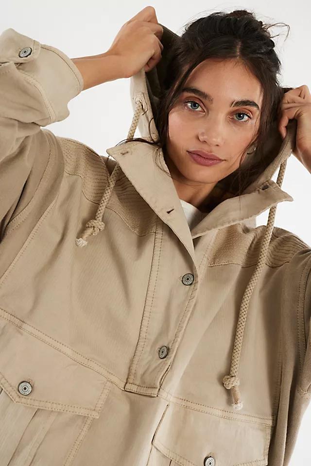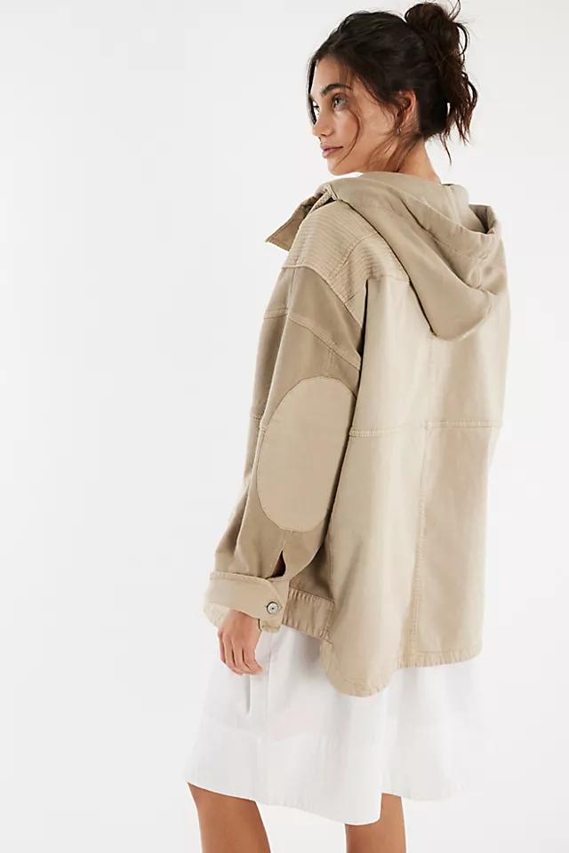 **Features:** Washed cotton fabrication, knit sweatshirt base, attached hood with adjustable drawstring, half-button closure, oversized patch pockets and elbow padding, stitched accents, button cuffs, drop-shoulder sleeves