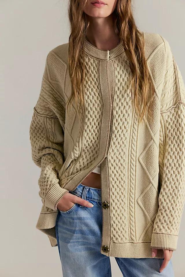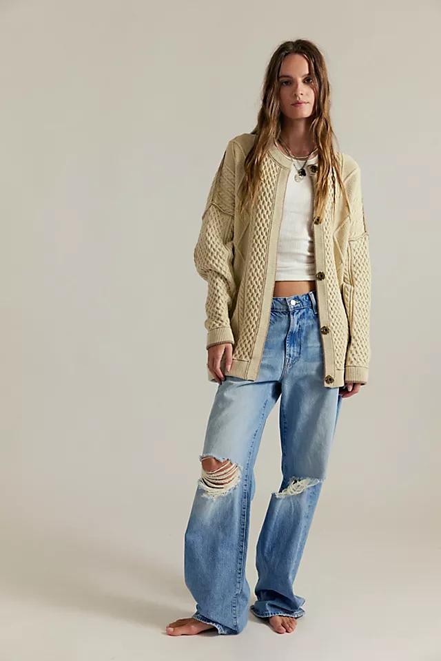 Classic and cozy, this slouchy cardigan from We The Free is featured in a cotton cable knit and extra oversized design for the perfect comfy layer. * Round neckline * Ribbed trim * Cotton blend * Dropped shoulders