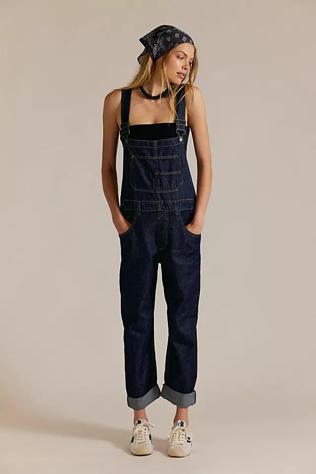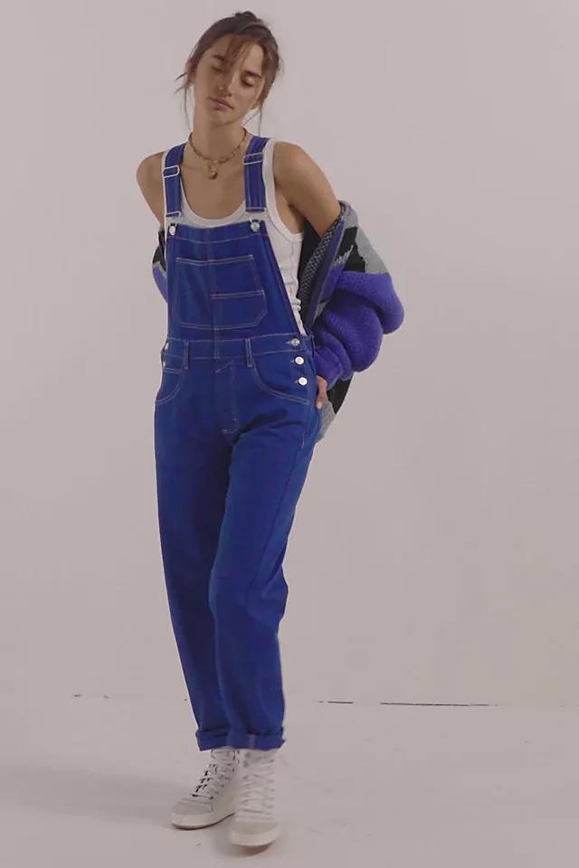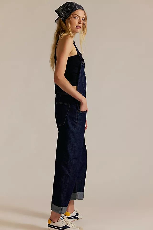 **Features:** Bib-and-brace design, tapered legs, exaggerated bib pocket detail, rigid denim fabrication, varied distressing throughout