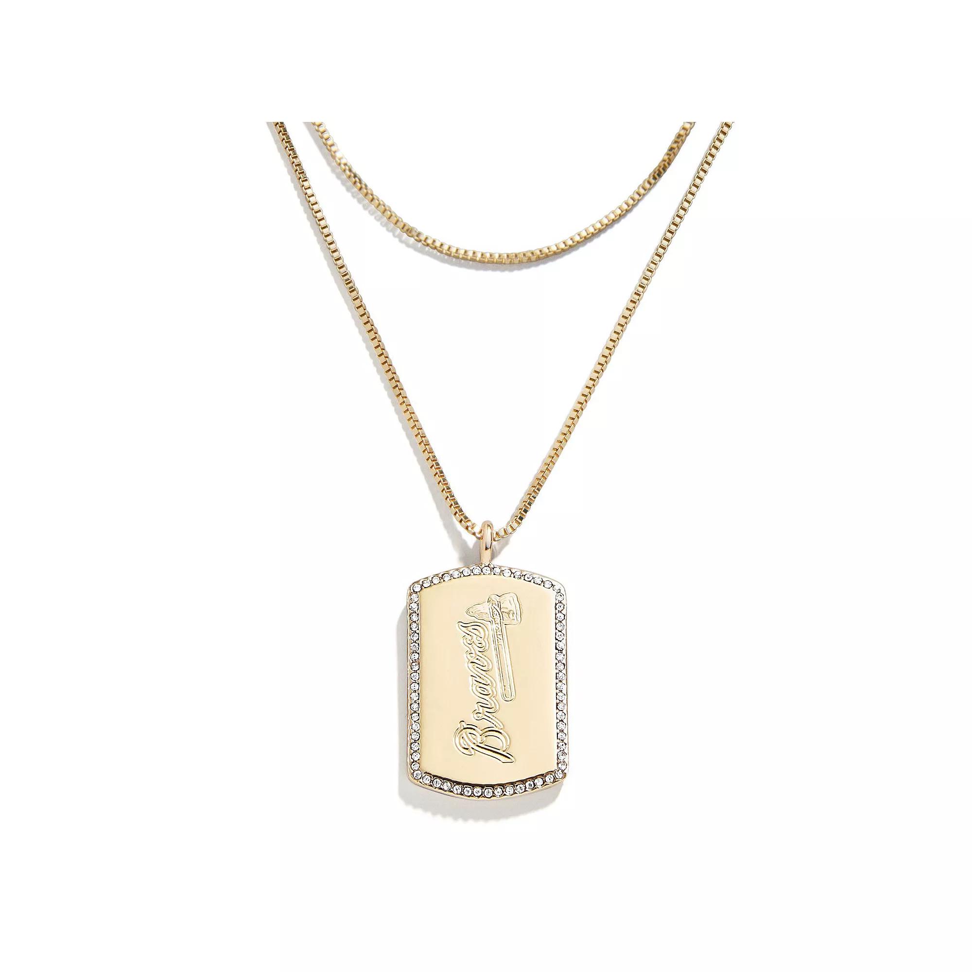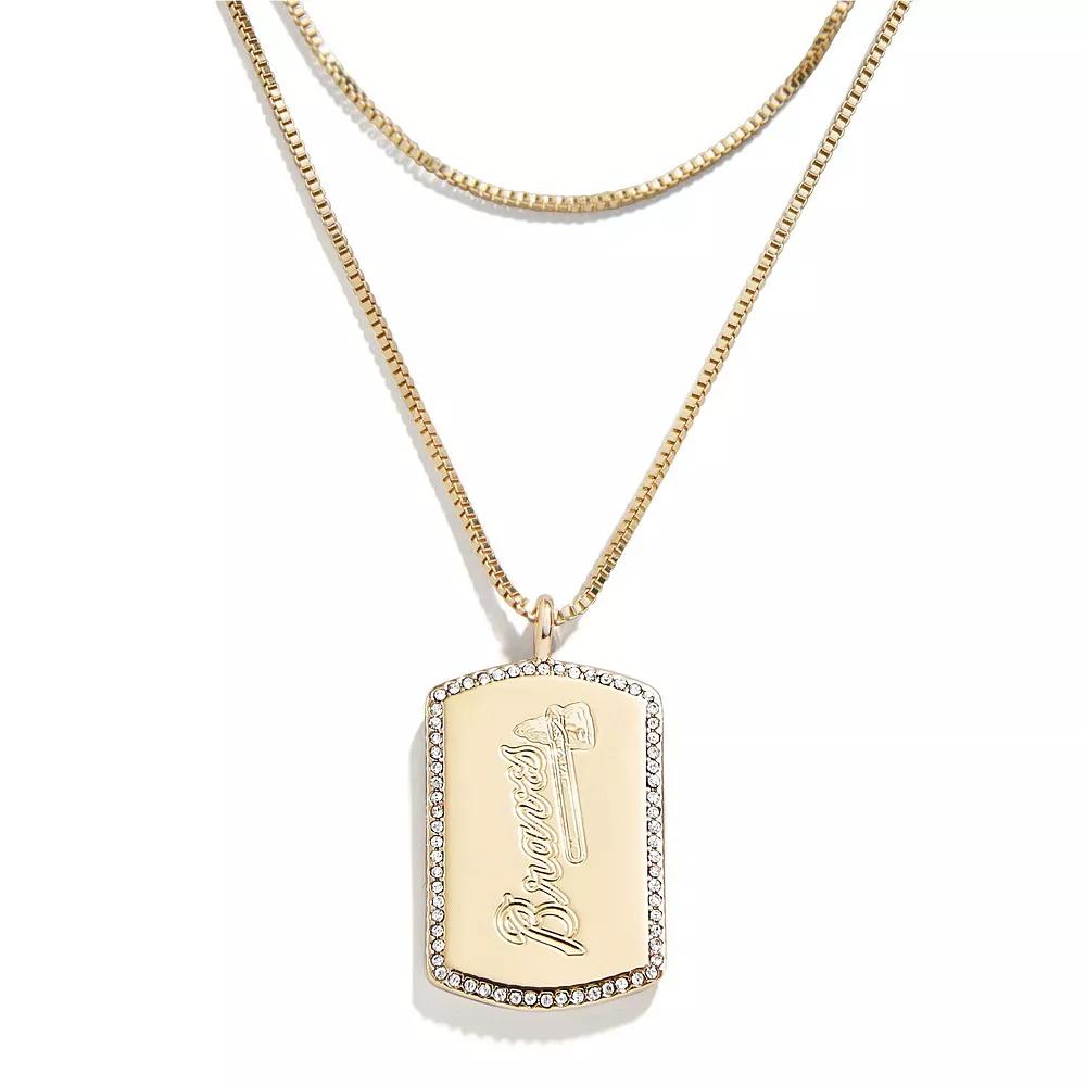Make your team spirit sparkle and shine with this Atlanta Braves Dog Tag necklace. BaubleBar and WEAR by Erin Andrews collaborated to create this layered set featuring debossed details on both sides of the dog tag pendant and shimmering embellishments. A lobster claw clasp ensures this Atlanta Braves necklace fits just right.Make your team spirit sparkle and shine with this Atlanta Braves Dog Tag necklace. BaubleBar and WEAR by Erin Andrews collaborated to create this layered set featuring debossed details on both sides of the dog tag pendant and shimmering embellishments. A lobster claw clasp ensures this Atlanta Braves necklace fits just right.PRODUCT FEATURESWipe clean with a damp clothMaterial: 100% Gold-Plated Sterling SilverDrop length measures approx. 11.5LayeredDebossed graphicsLobster claw clasp with 3.75 extenderGlass stonesHypoallergenicOfficially licensedDog tag measures approx. 1ImportedDouble-side designBrand: WEAR by Erin Andrews Size: One Size. Gender: female. Age Group: adult.