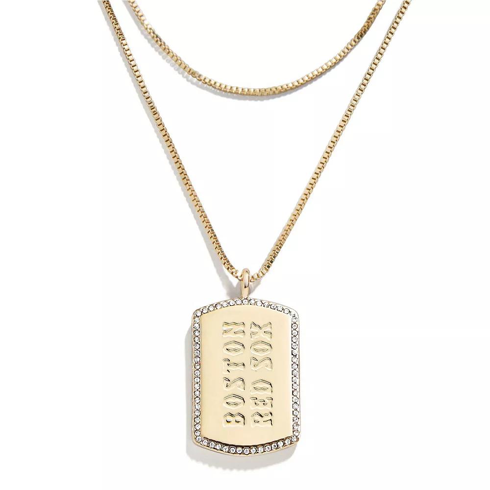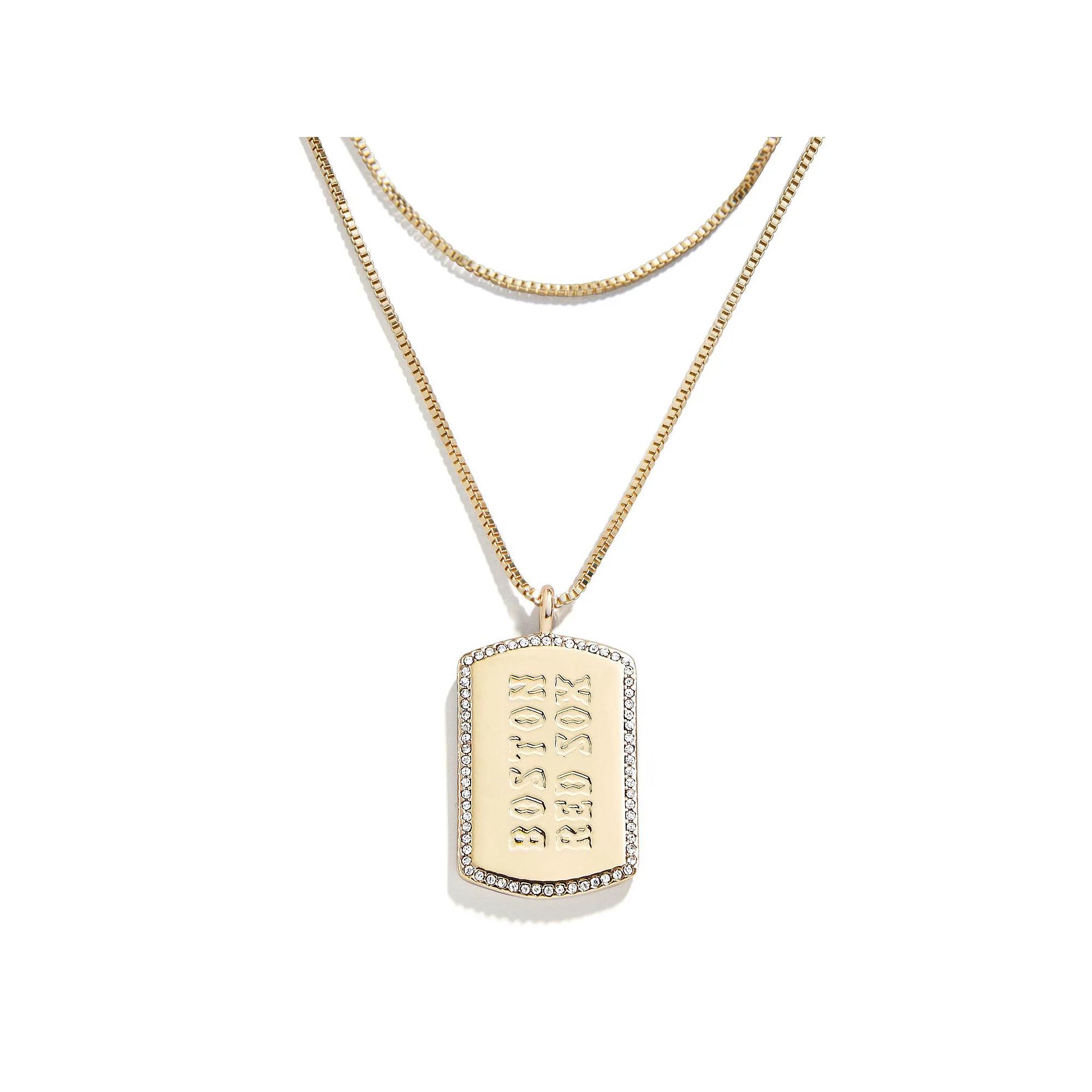 Make your team spirit sparkle and shine with this Boston Red Sox Dog Tag necklace. BaubleBar and WEAR by Erin Andrews collaborated to create this layered set featuring debossed details on both sides of the dog tag pendant and shimmering embellishments. A lobster claw clasp ensures this Boston Red Sox necklace fits just right.Make your team spirit sparkle and shine with this Boston Red Sox Dog Tag necklace. BaubleBar and WEAR by Erin Andrews collaborated to create this layered set featuring debossed details on both sides of the dog tag pendant and shimmering embellishments. A lobster claw clasp ensures this Boston Red Sox necklace fits just right.PRODUCT FEATURESDrop length measures approx. 11.5ImportedDog tag measures approx. 1HypoallergenicMaterial: 100% Gold-Plated Sterling SilverLobster claw clasp with 3.75 extenderDebossed graphicsGlass stonesLayeredWipe clean with a damp clothDouble-side designBrand: WEAR by Erin AndrewsOfficially licensed Size: One Size. Gender: female. Age Group: adult.