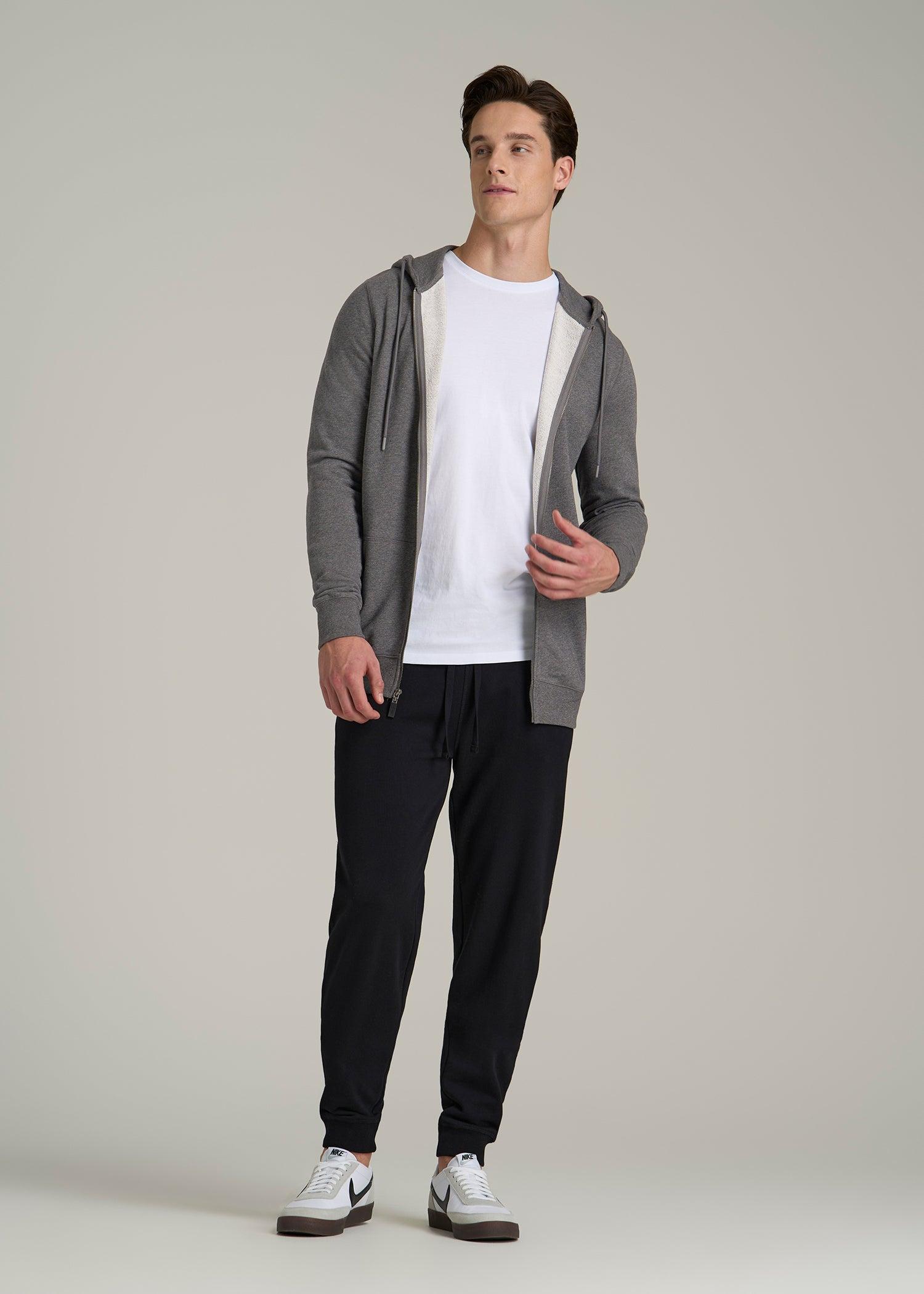 About Our Men's Tall Zip-Up Hoodies This is the softest zip-up you'll own. We know how hard it is to find hoodies for tall men. You need something that's super comfy and ultra-soft, but that can be hard to find when everything's built for people that are way shorter than you. Enter American Tall. We design clothes exclusively for guys between 6'3” and 7'1”, including loungewear staples like this comfortable zip-up. It has super long arms and an extended length like our classic men's tall hoodie with a full-zip front, drawstring hood and kangaroo pocket. We used our popular Wearever French Terry fabric, a cotton and polyester blend that's thicker and more durable while still being comfy enough for everyday wear. Plus, it's been pre-washed and shrinkage controlled, so you won't have to worry about losing any extra inches in the wash. Throw it on over top of a fitted tee with a pair of our matching French Terry sweatpants or joggers for ultimate relaxation. SIZE & FIT: Modern fit Full-zip hoodie Long sleeves Hip length Drawstring hood Model is 6'8", 215lbs, wearing size L Tall FABRIC & CARE: 80% cotton, 20% polyester French Terry Traditional kangaroo pocket Pre-washed and shrinkage controlled Machine wash cold with like colors Tumble dry low, low heat iron Do not bleach