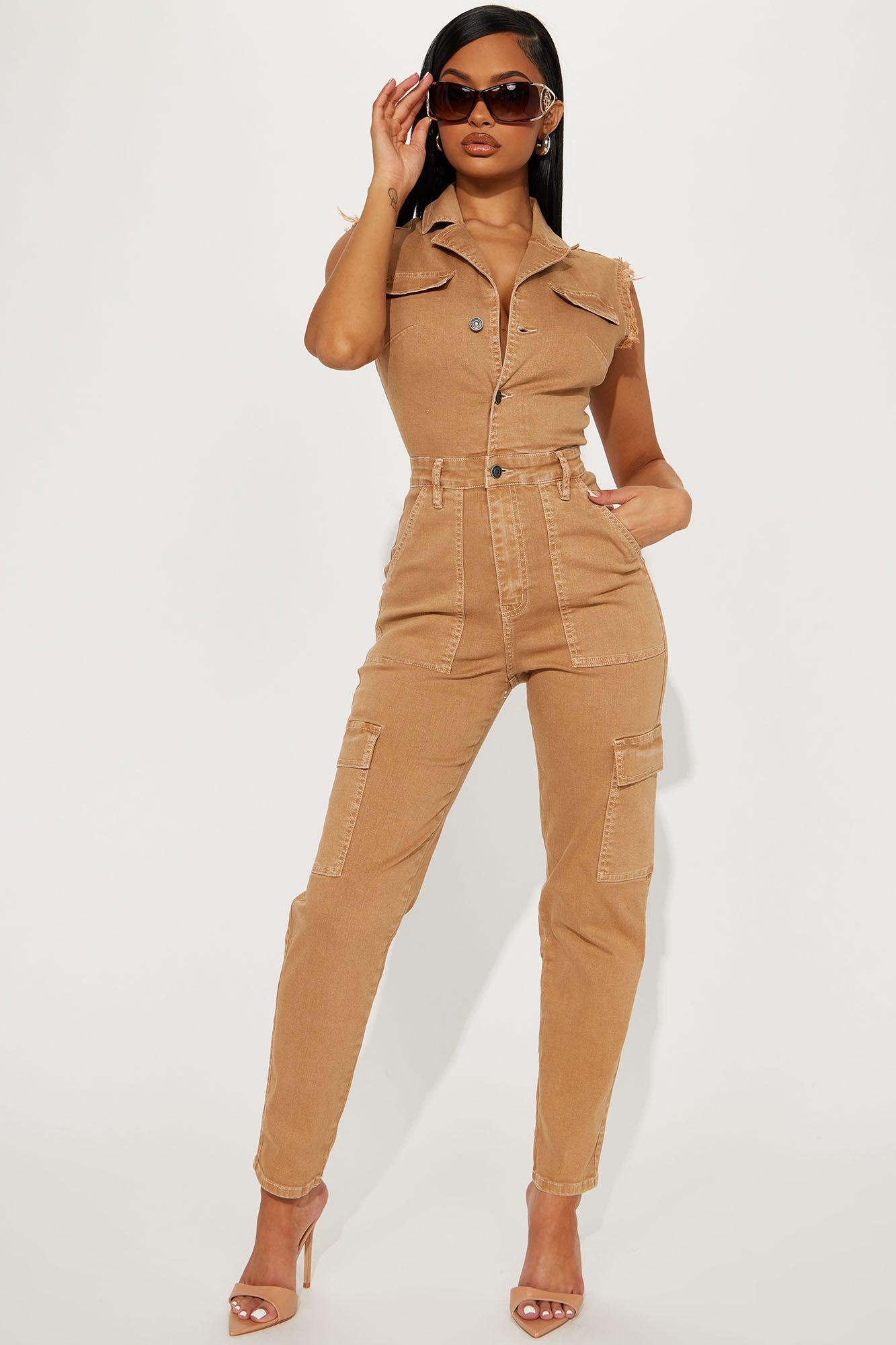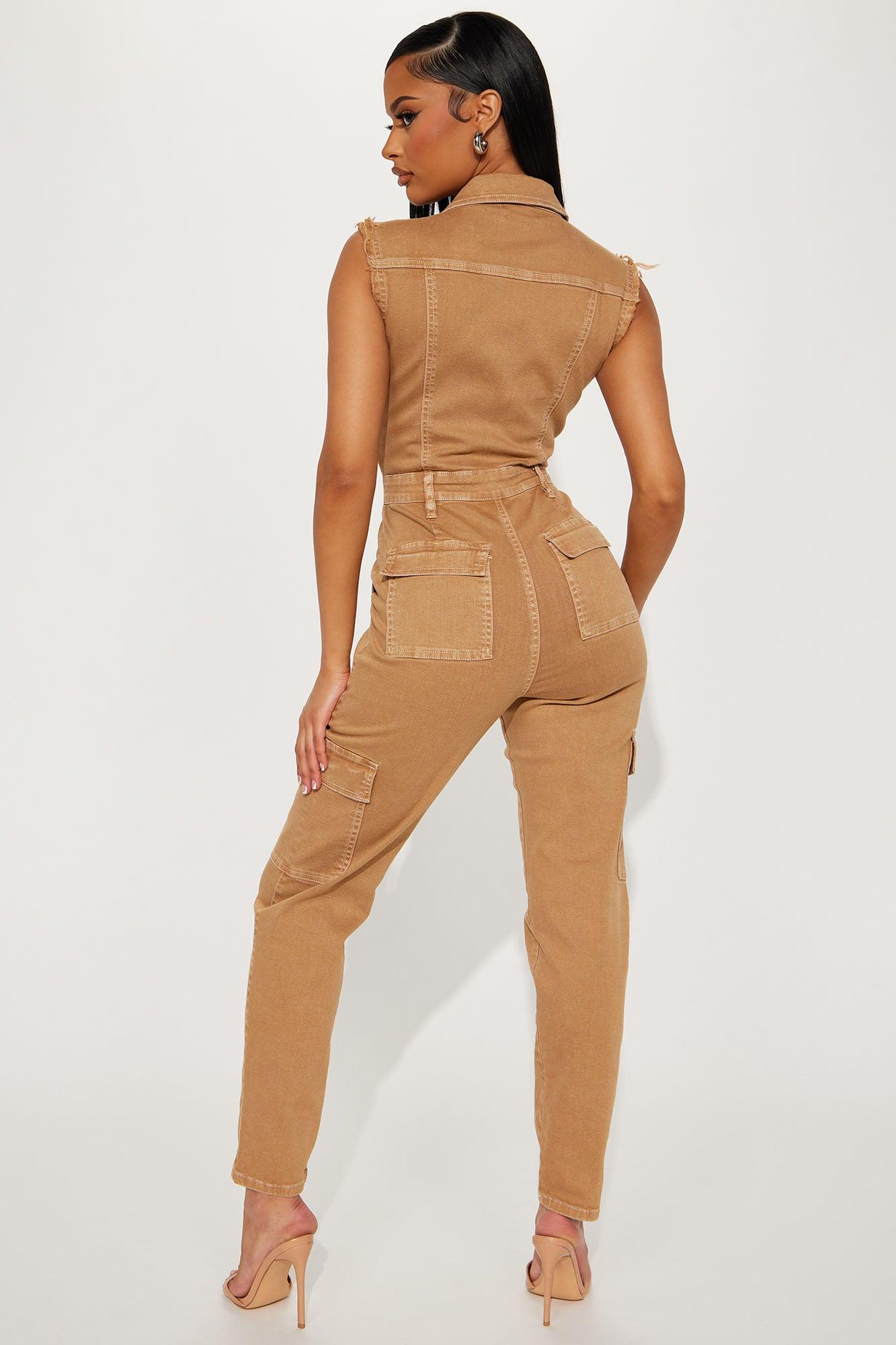 Available In Tan. Denim Jumpsuit Collar V-Neck Front Buttons Zipper Front Closure Contouring Bust Detail Front Slit Pockets Cargo Back Pockets Stretch Disclaimer: Due To The Specialized Wash & Distressing Process, Each Garment Is Unique. Self: 97% Cotton 3% Spandex Imported California Proposition 65WARNING: Cancer and Reproductive Harm - www.P65Warnings.ca.gov.