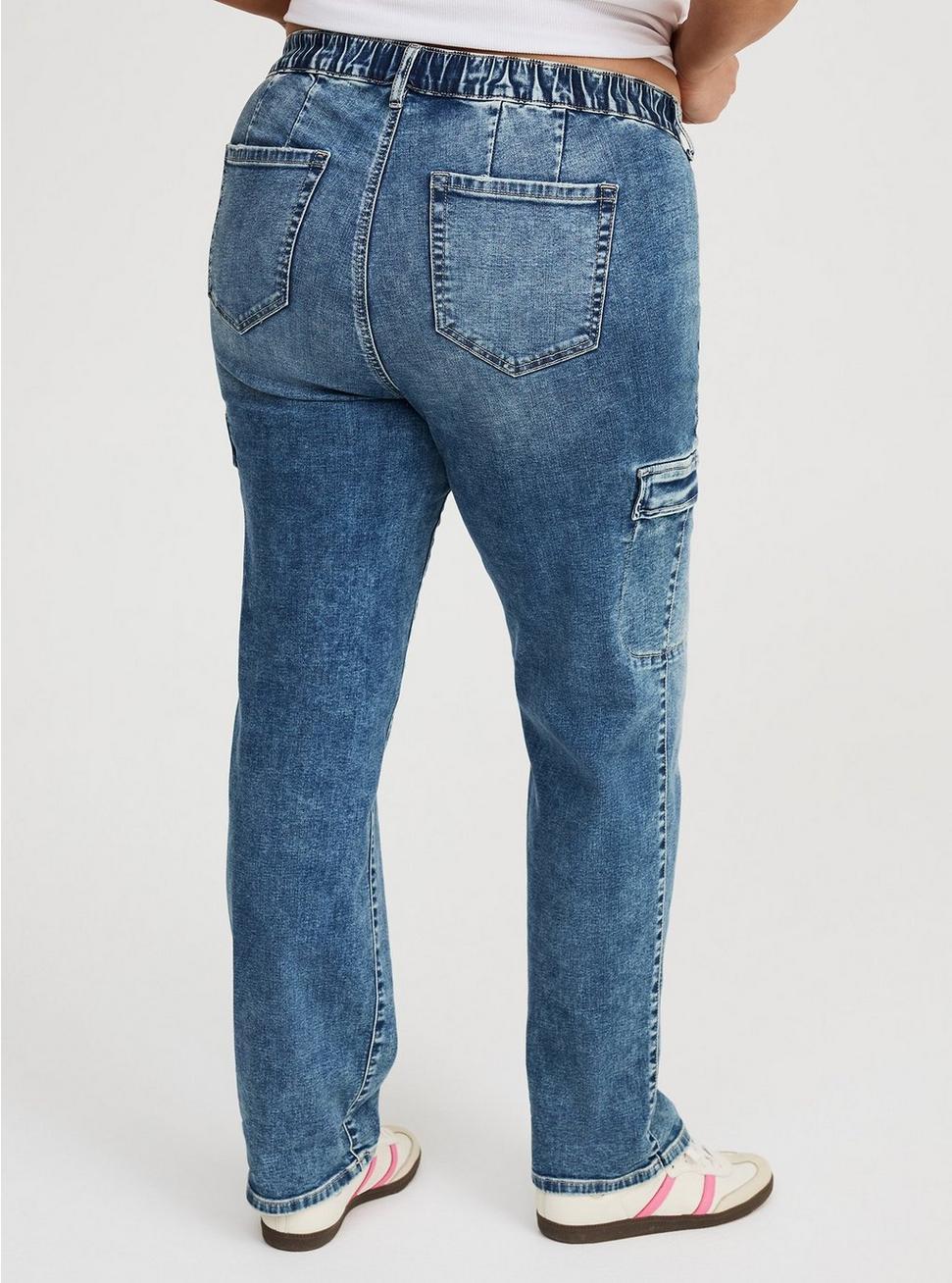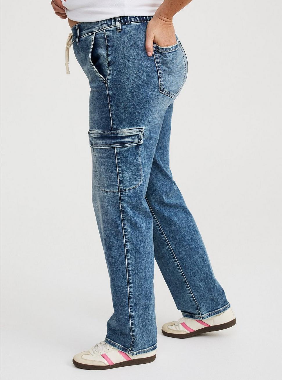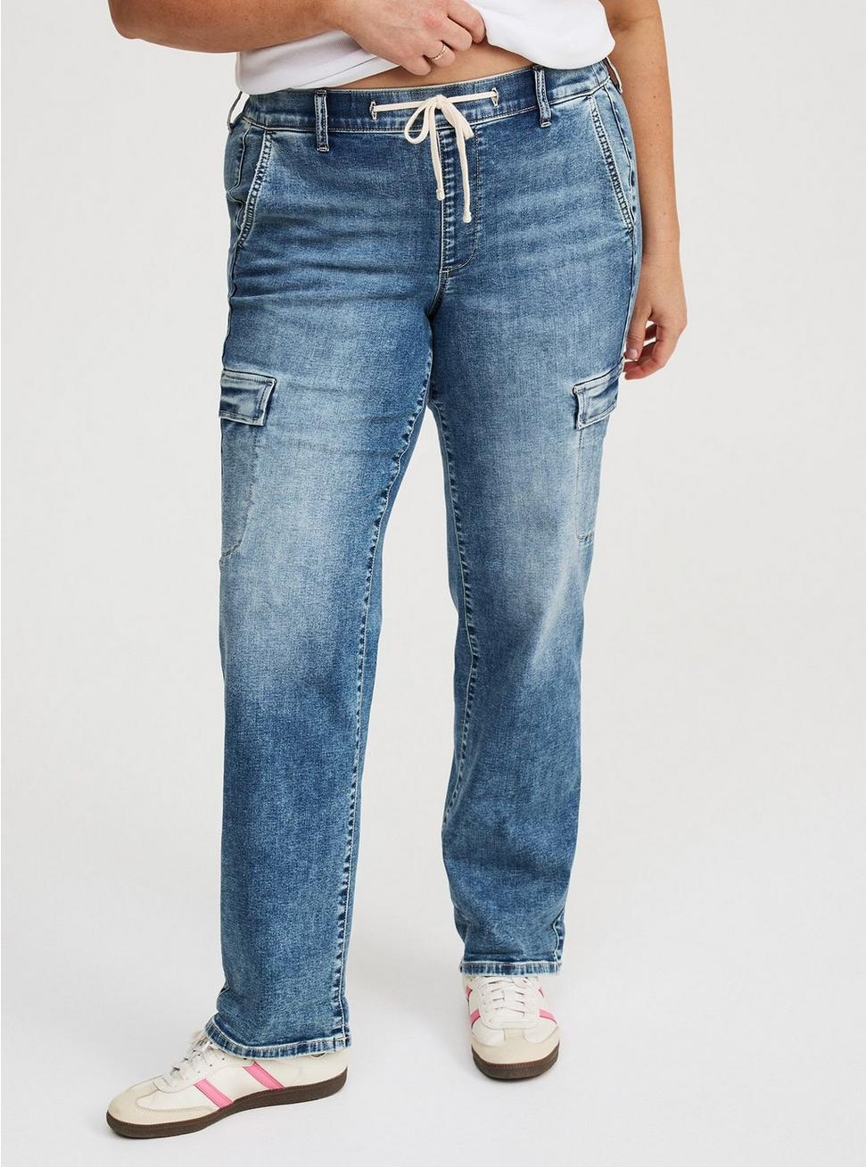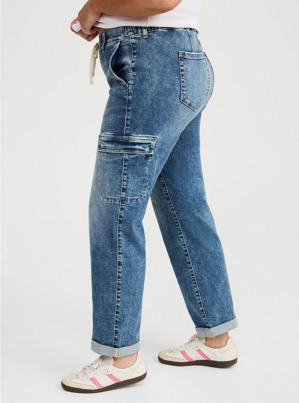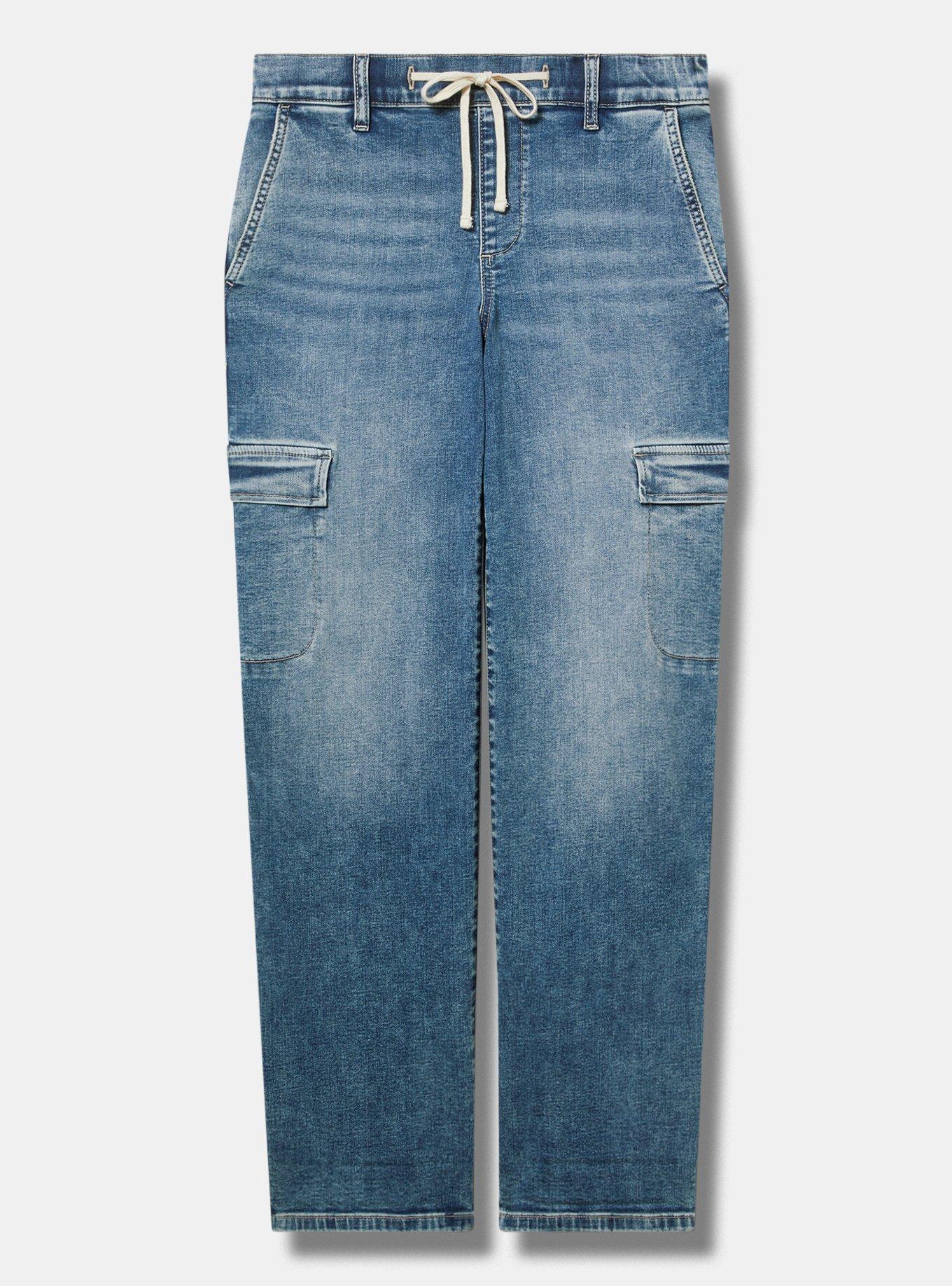 FITMid rise. Boyfriend silhouette.Pull-on design.Inseams: Short 28.5'', Regular 30.5'', Tall 32.5''MATERIALS + CARESuper Soft Denim: Extraordinary stretch with a buttery brushed feeling soft enough to sleep in (and we have!).Stretch level: Maximum.65% cotton, 20% rayon, 13% polyester, 2% spandex.Machine wash cold, inside out. Tumble dry low.Imported.DETAILSFly-free drawstring waistband.No hardware or buttons for optimal comfort.4-pocket design.Cargo pocket details.Flip up the hem for an easy crop or keep uncuffed for full length.