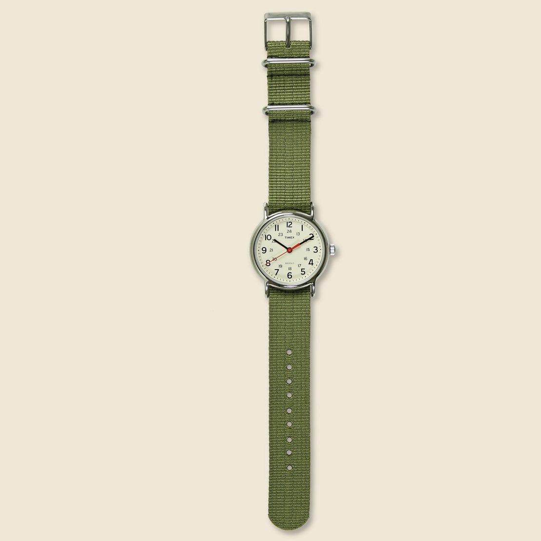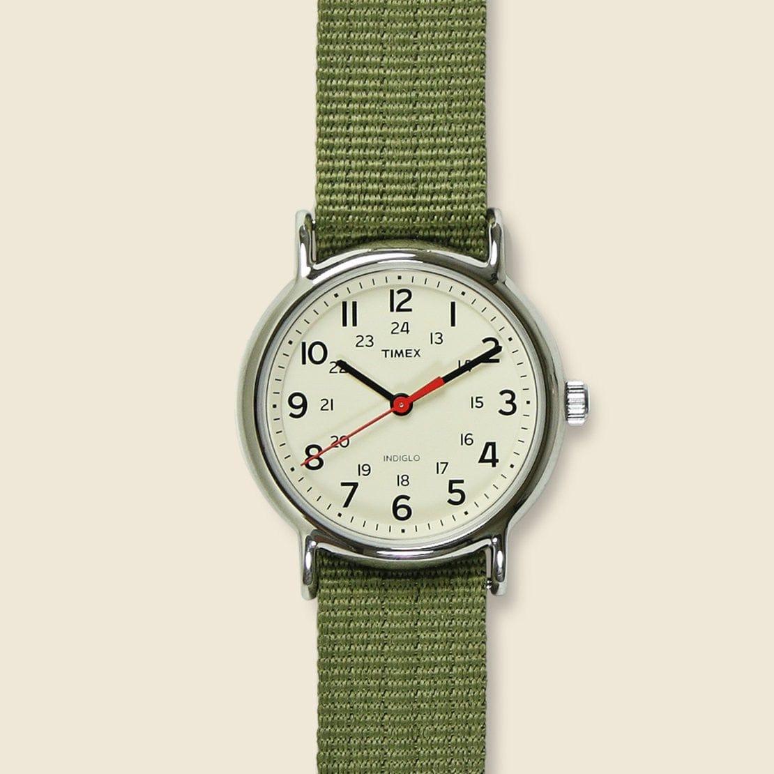 Comfortable, versatile and effortlessly cool, the Weekender Watch from Timex is built to last. Designed with slip-thru straps for easy changing and allowing for customization. 24 Hour Time Olive Green Nylon Slip Through Strap Water-Resistant to 30 meters Materials: Brass, Nylon Dimensions: 38mm watch face