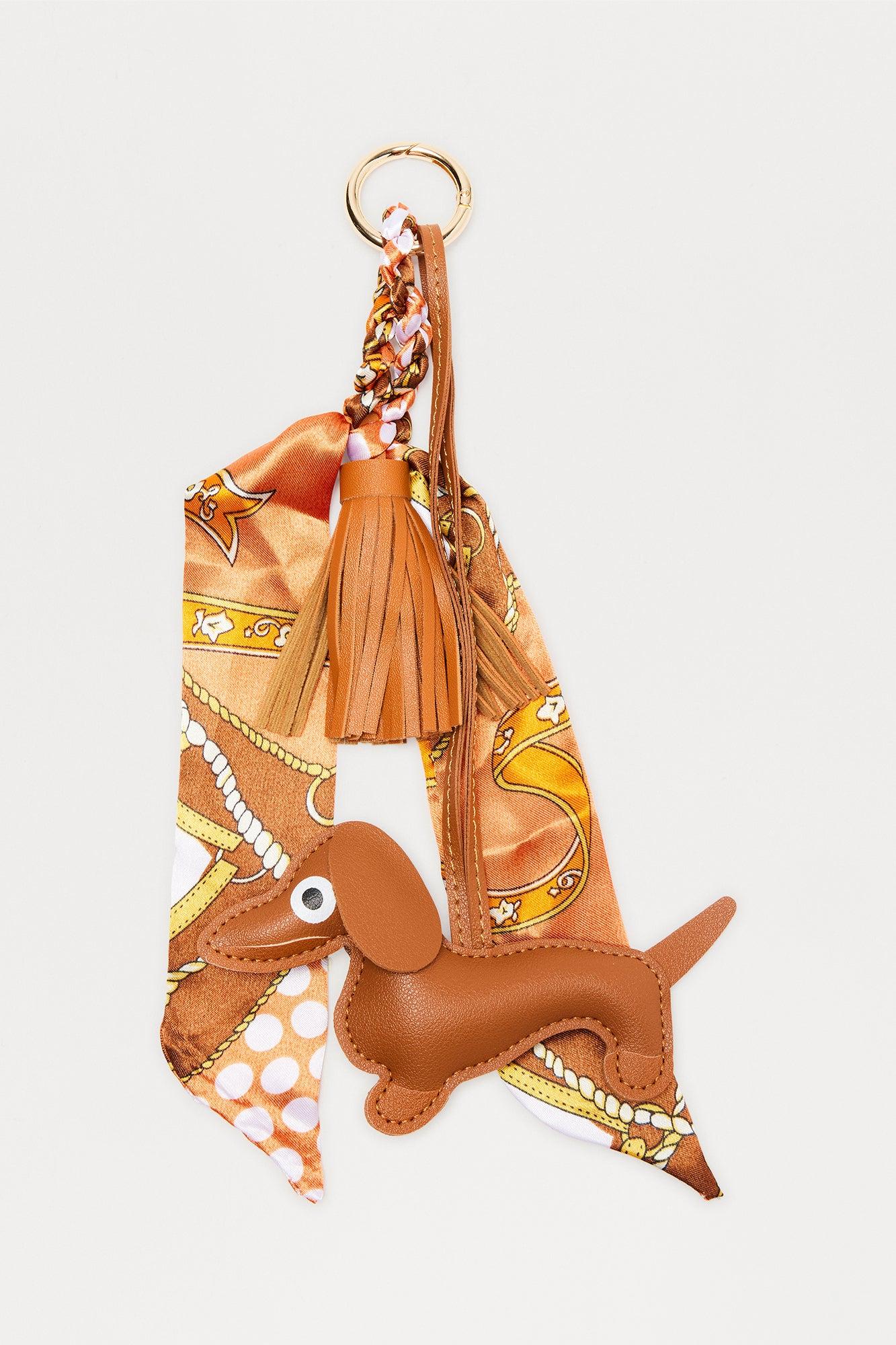 Available In Brown/combo. Handbag Charm Weiner Dog Design Faux Leather Silky Scarf Detail Fringe Detail Imported California Proposition 65WARNING: Cancer and Reproductive Harm - www.P65Warnings.ca.gov.