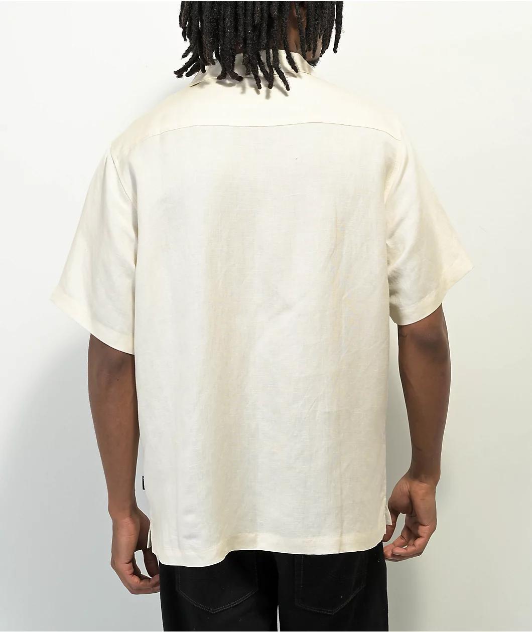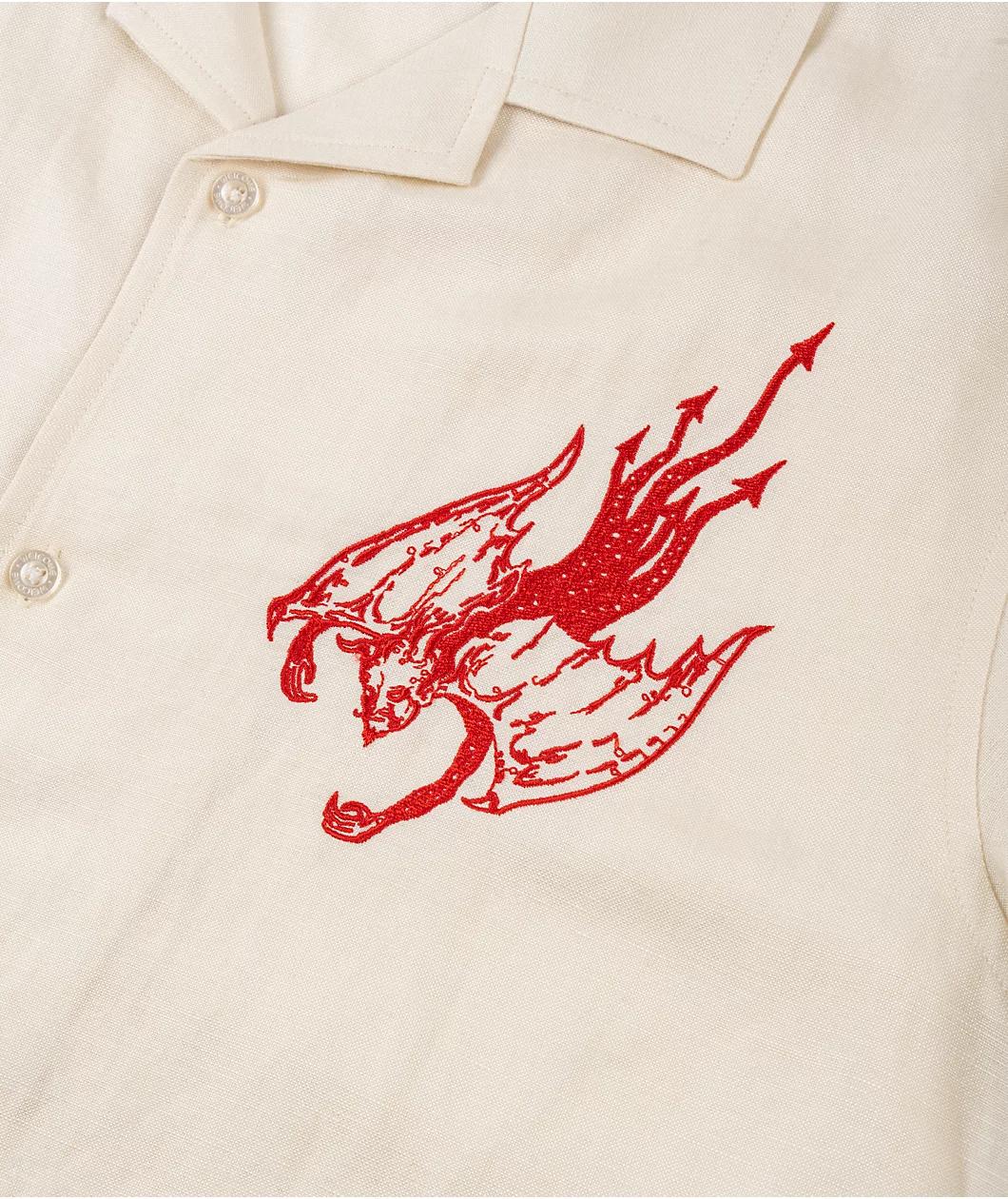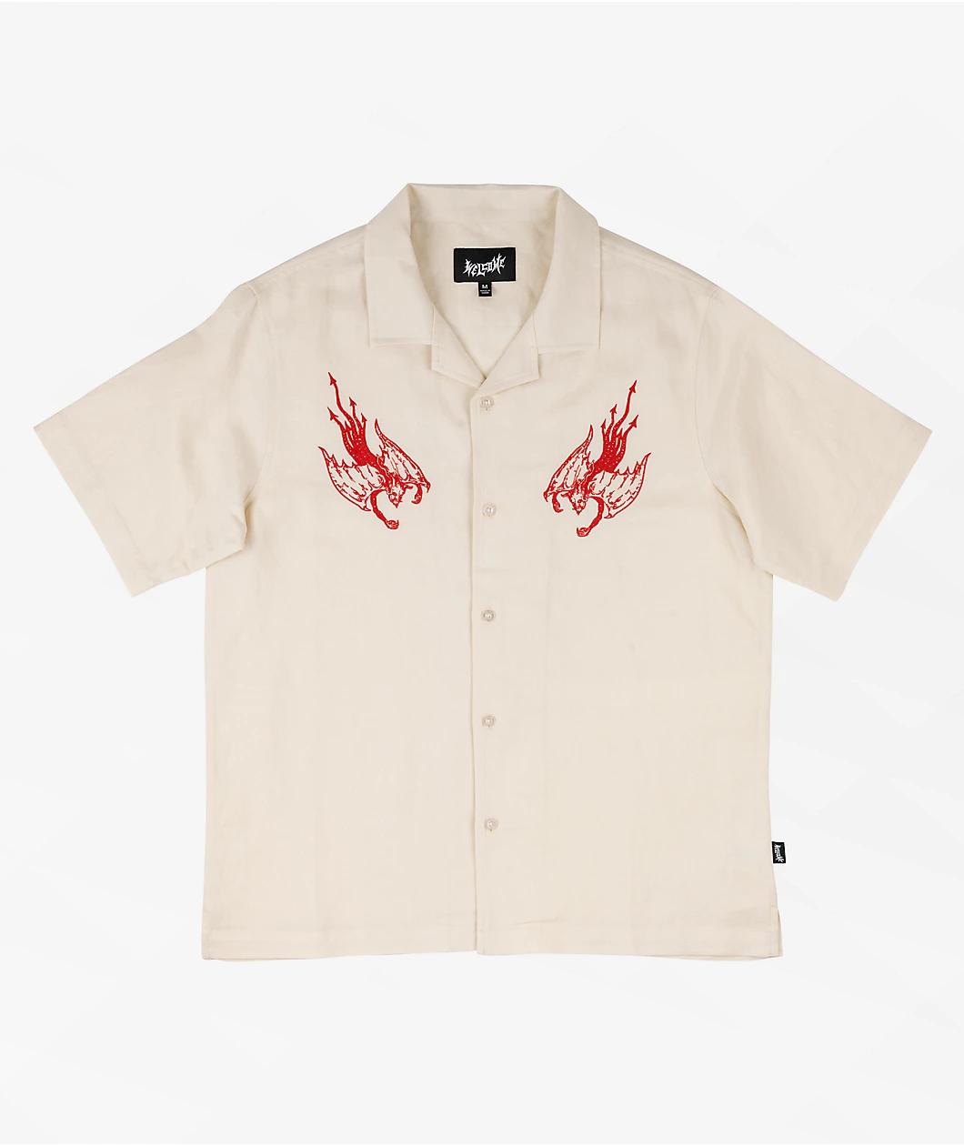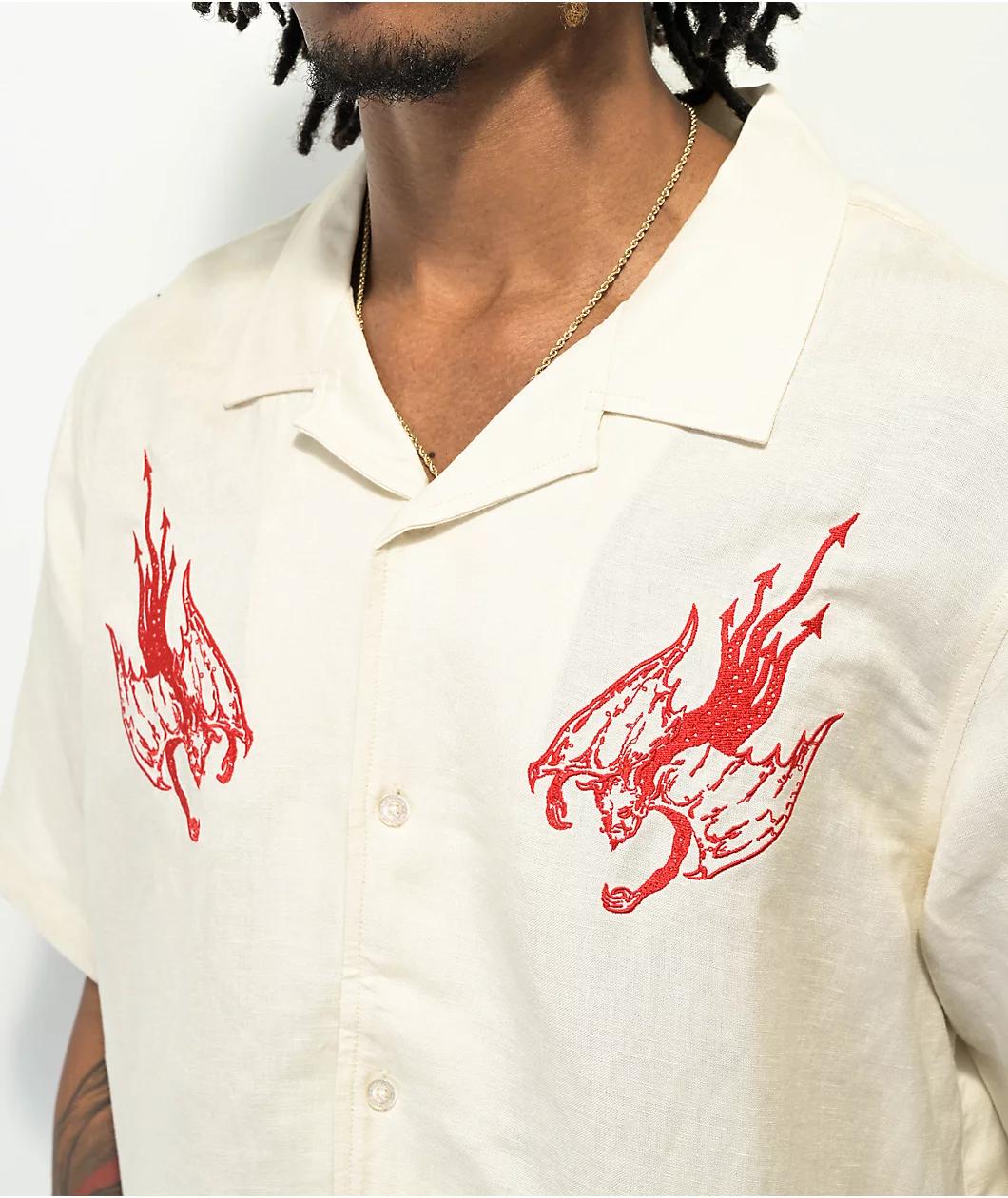 From Welcome Skateboards, the Hellion button up shirt comes in an earthy bone colorway. The relaxed short sleeve design features embroidered red demons on both sides of the chest, as a camp collar ensures an on-trend look. Made from breathable cotton line