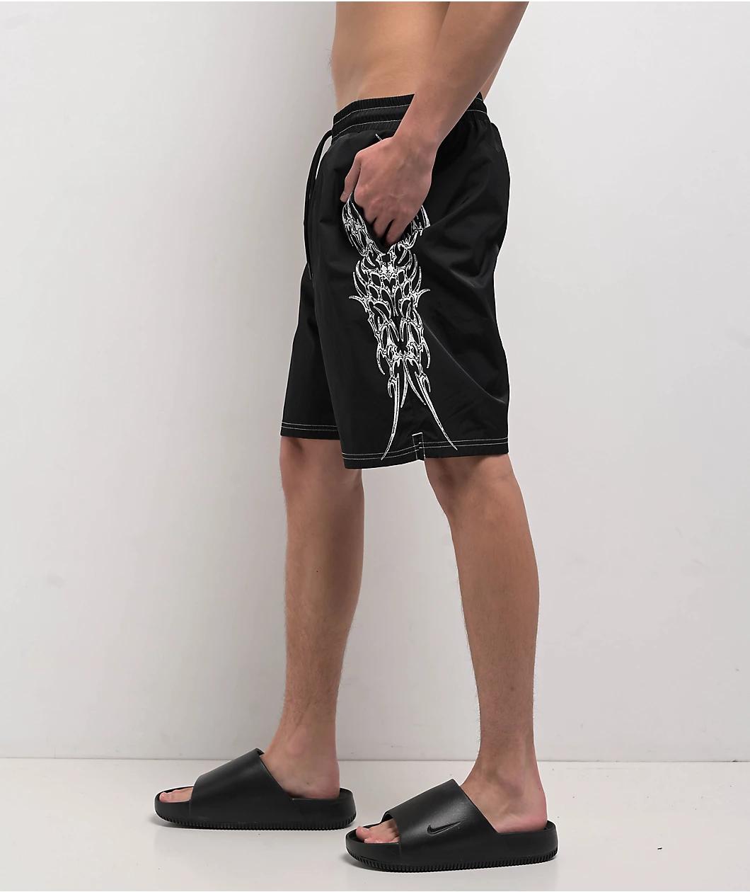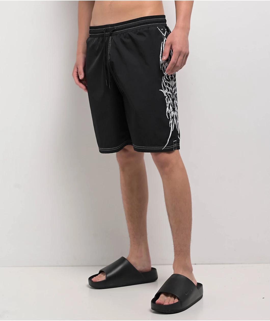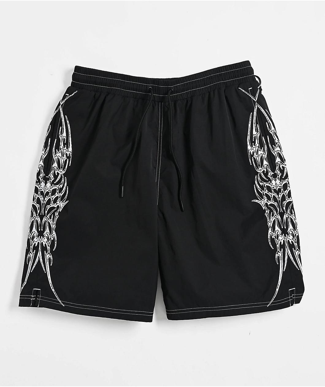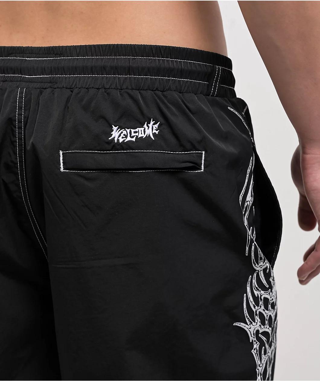Bring your edgy style to the beach with the Horde board shorts from Welcome Skateboards in a black colorway. Screen-printed on both legs of the swim trunks are cyber sigilism designs adorned with white contrast stitching throughout. These shorts have