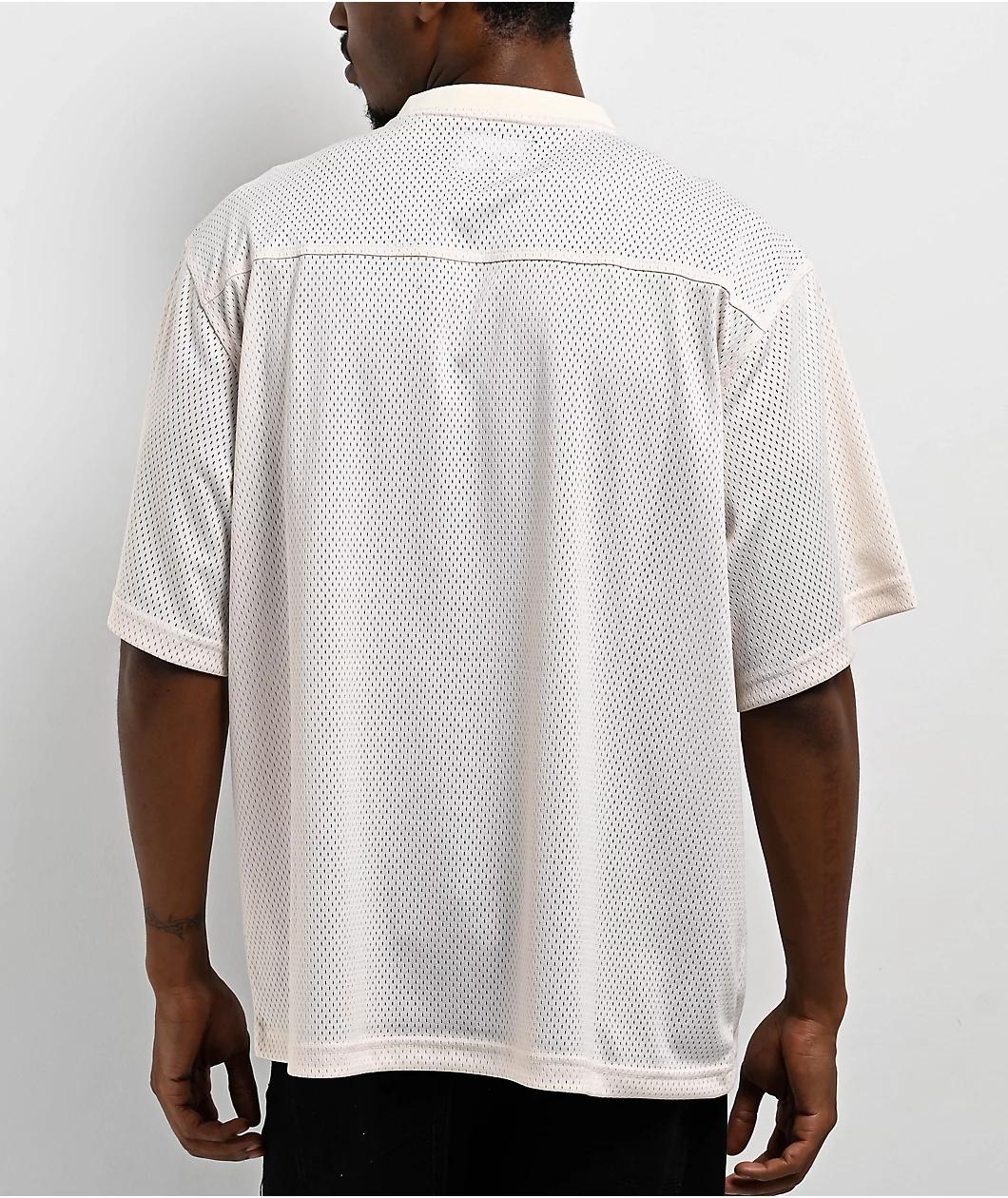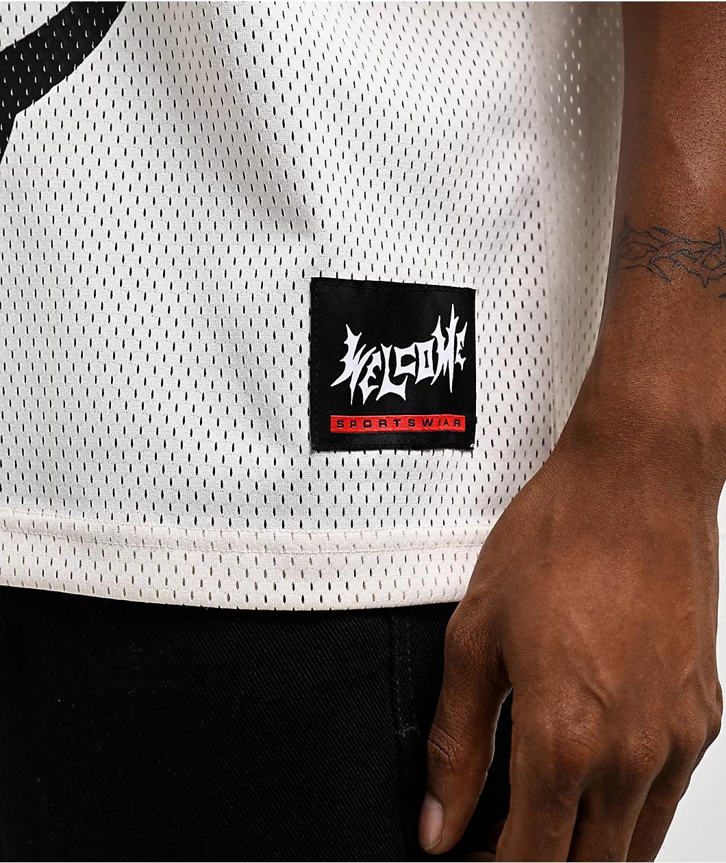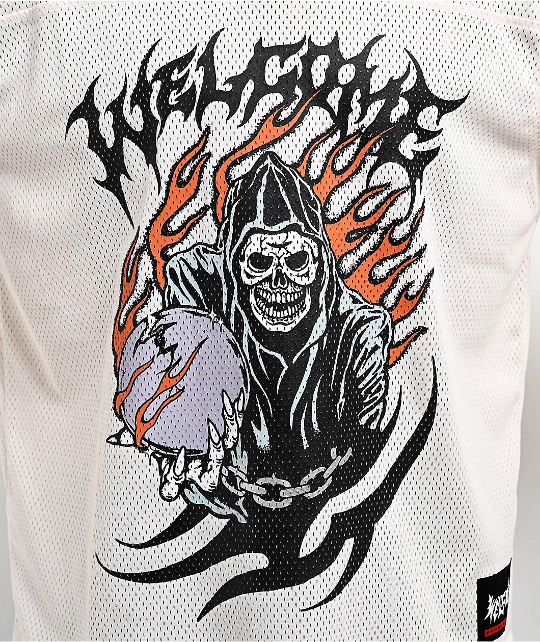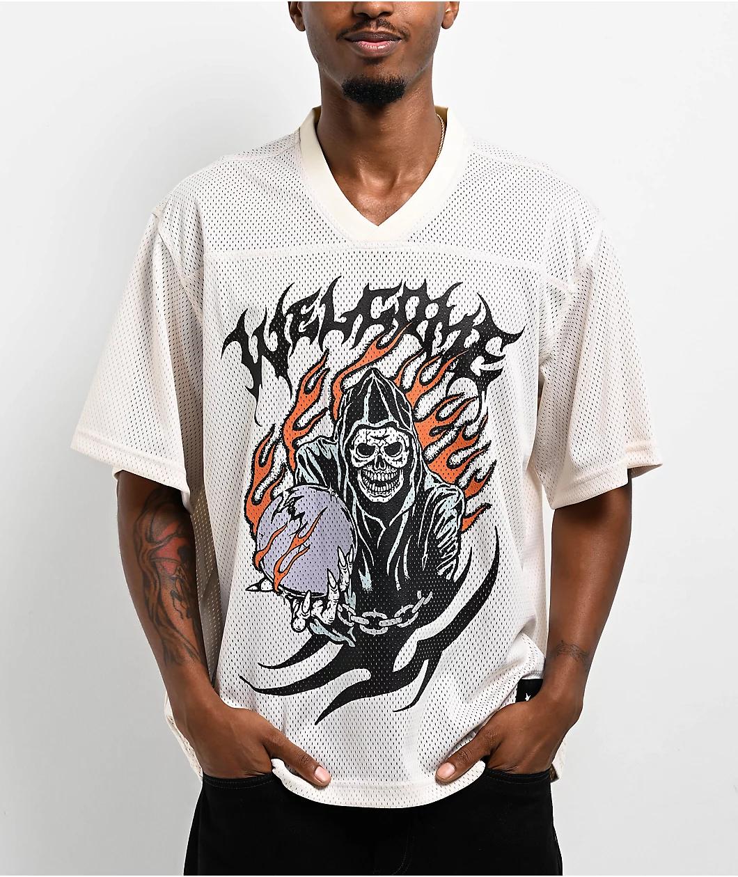 Offered in a bone colorway, the Omen jersey from Welcome has a breathable mesh construction with a boxy, drop-shoulder silhouette. A screen-printed reaper graphic is featured on the chest, extending a mystical orb towards the viewer. Designed with a