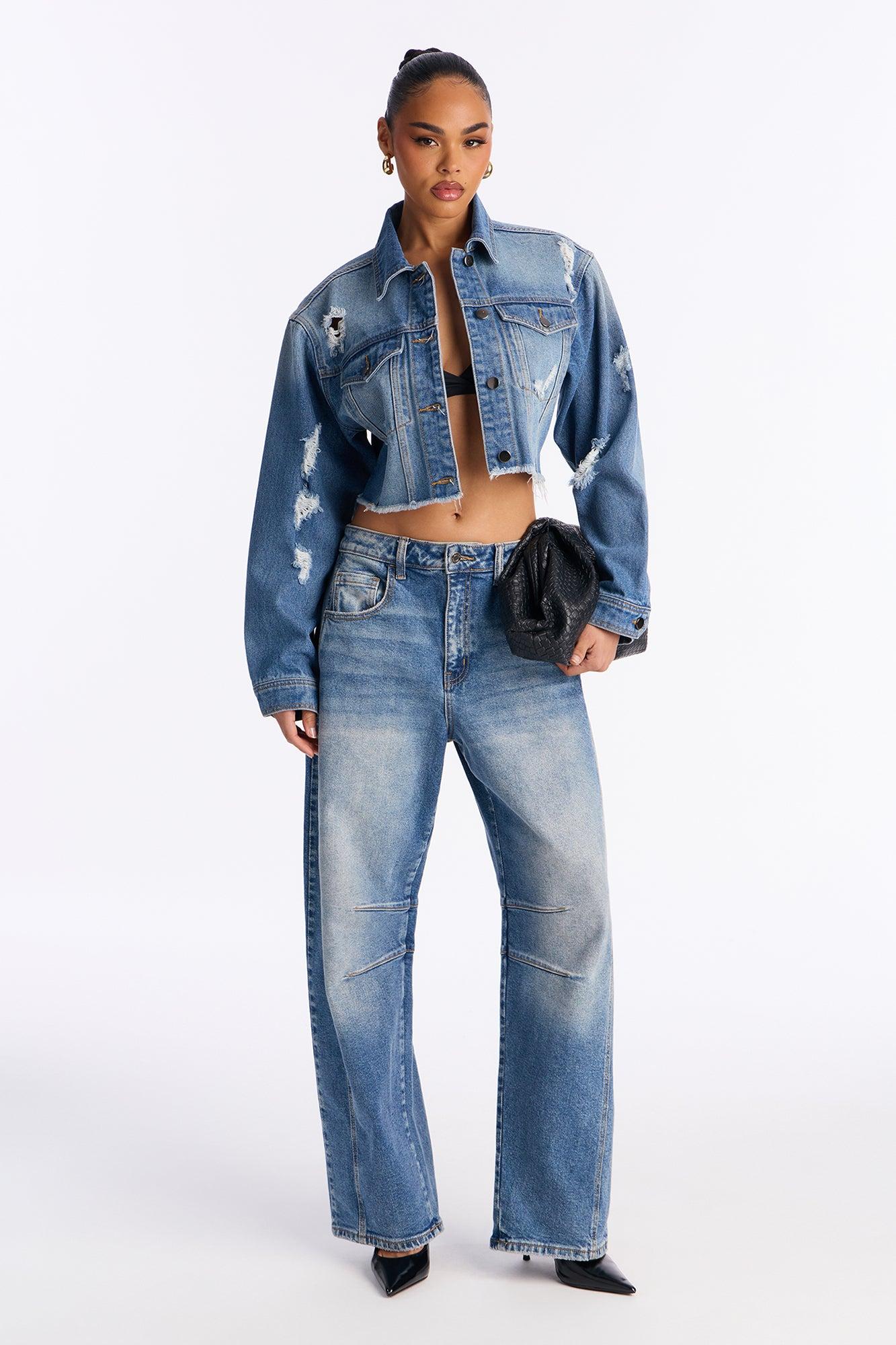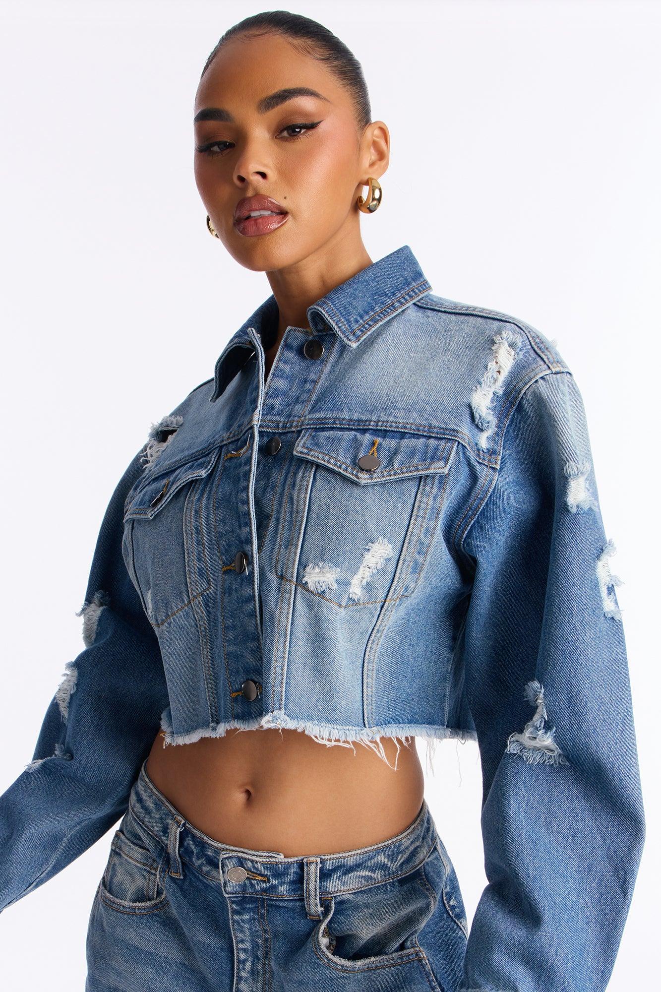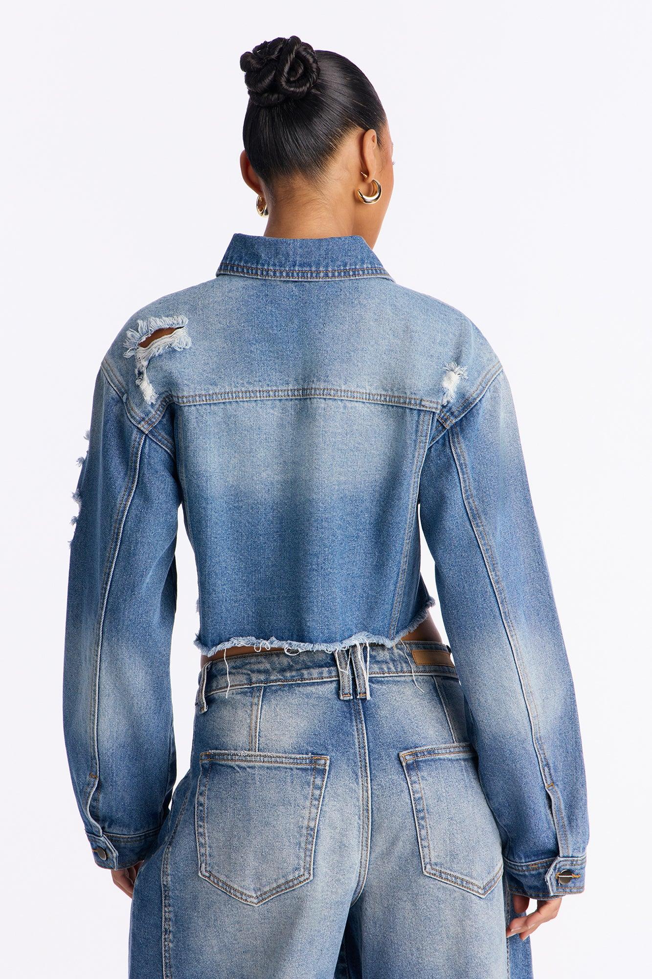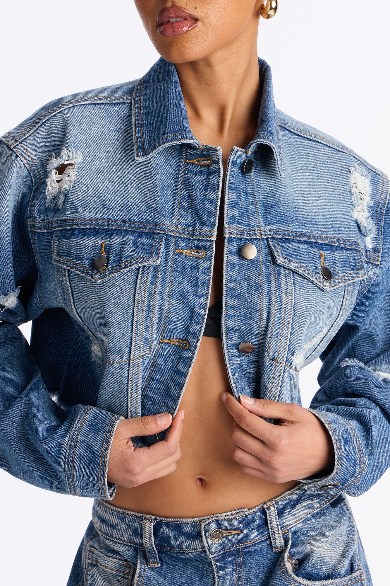 Available In Medium Wash. Denim Jacket Collar Button Closure Chest Pockets Distressed Denim Rigid Disclaimer: Due To The Specialized Distressing & Wash Process, Each Garment Is Unique. To Keep The Aesthetic Of This Garment, Please Follow The Care Instructions Carefully. Self: 58% Cotton 42% Polyester Imported