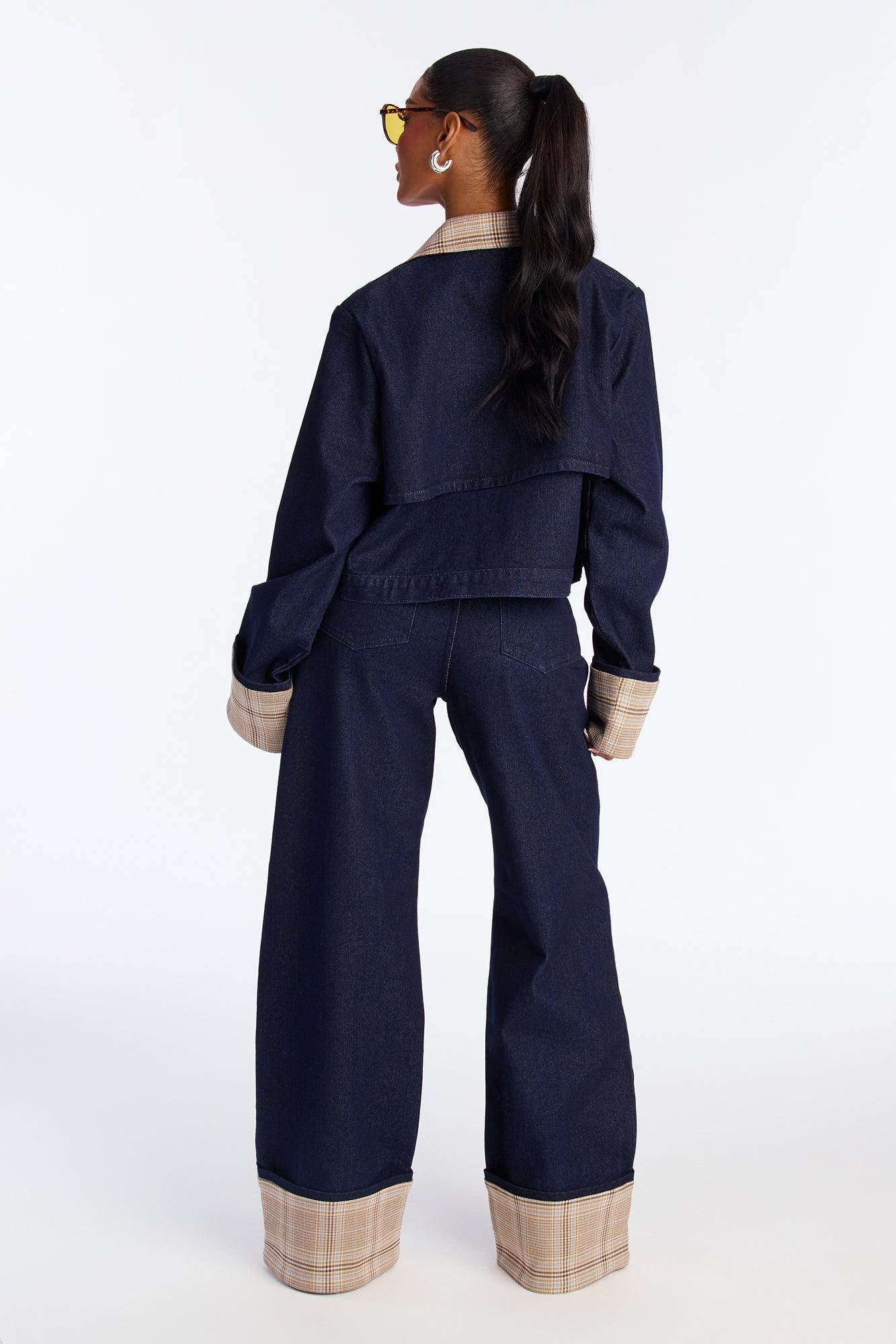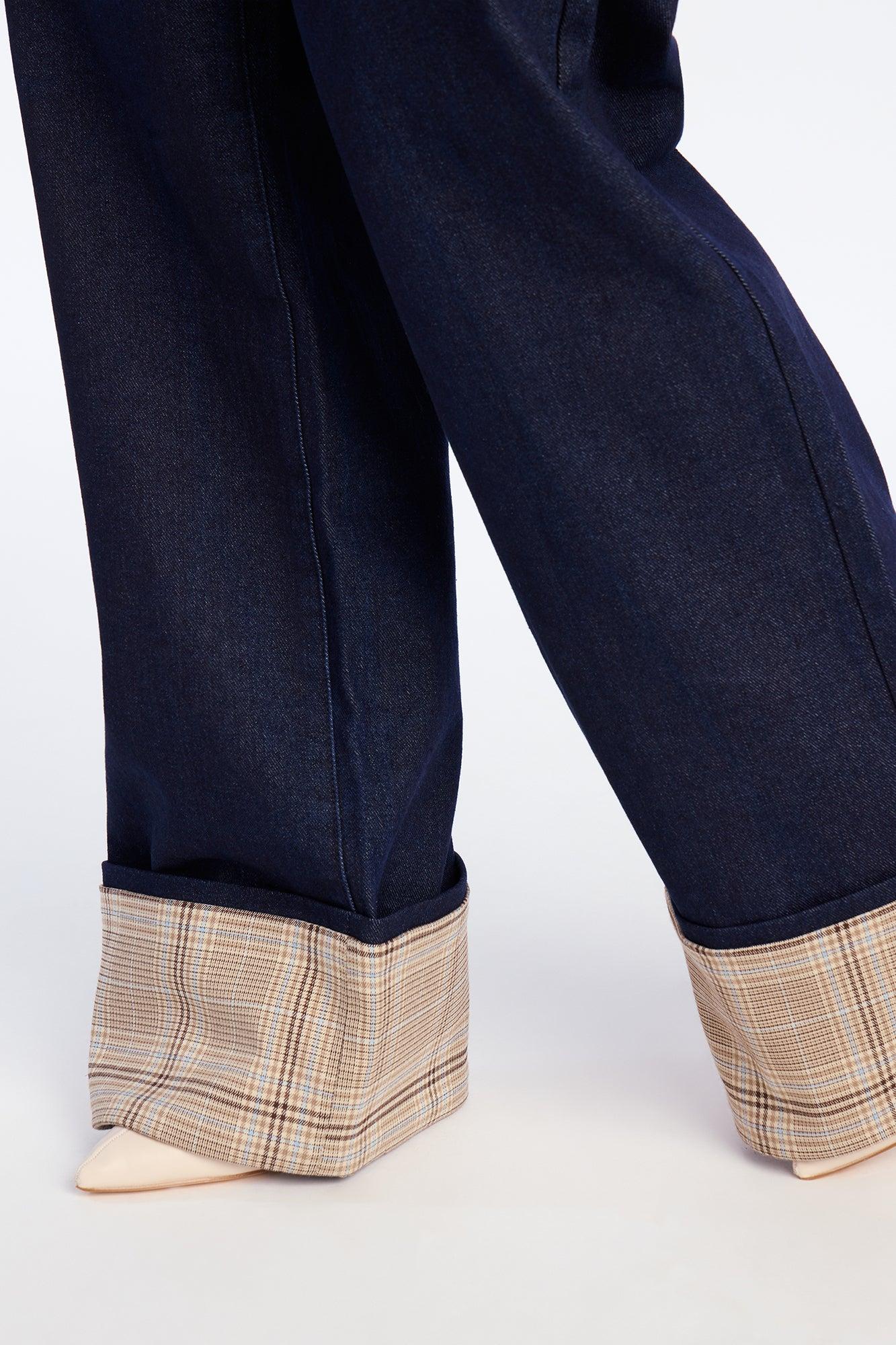 Available In Dark Wash. Pair With Well Read Gal Denim Jacket Wide Leg Jean 5 Pocket Tacked Plaid Cuff Plaid Trim 12" Rise 32" Inseam Non-Stretch Disclaimer: Due the To The Specialized Dye Process, Loose Dye Can Stain On Contact. Do Not Wash with Other Garments Self: 86% Cotton 7% Polyester 7% Rayon Trim: 99% Polyester 1% Spandex Imported California Proposition 65WARNING: Cancer and Reproductive Harm - www.P65Warnings.ca.gov.