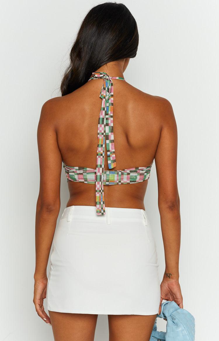 Multi Halter Top In desperate need of some colour to your wardrobe? Why not style this multi halter top with black high waist pants and a bold heel to match - we've got you covered! Halter neck top with ties at neck Multi check print Cropped length Light weight mesh material with stretch Unlined -sheer