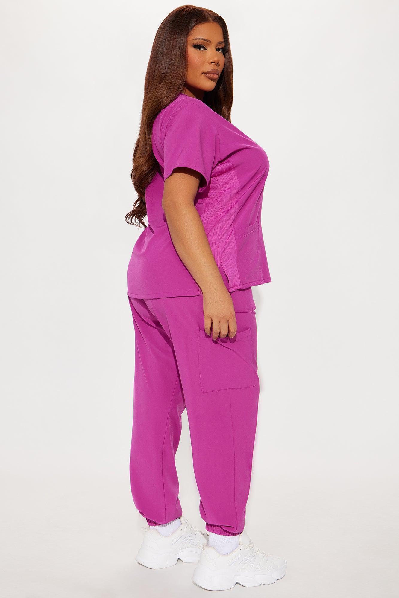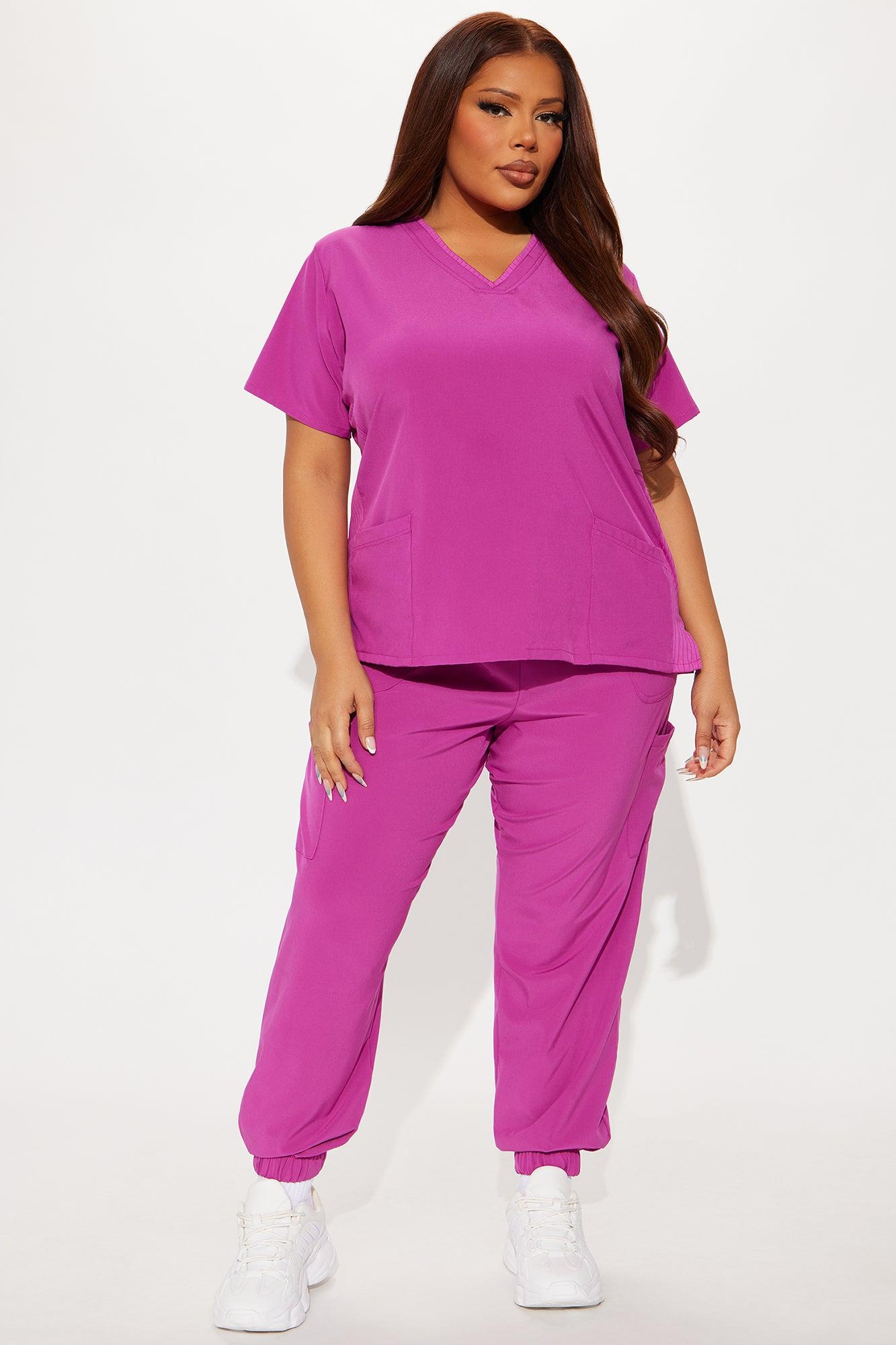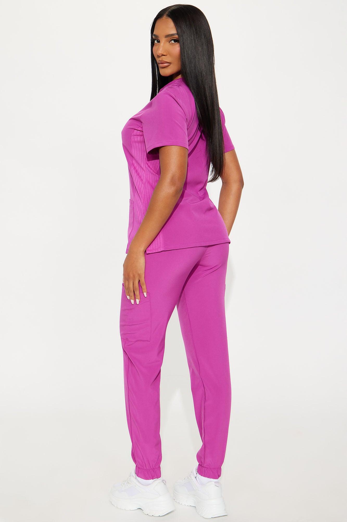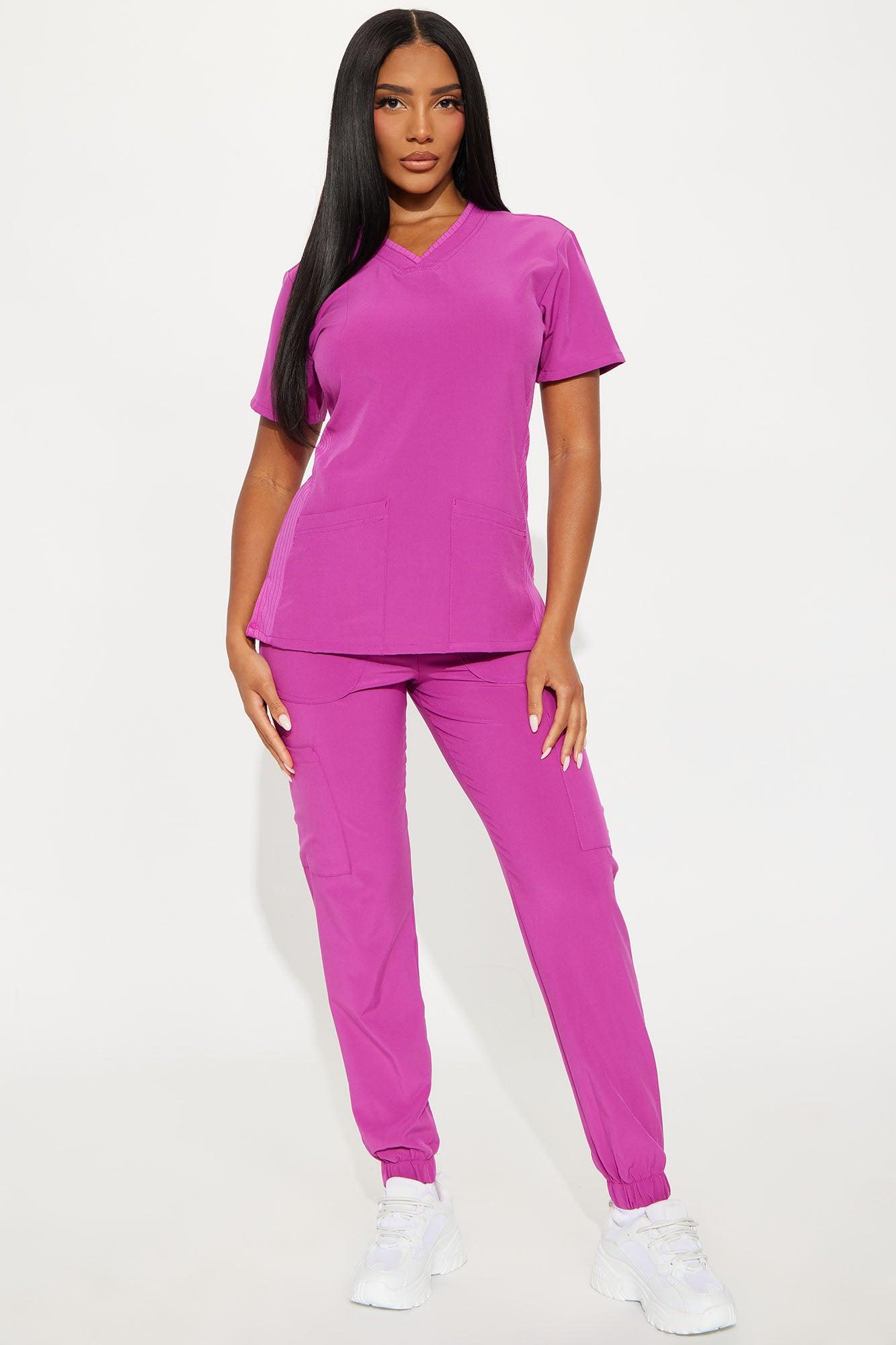 Available In Charcoal, Hot Pink, Magenta And Royal. Uniform Scrub Set Short Sleeve Top V Neck Rib Fabric Side Front Pockets Side Slit Matching Jogger Pants Elastic Waist Side Pockets Elastic Jogger Cuff Self: 93% Polyester 7% Spandex Imported California Proposition 65WARNING: Cancer and Reproductive Harm - www.P65Warnings.ca.gov.