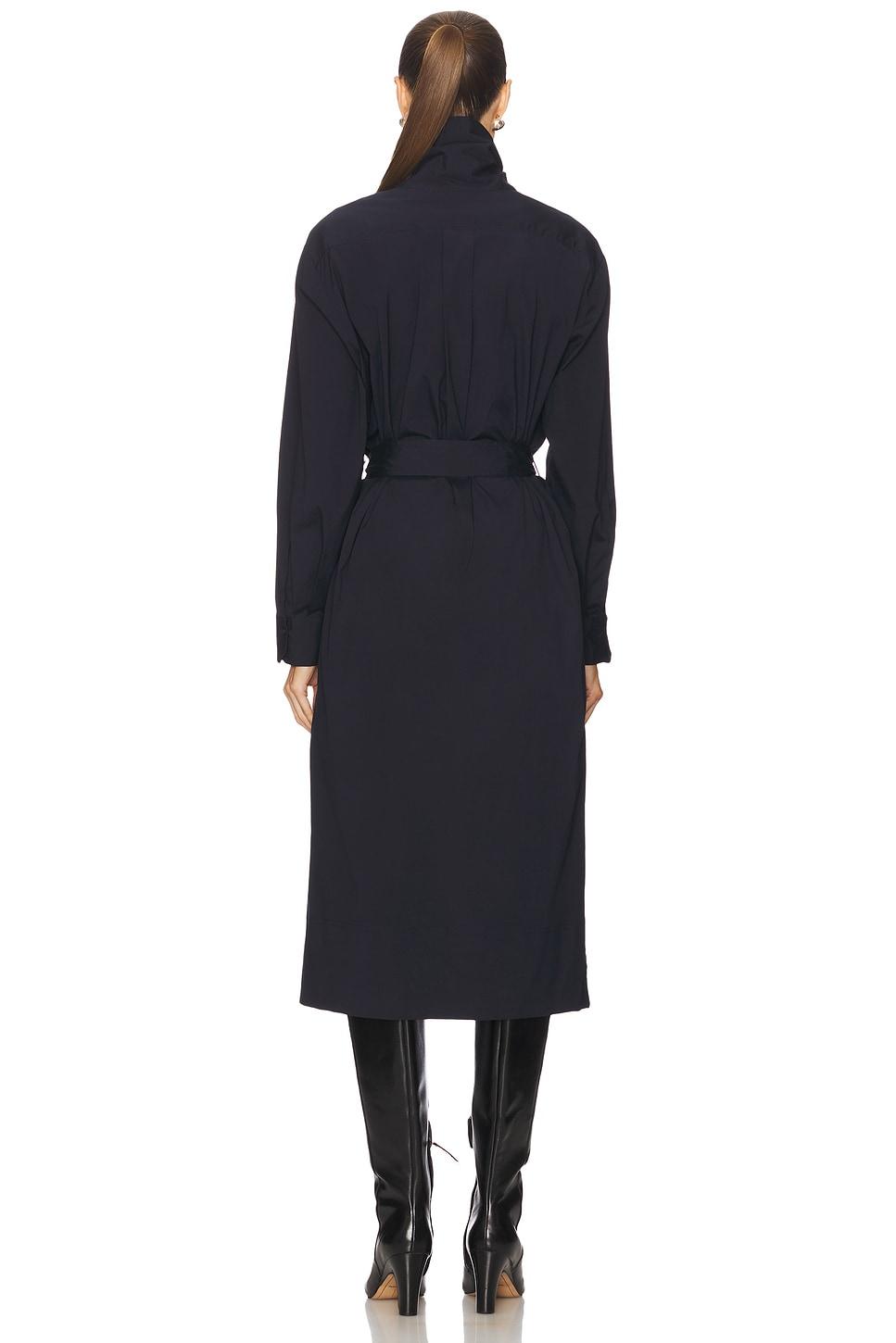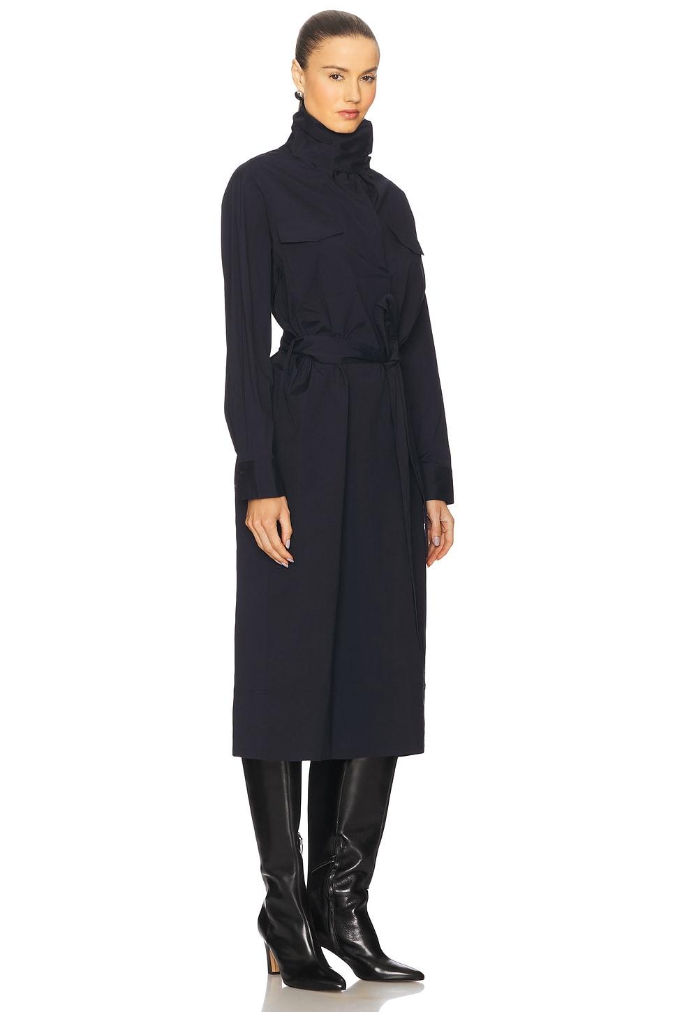 97% cotton, 3% elastane. Dry clean only. Unlined. Detachable waist tie closureAdjustable strap at ruched turtleneck with button closure. Front flap patch pockets. Side seam pockets and button cuffs. Midweight twill fabric. Made in Vietnam. Revolve Style No. ALX-WD588. Manufacturer Style No. 6DRES02818.