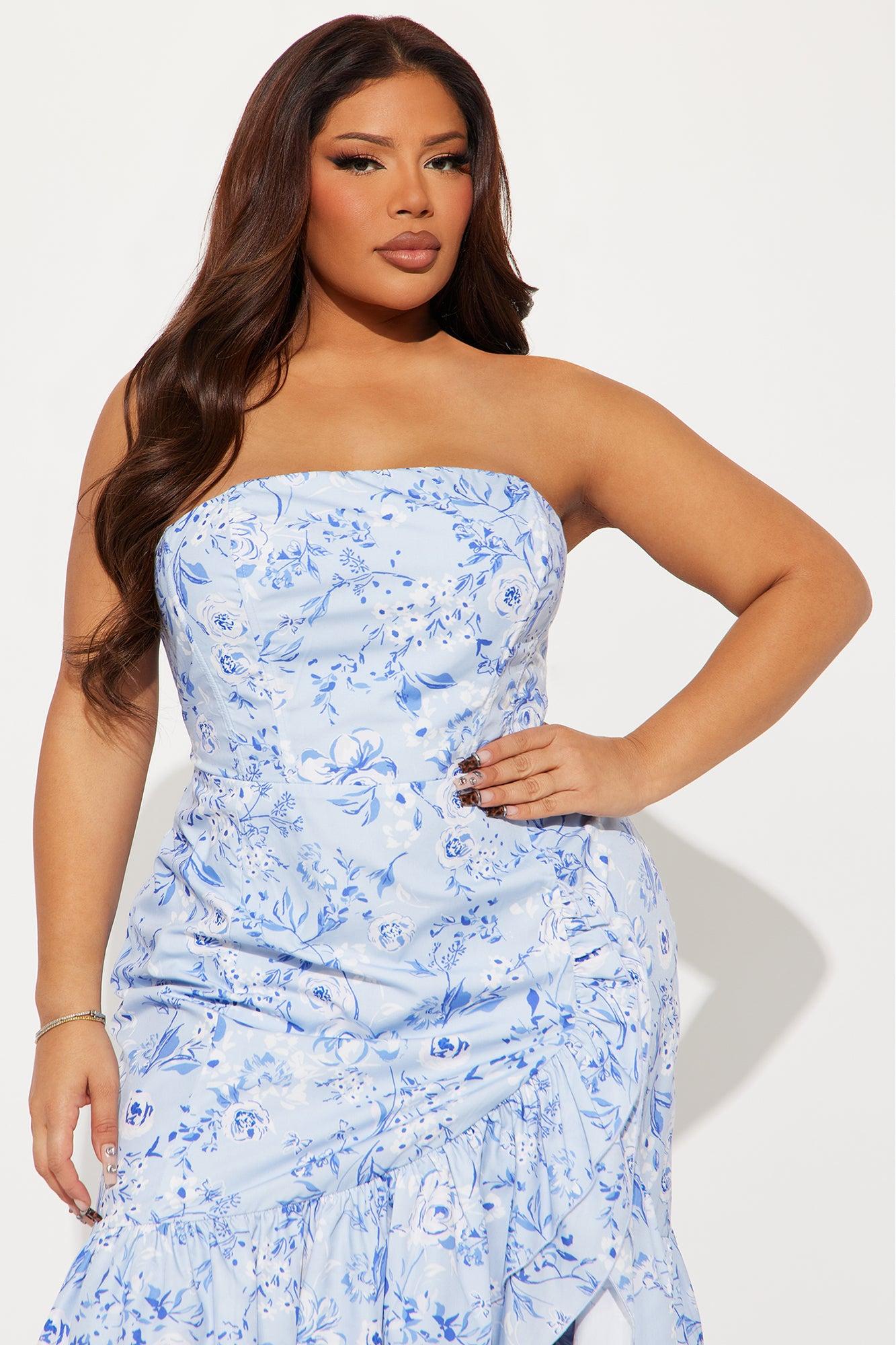 Available In Light Blue. Floral Maxi Dress Strapless Corset Waist Boning Slit Ruffle Hem Hidden Side Zipper Lined No Stretch Self : 95% Polyester , 5% Cotton Lining : 100% Polyester Imported