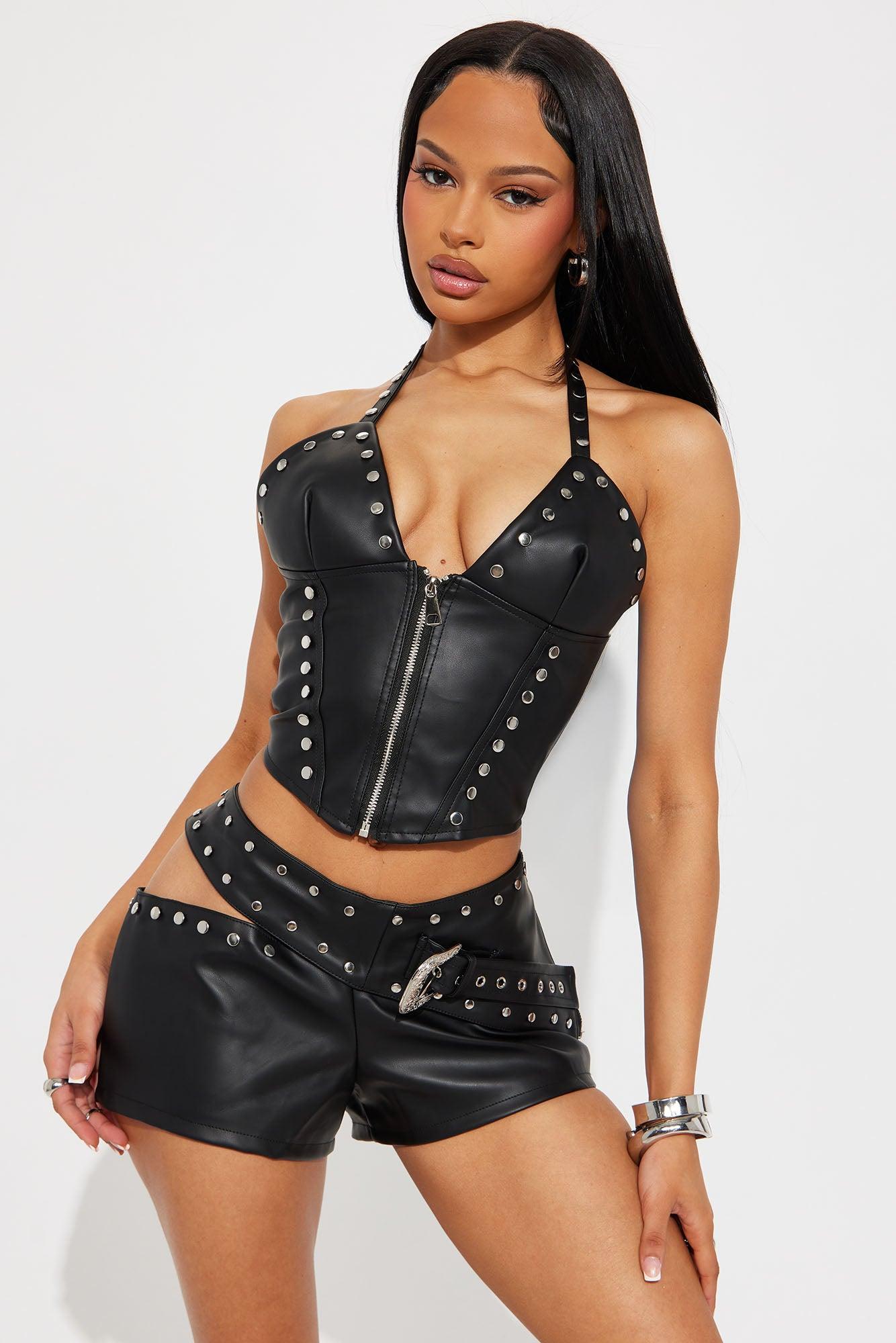 Available In Black. Halter Top And Cut Out Mini Shorts Non Stretch Shell: 60% Polyurethane 32% Polyester 8% Nylon Lining: 100% Polyester Imported