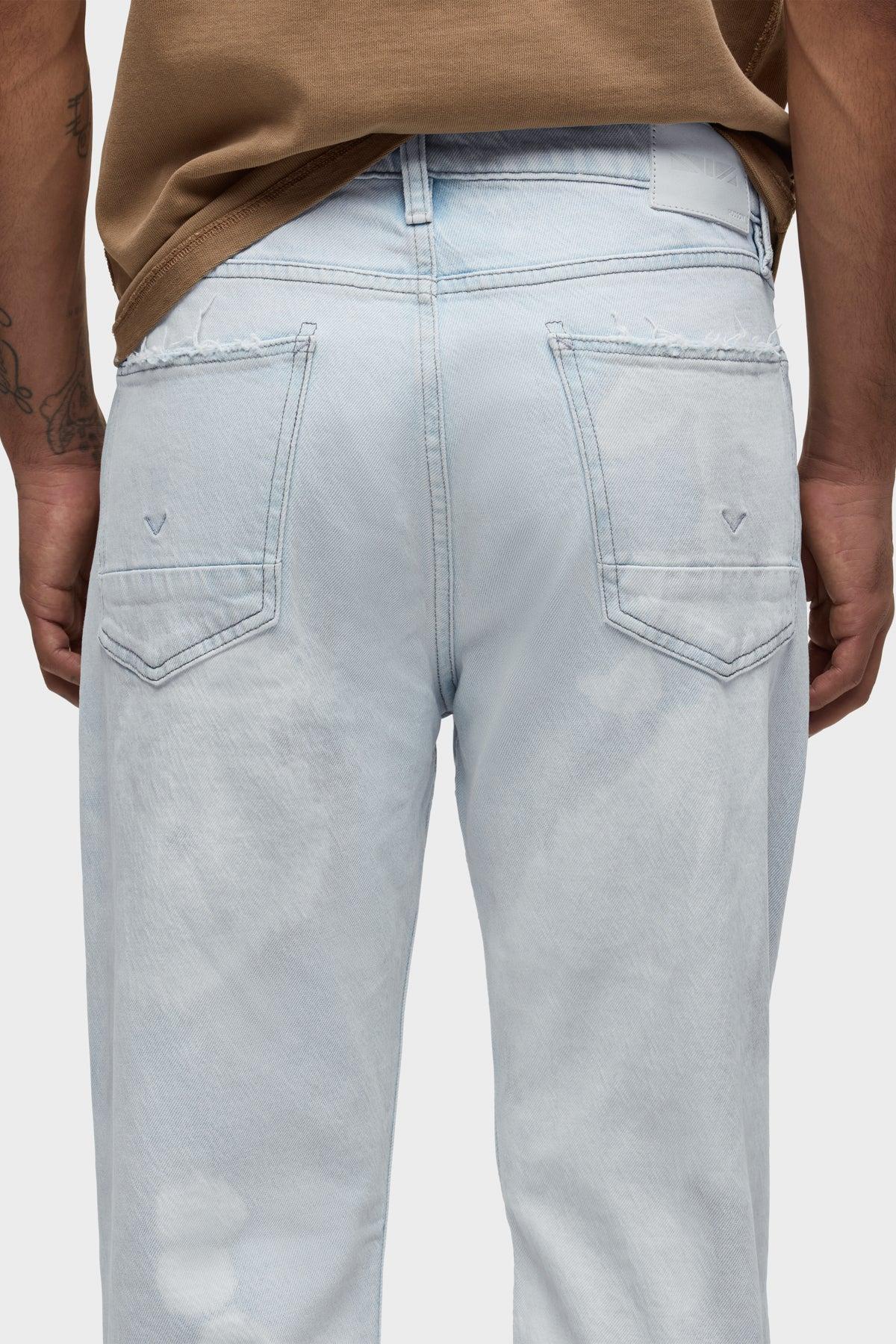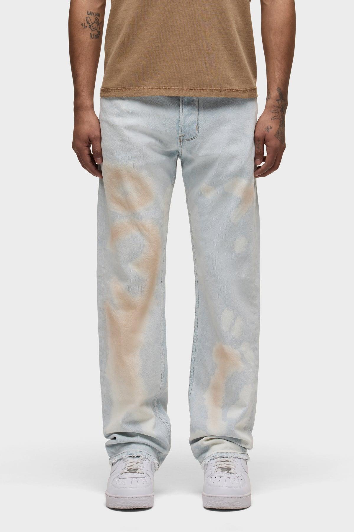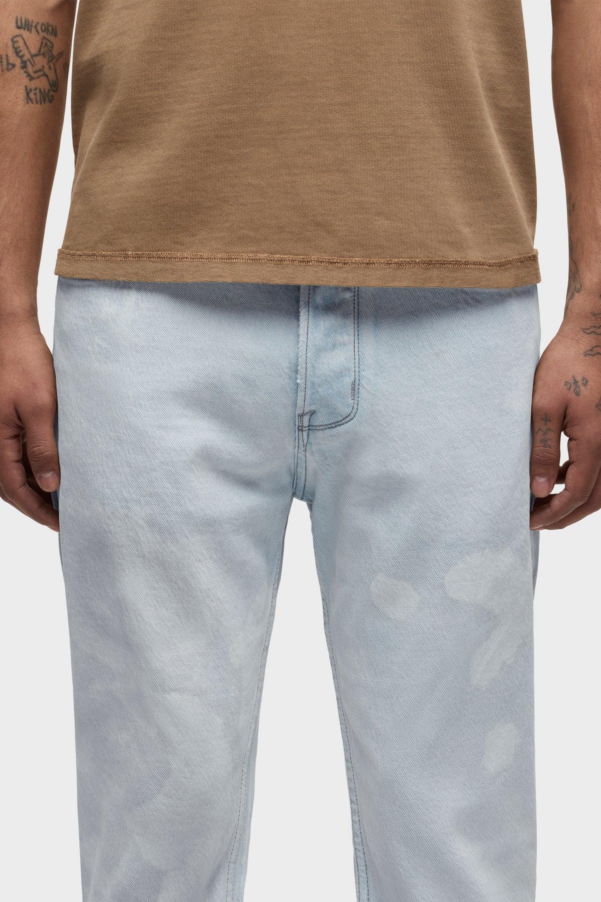 Description The Wes Classic Straight Jean is a mid-rise, easy straight leg that fits slim through the hip. Bleached Cloud is a super light indigo wash with an all-over uneven treatment made to look like dirty stains and spots. Each piece will vary slightly due to the novelty dyeing technique. This pair is made of rigid denim with classic five-pocket detailing. Product Details Front Rise: 11.25", Leg Opening: 16", Inseam: 32"Model Height 6’1"Model wearing size M/32Measurements based on size M/32 Fabric & Care Content: 97% Cotton, 2% Elasterell-P, 1% ElastaneMachine wash cold gentle cycleDo not bleachTumble dry lowMedium iron if needed