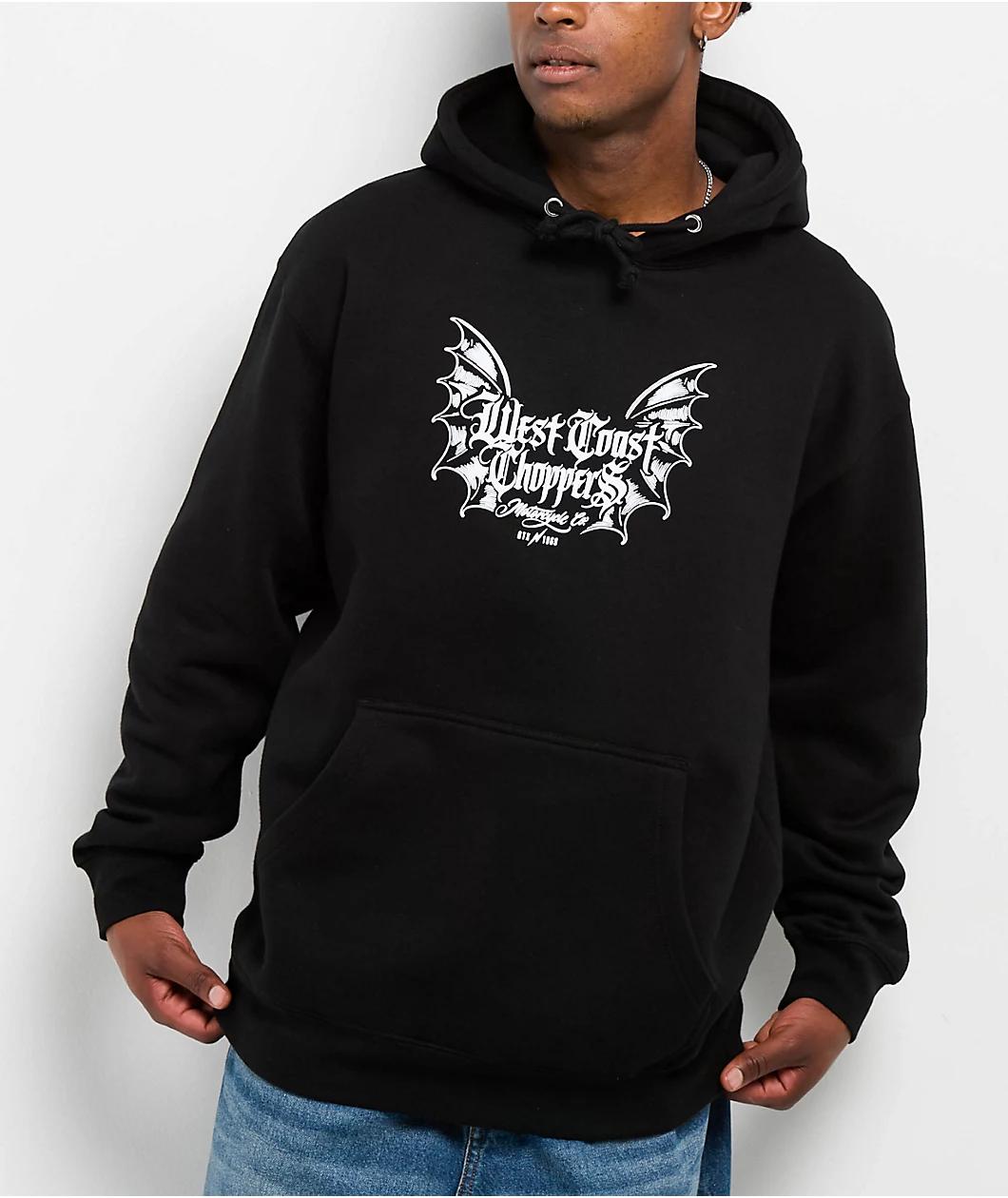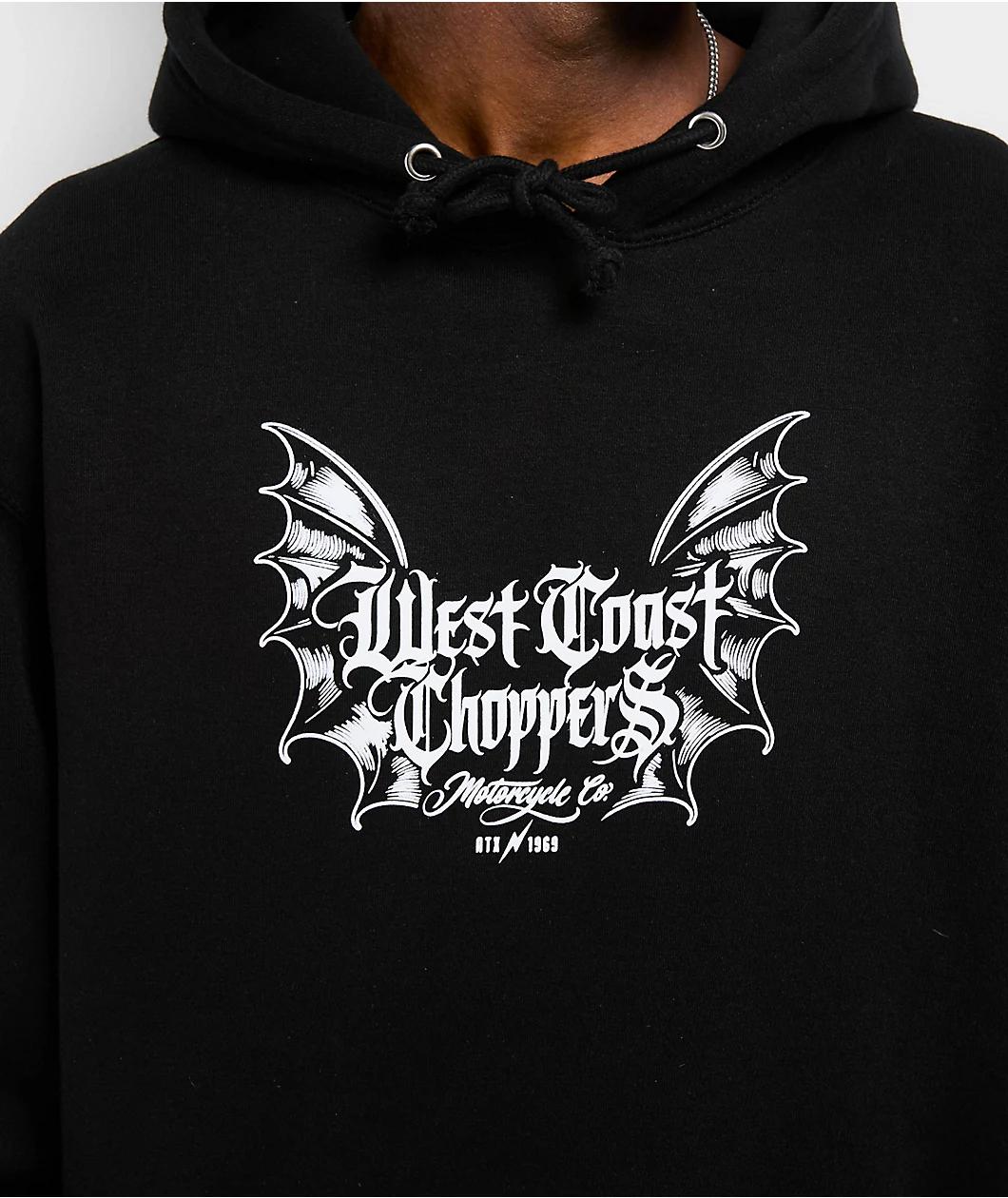 Founded in Long Beach, California, West Coast Choppers introduces the ATX 1969 hoodie in a black cotton blend with printed branding on the chest and back. Hosting an Old English font between pointy bat wings for a macabre vibe, the front of the sweat