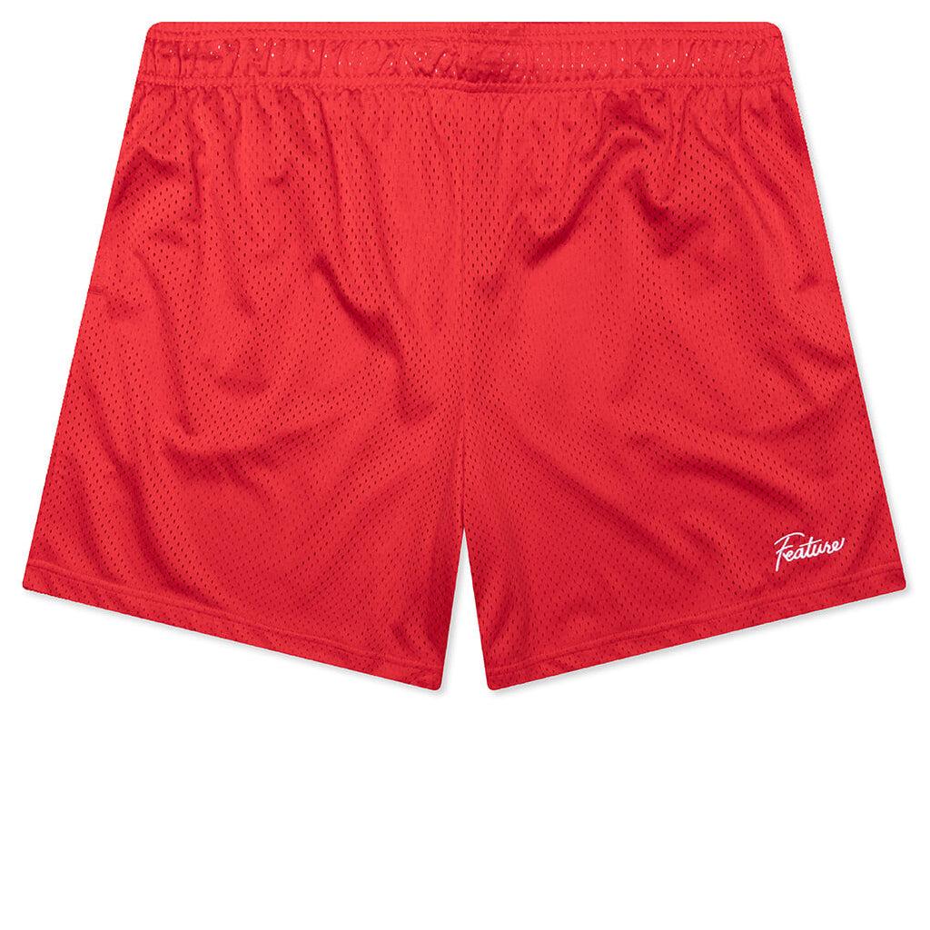 The FEATURE West Mesh Shorts in Crimson are designed with a standard fit, these shorts feature a breathable polyester and athletic mesh construction, complete with a soft viscose lining. Functional side seam pockets and a single rear welt pocket with a custom zipper pull offer practical storage, while the inner drawcord waistband allows for a personalized fit. A satin-stitched embroidered FEATURE logo on the left thigh adds a signature finish. Exclusive to FEATURE Standard fit Breathable polyester/athletic mesh construction Viscose lining Side seam pockets Single rear welt pocket Custom zipper pull Inner drawcord waistband Satin-stitched embroidered FEATURE logo Style No: FEAMSHORTS-RD2