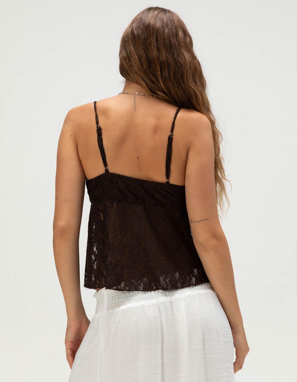 West Of Melrose Lace Flyaway Cami. Romantic and effortlessly feminine, the West of Melrose Lace Flyaway Cami is a dreamy addition to your wardrobe. Made from allover lace and mesh with delicate floral detailing, it features a lined bust for comfortable coverage while keeping the look light and airy. The sleeveless silhouette is finished with a flyaway open front that adds soft movement, along with a tie detail at the neckline for a touch of charm. Adjustable straps allow for a personalized fit, making it perfect for layering or wearing as a standout piece. 95% Polyester 5% Spandex. Hand wash. Imported.