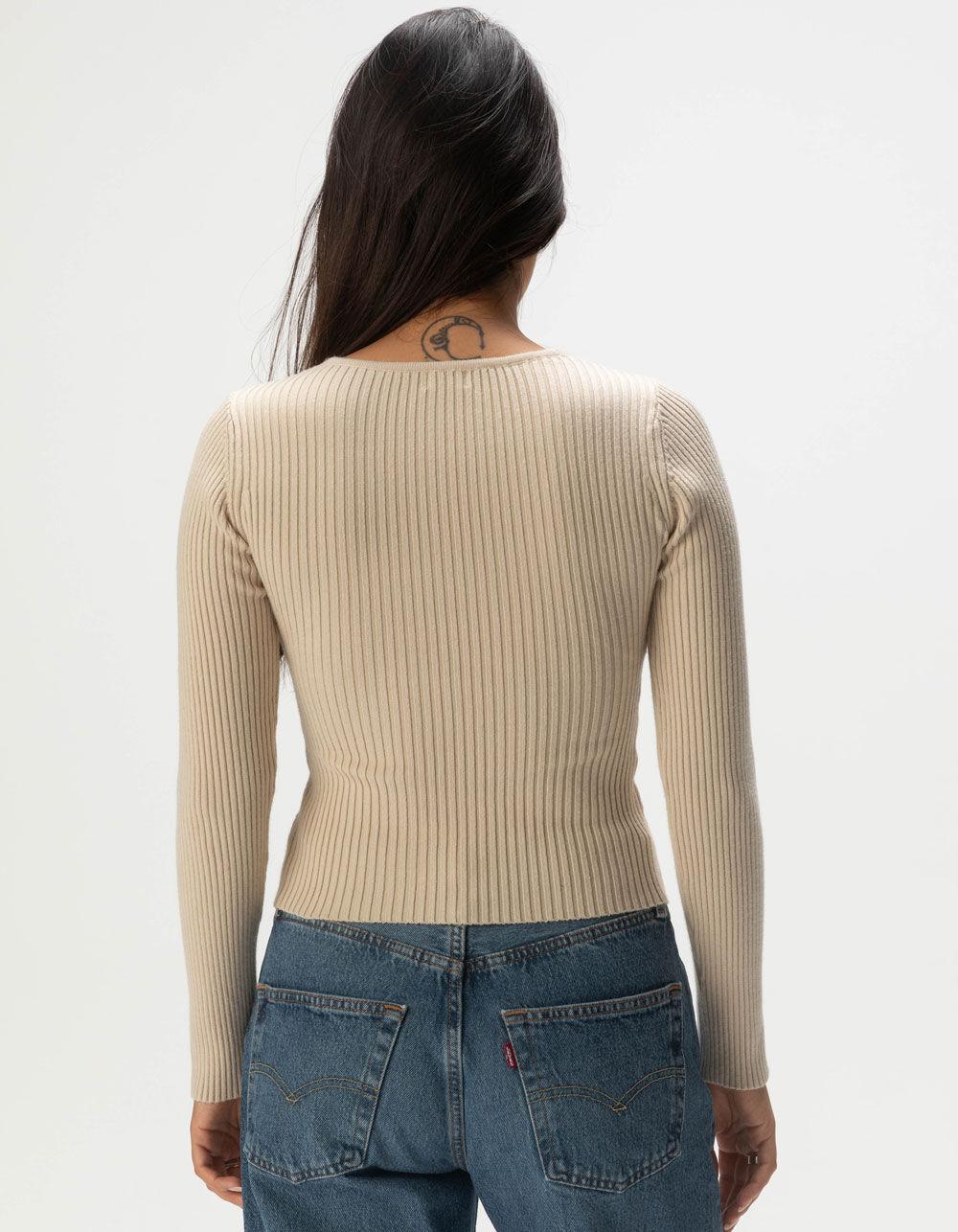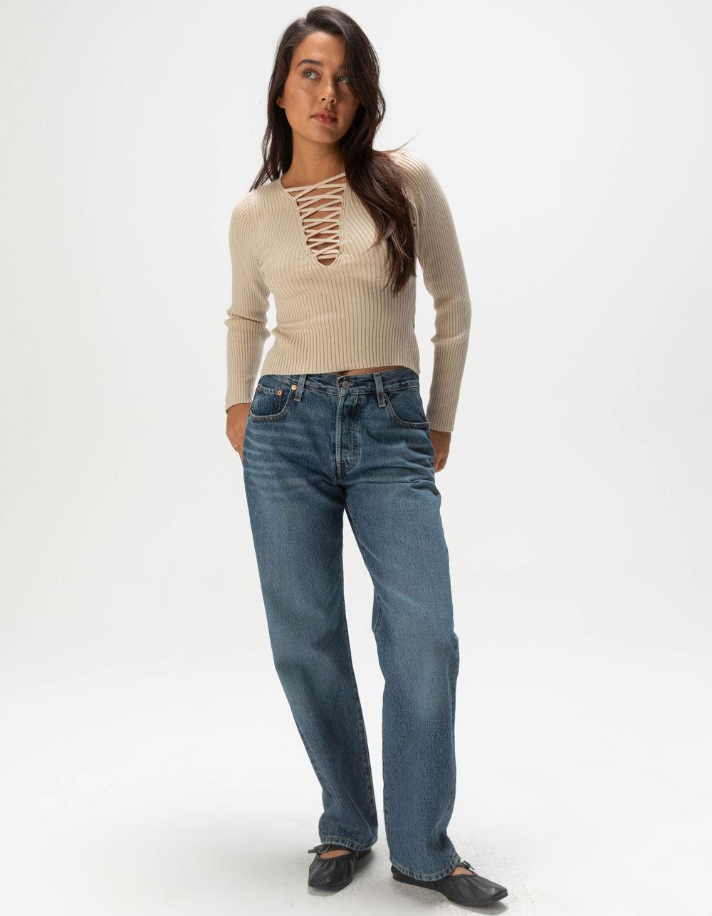 STONE. West Of Melrose Lace Up Long Sleeve Top. The Lace Up Long Sleeve Top features a sleek, form-fitting design with a stylish lace-up V-neckline for a modern twist. Made from soft, stretchy ribbed fabric, this top offers both comfort and sophistication. 50% Viscose, 40% Nylon, 10% Polyester. Hand wash. Imported.