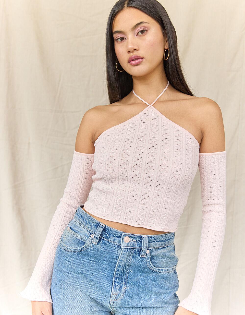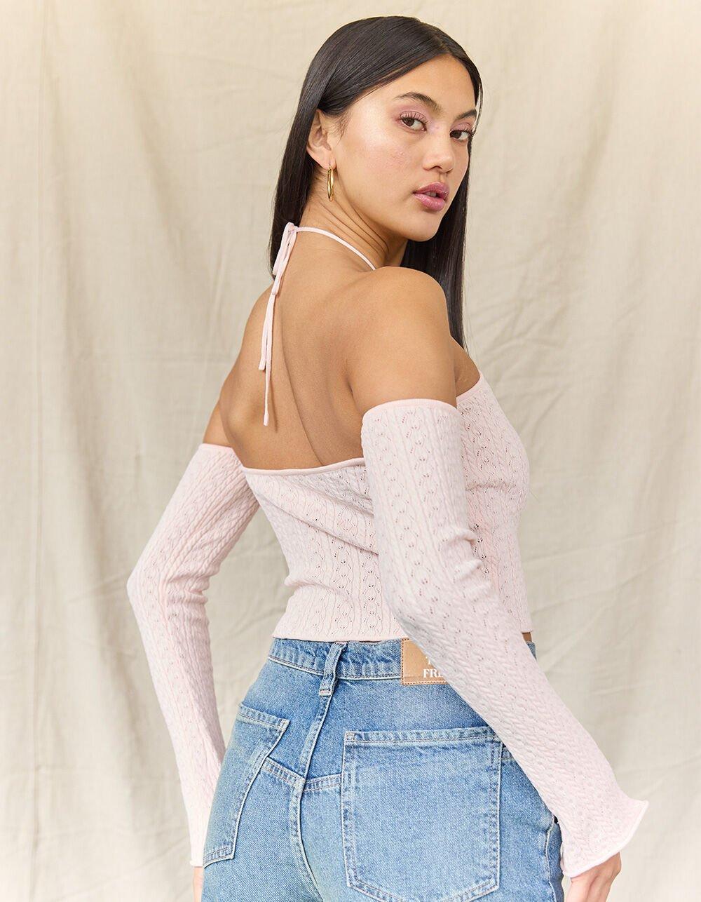 WEST OF MELROSE Long Sleeve Off The Shoulder Y Neck Open Knit Womens Sweater - PINK