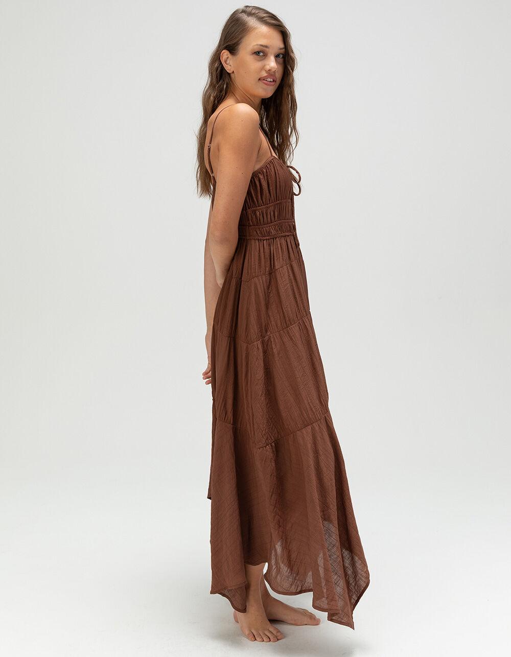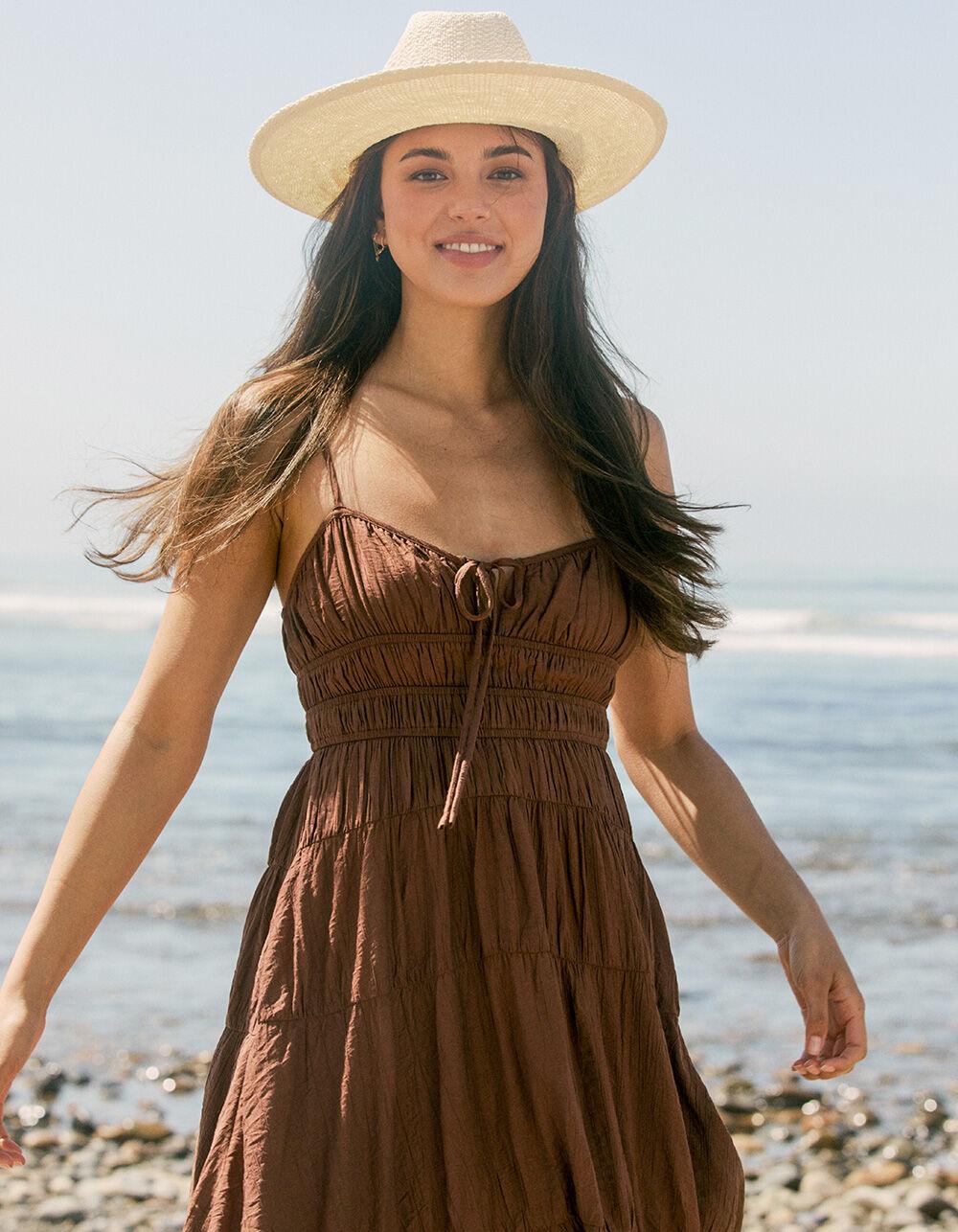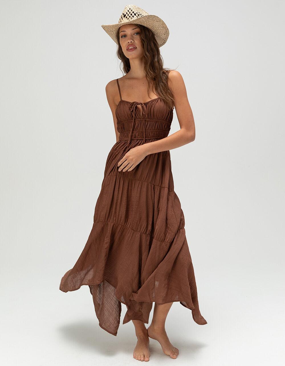 BROWN. West Of Melrose Tiered Maxi Dress. Effortlessly flowy and full of charm, the West Of Melrose Tiered Maxi Dress is your new go-to for sun-soaked days and dreamy evenings. Made from textured fabric, this sleeveless dress features a flattering ruched bodice and adjustable spaghetti straps for a perfect fit. A notched neckline with a dainty tie closure adds a sweet, feminine touch, while the tiered skirt brings movement and grace to every step. Fully lined for comfort and coverage, this maxi dress is perfect for everything from brunch dates to beach strolls. 75% Nylon 25% Rayon. Lining: 100% Rayon. Machine wash. Imported.