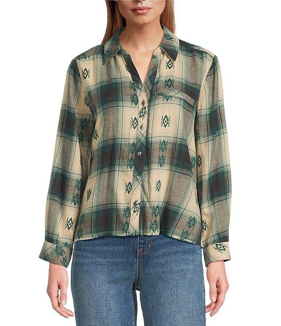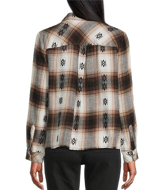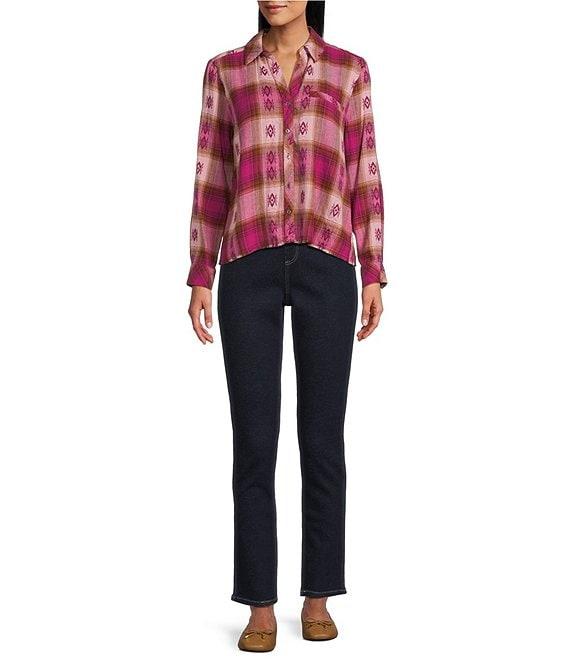 Westbound Jacquard Flannel Long Sleeve Y-Neck Button Front Top