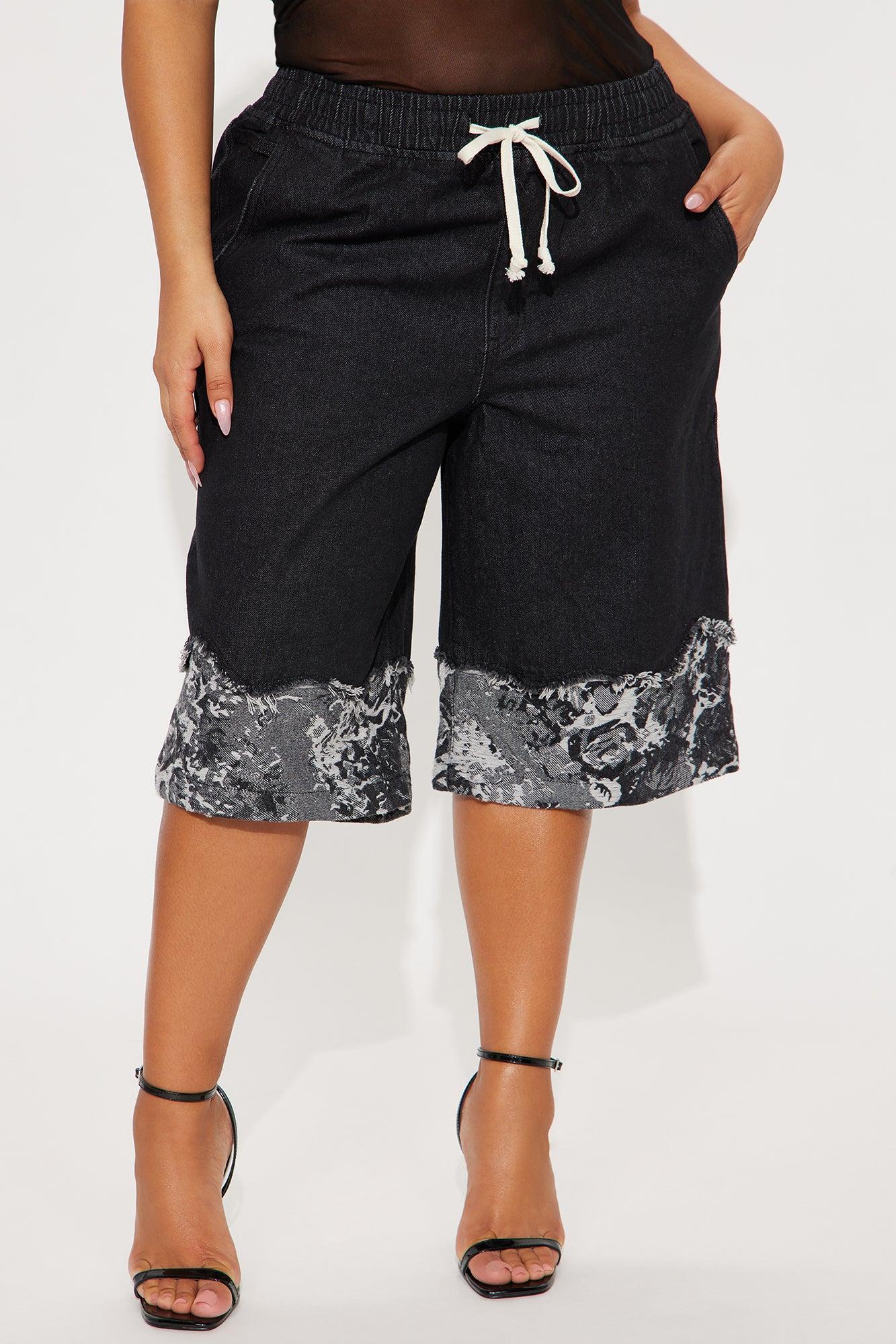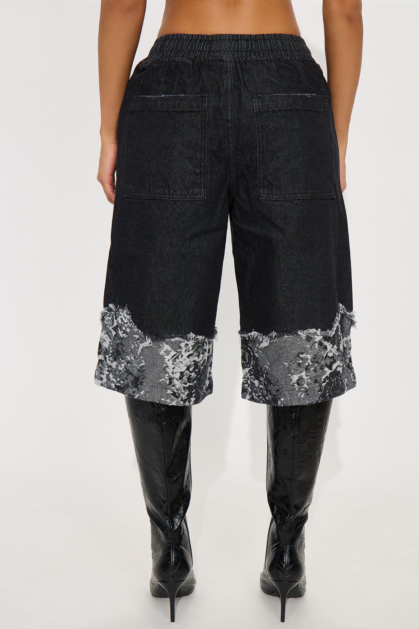 Available In Black Wash. Denim Jort Non-Stretch 5 Pocket Waist Tie Elastic Waistband Jacquard Trim Hem 14" Inseam 12.5" Rise Disclaimer: Due To The Specialized Distressing & Wash Process, Each Garment Is Unique. To Keep The Aesthetic Of This Garment, Please Follow The Care Instructions Carefully 100% Cotton Imported