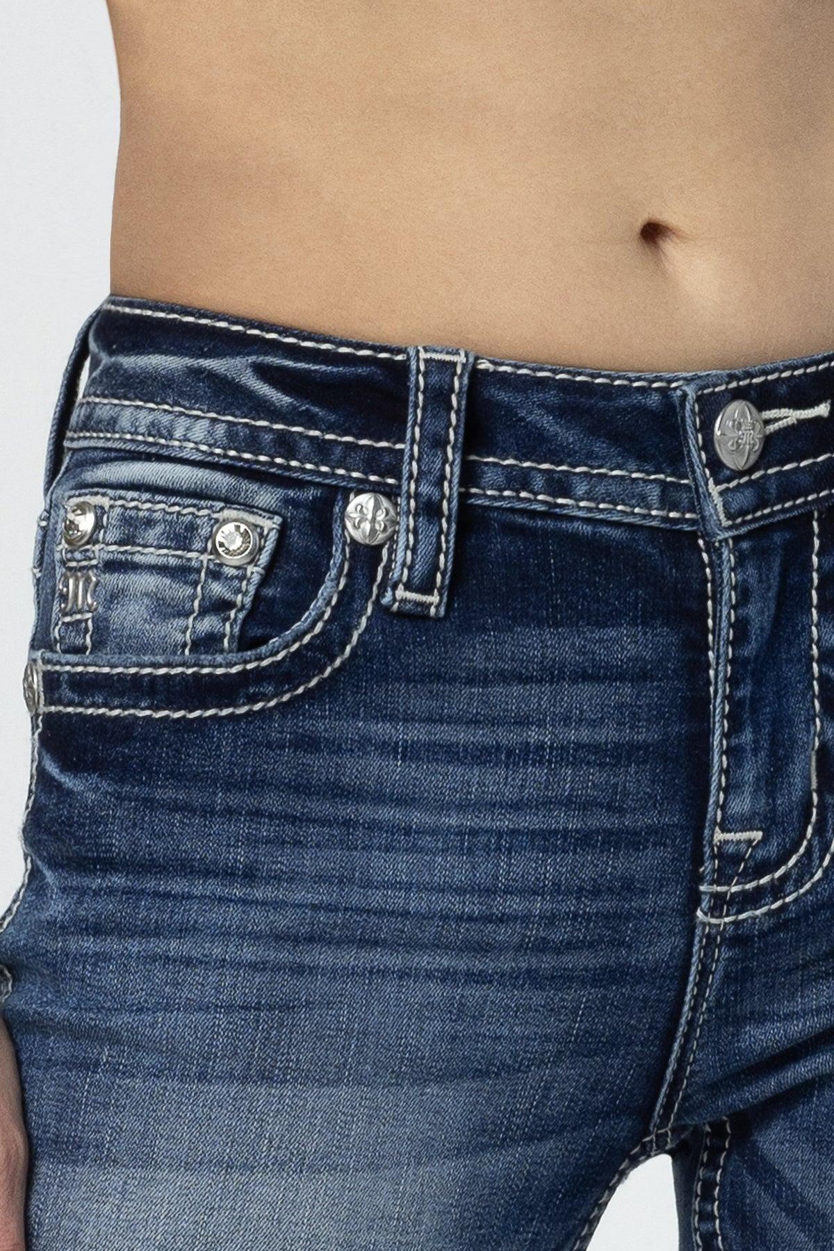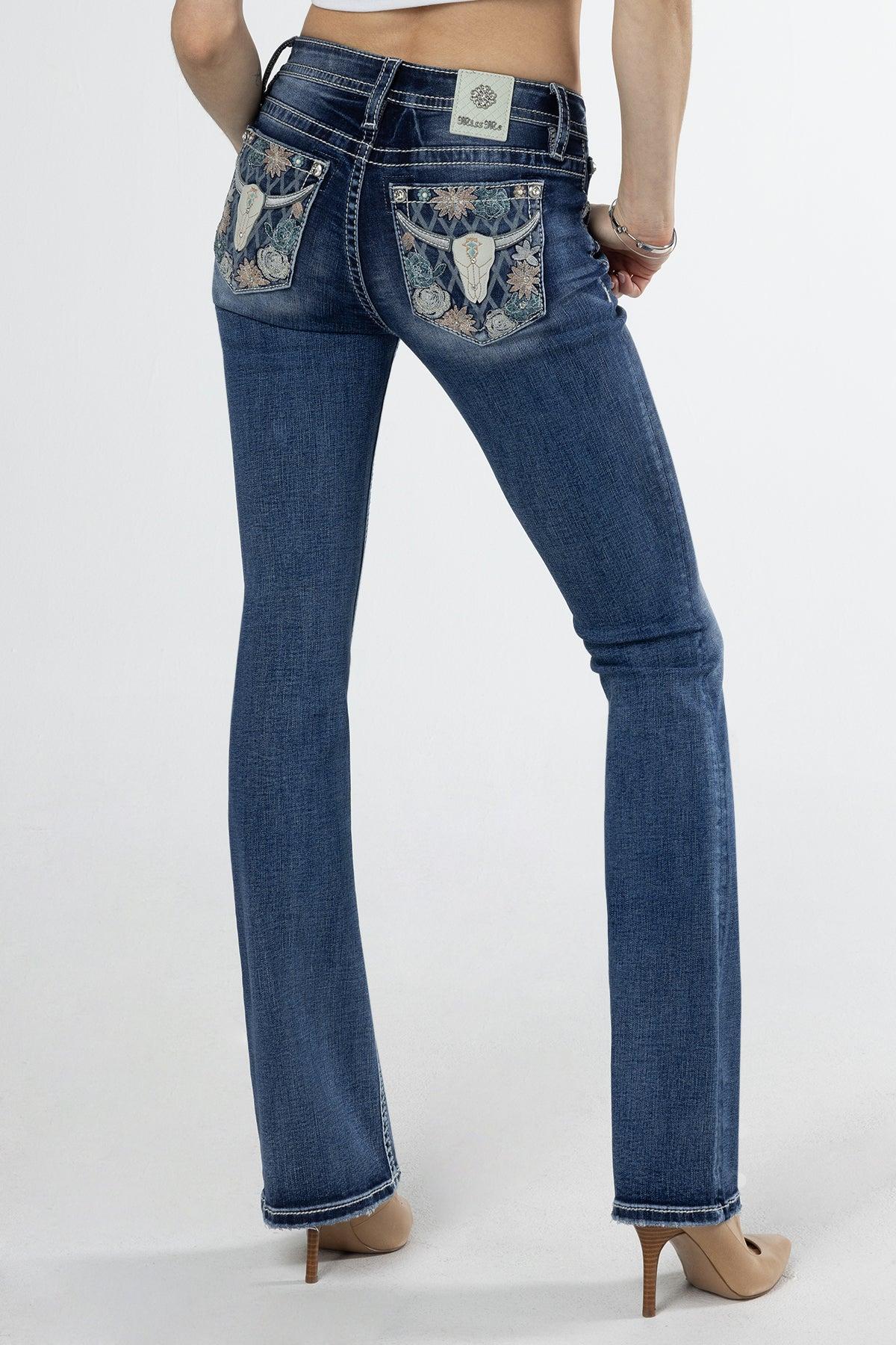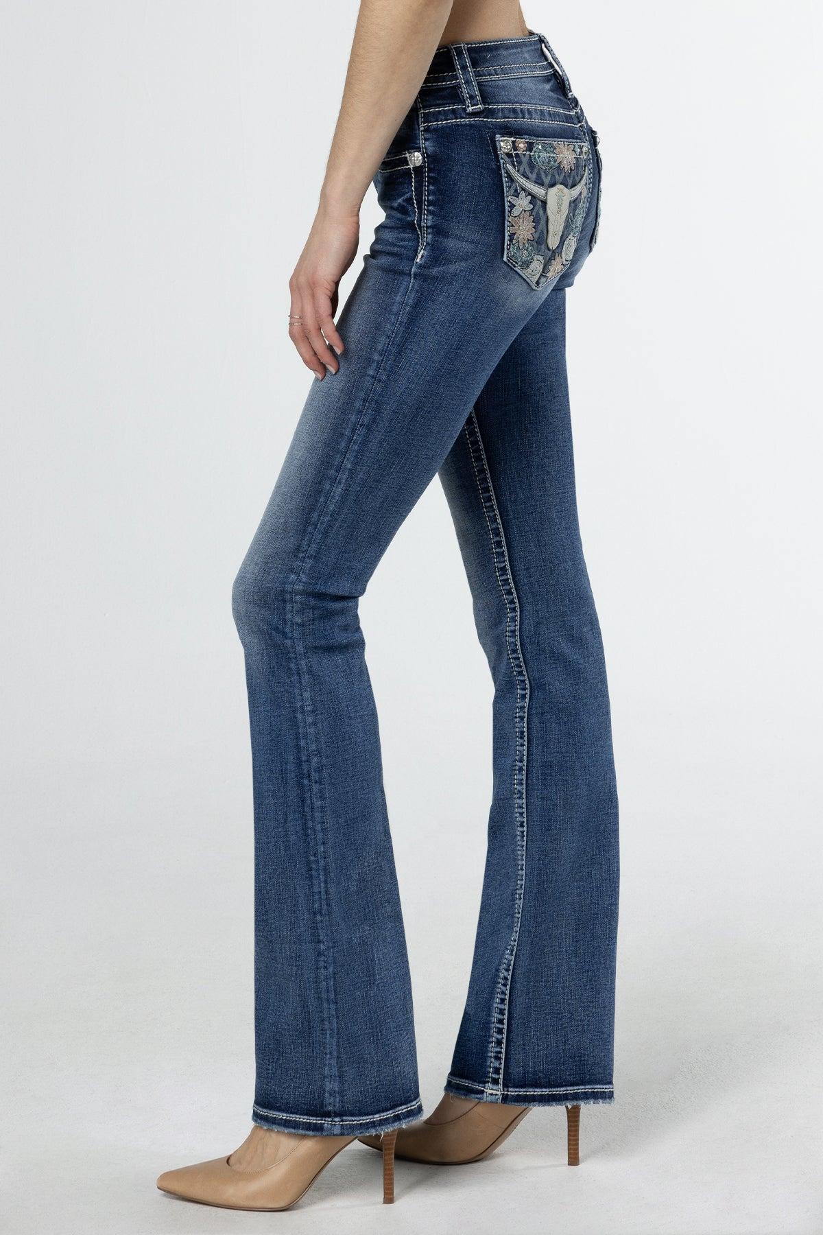 Mid-rise, medium-wash bootcut jeans- Leather appliqué long-horn design with pink, teal, and white embroidered flowers- Rhinestone rivets and faux white pearls with clear sequins- Embossed white quilted leather brand patch with metallic silver Miss Me hardware- 5-pocket design- Light fading Model is wearing size: 25 Model Measurements:Height: 5'10"Bust: 32"Waist: 25.5"Hips: 36" Fabric Content: 66% Cotton, 14% Lyocell, 18% Polyester, 2% Elastane Care: Gentle machine wash inside-out with like colors in cold water. Tumble dry low. Style No. M9259B-M911