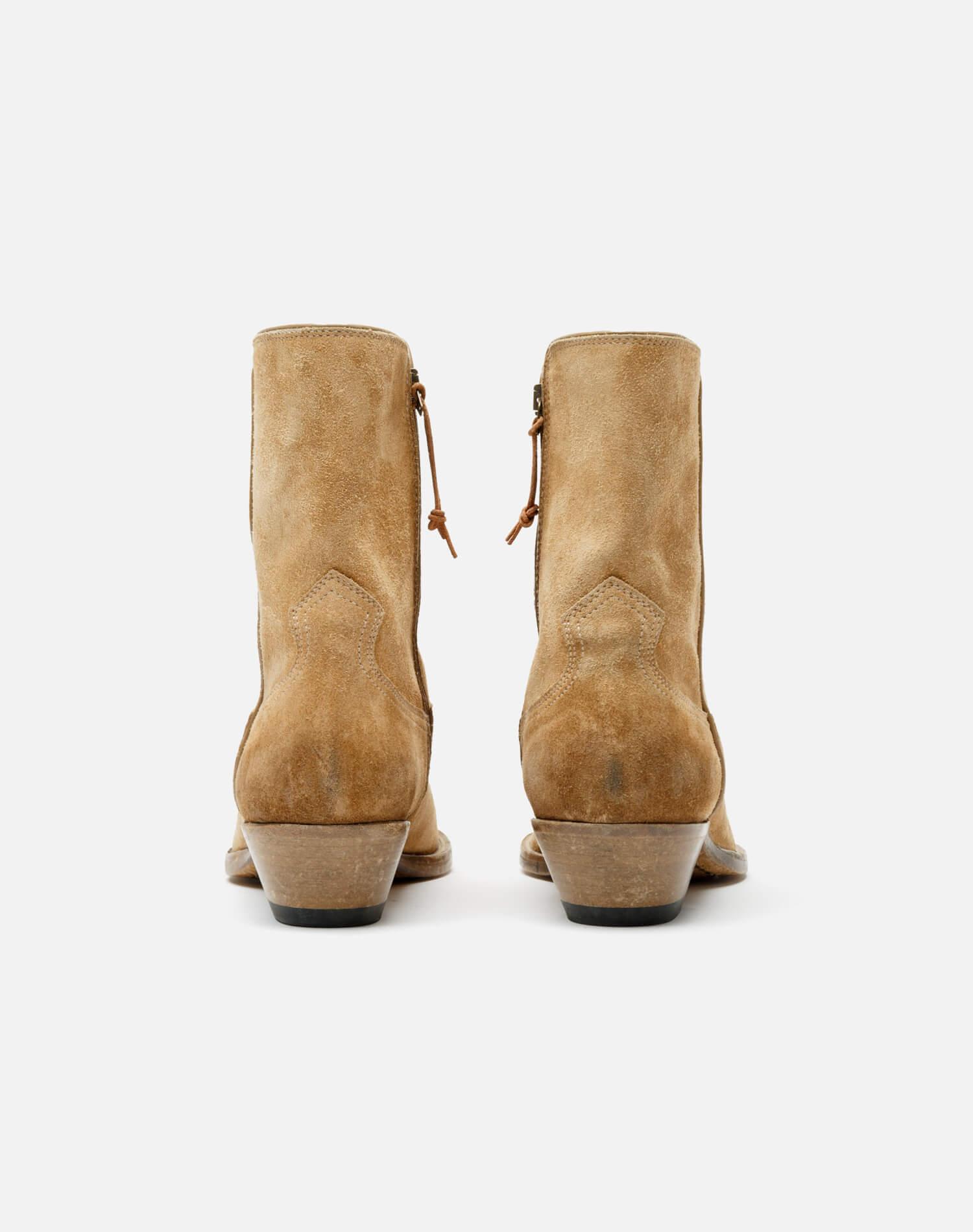 The Western Boot is our streamlined iteration of the iconic cowgirl silhouette, available in distressed tan suede and black leather. Features classic stitching at toe box, a slight heel, and zippers with pulls up the shaft. Handmade in Italy by expert artisans.