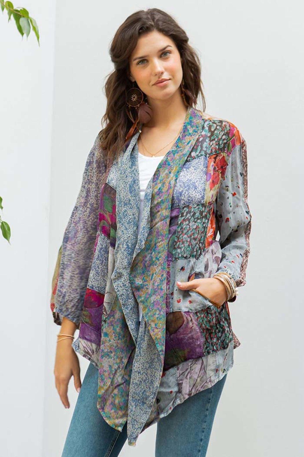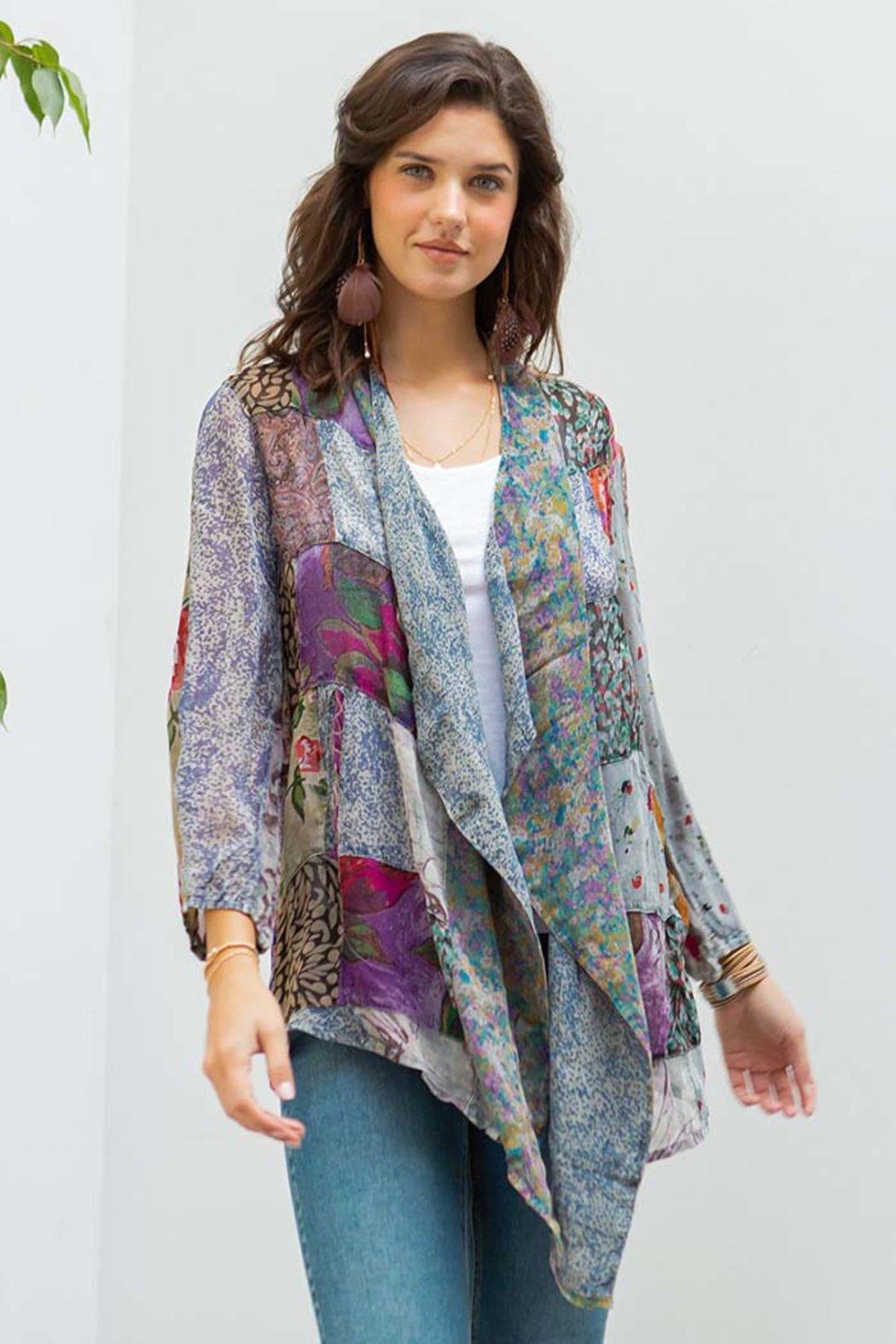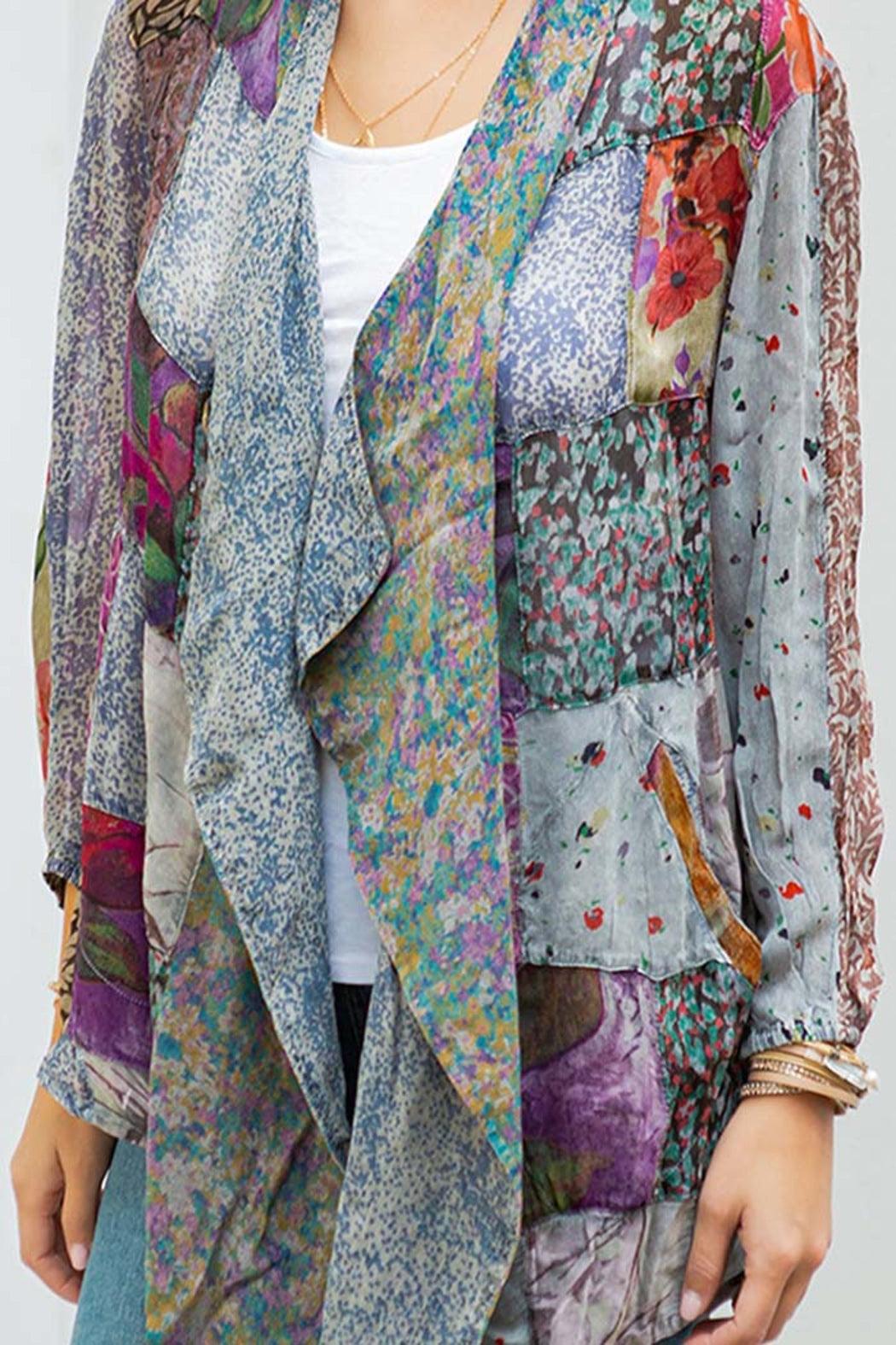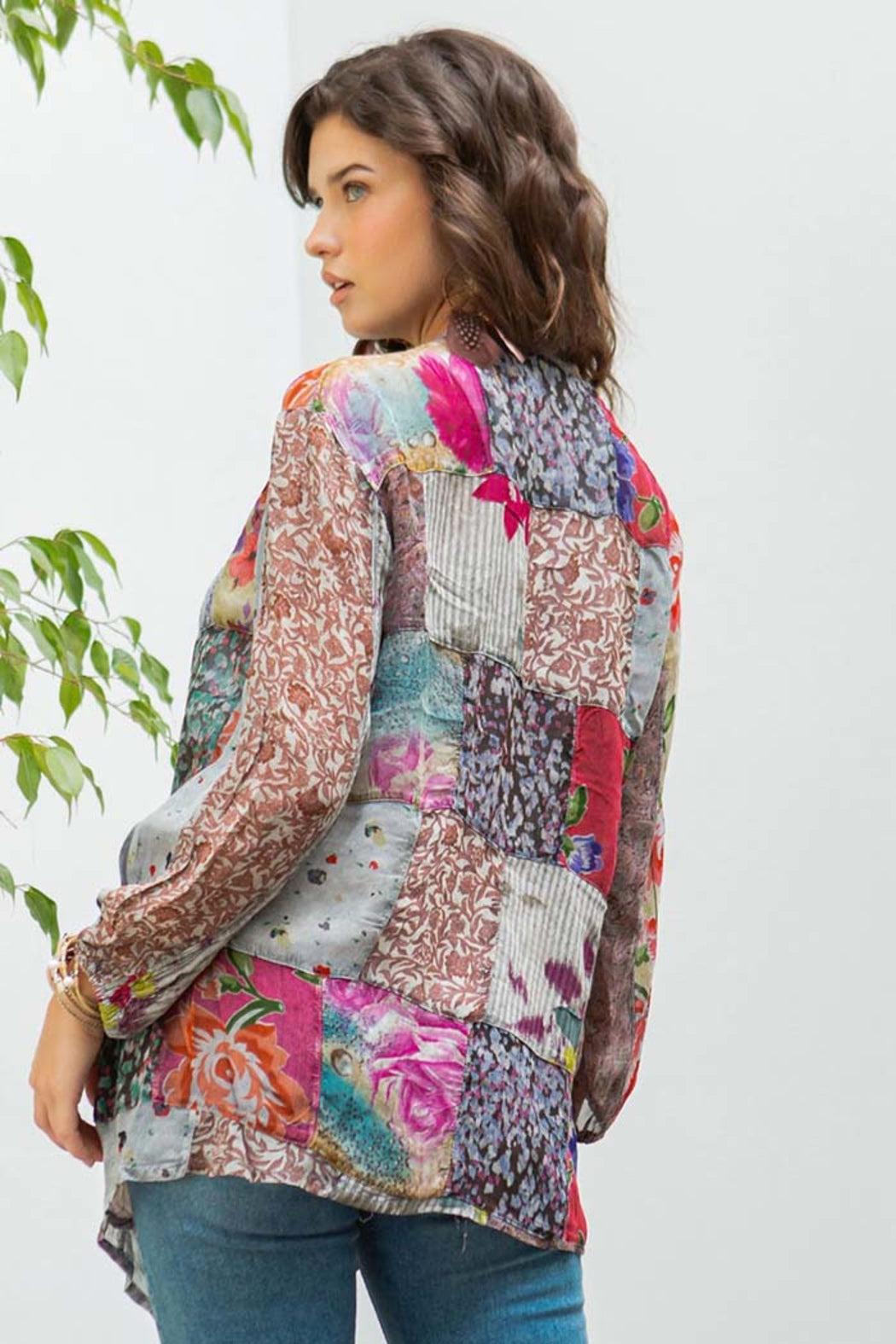 Western-inspired kimono cardigan shirt with overdyed mix-match patches in georgette prints.