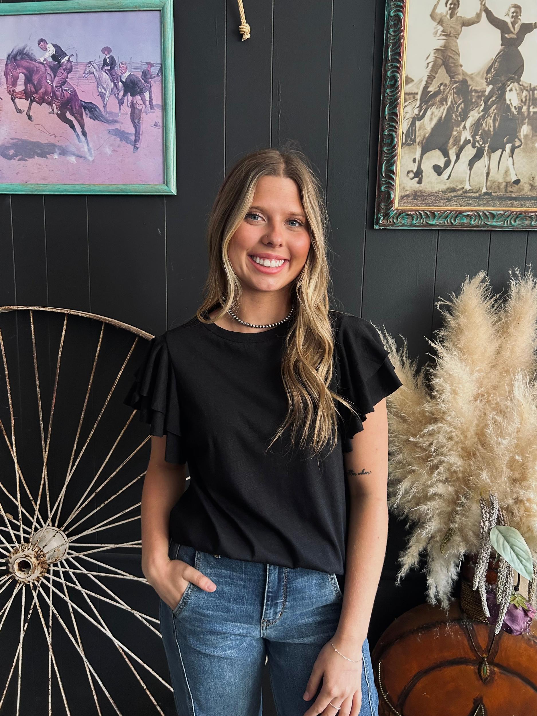 Western Layered Ruffle Short Sleeve Round Neck Top-3 Colors I Gussied Up Online Boutique Add some flair to your wardrobe with this Western Layered Ruffle Top. Featuring a whimsical layered and ruffled design, this short sleeve top will make any outfit pop. The round neck adds a touch of class, making it perfect for any occasion. Available in 3 colors. Upgrade your style game now!