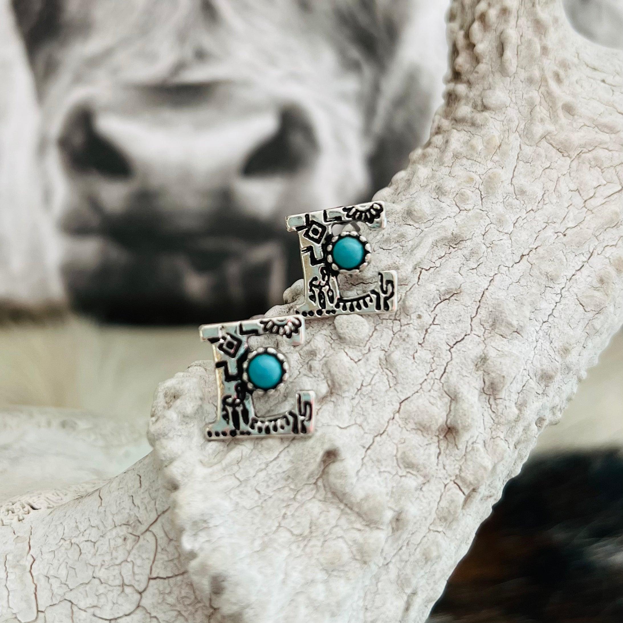 Personalize your look with letter earrings! One of the latest western fashion trends. These high polished western style with aztec and flower textured monogram alphabet pendants are literally made for YOU! The turquoise colored stone on each one is the finishing touch! Stud earrings